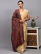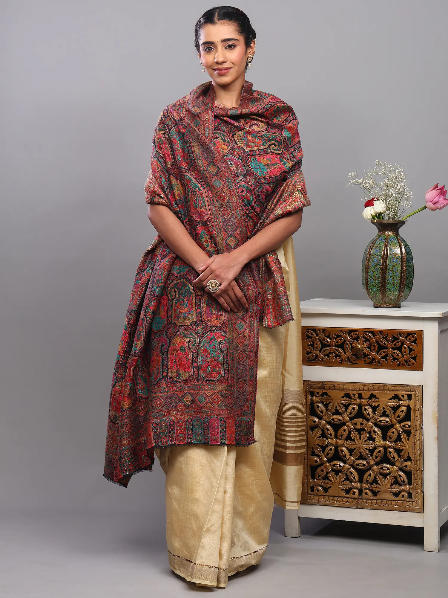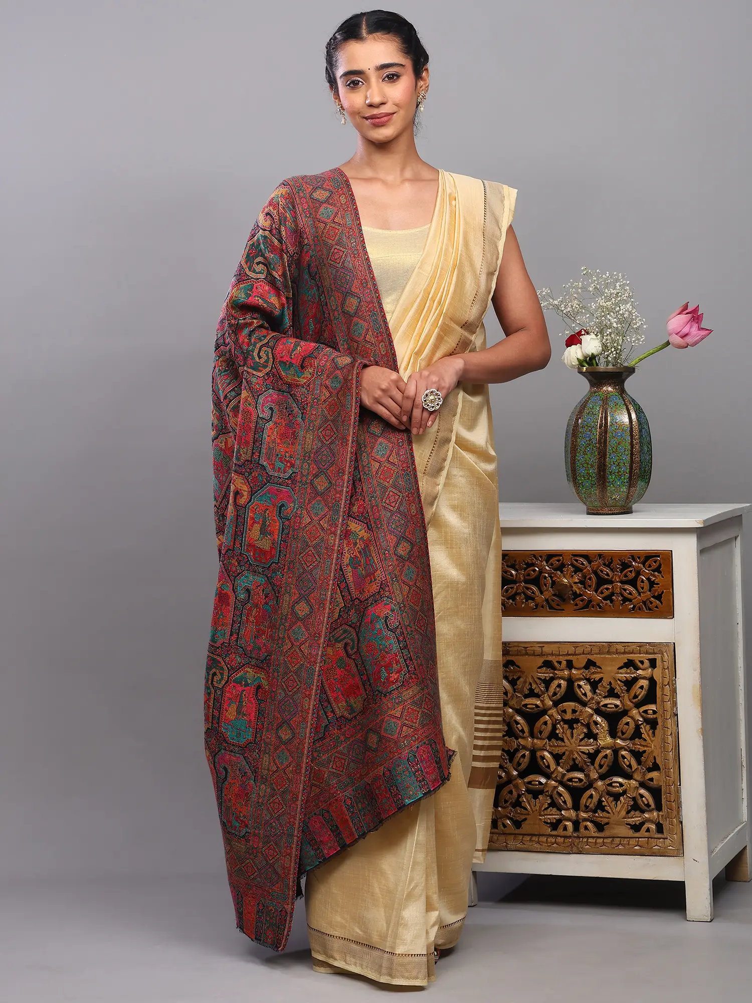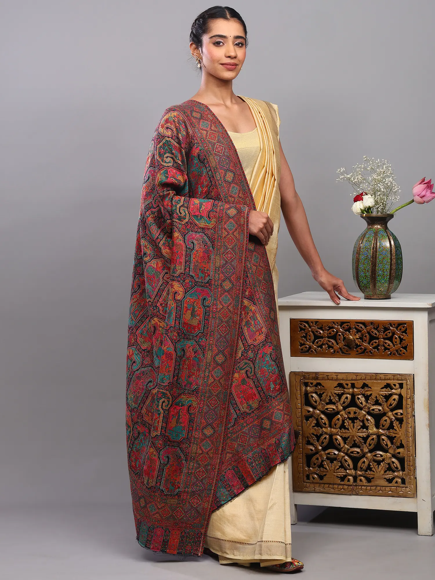Clay Woolen Jamawar Shawl with Woven Paisley and Flower Motif