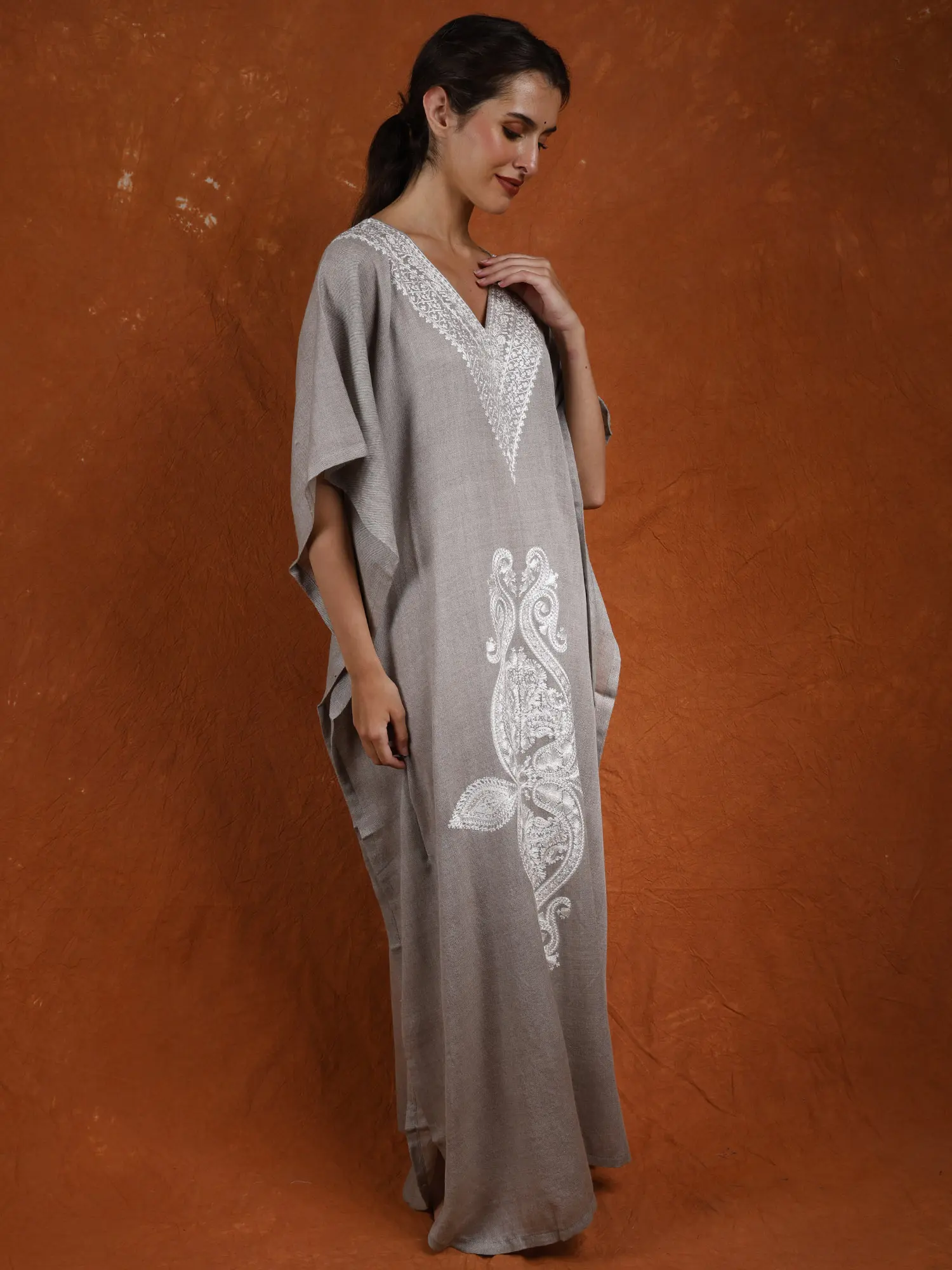 Acquire unparalleled night comfort with this Pure Wool Long Kaftan from Kashmir adorned with Tilla Embroidered Paisleys. Crafted from luxurious pure wool, it envelops you in warmth and softness, providing the ultimate cocoon of comfort for restful nights. The intricate Tilla embroidered paisleys add a touch of elegance and sophistication, elevating the kaftan into stylish sleepwear essential.