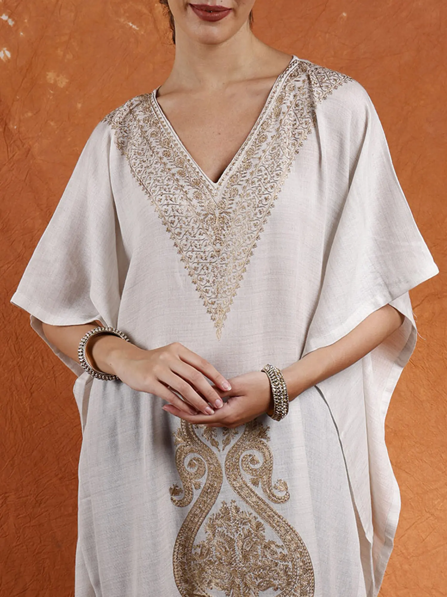 Acquire unparalleled night comfort with this Pure Wool Long Kaftan from Kashmir adorned with Tilla Embroidered Paisleys. Crafted from luxurious pure wool, it envelops you in warmth and softness, providing the ultimate cocoon of comfort for restful nights. The intricate Tilla embroidered paisleys add a touch of elegance and sophistication, elevating the kaftan into stylish sleepwear essential.