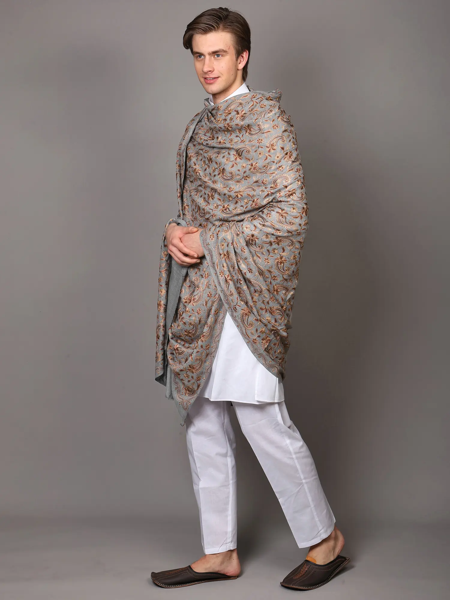 This shawl is more than just an accessory; it's a statement of refined taste. Its generous dimensions ensure it can be worn in various elegant styles, whether draped casually over the shoulders or wrapped more formally. It is an ideal complement to traditional Indian attire like a kurta pajama, or it can be used to elevate a Western outfit, adding a touch of cultural richness and artisanal luxury. Imagine this shawl adding a distinguished finish to your look for weddings, festivals, cultural events, or even a sophisticated evening out.