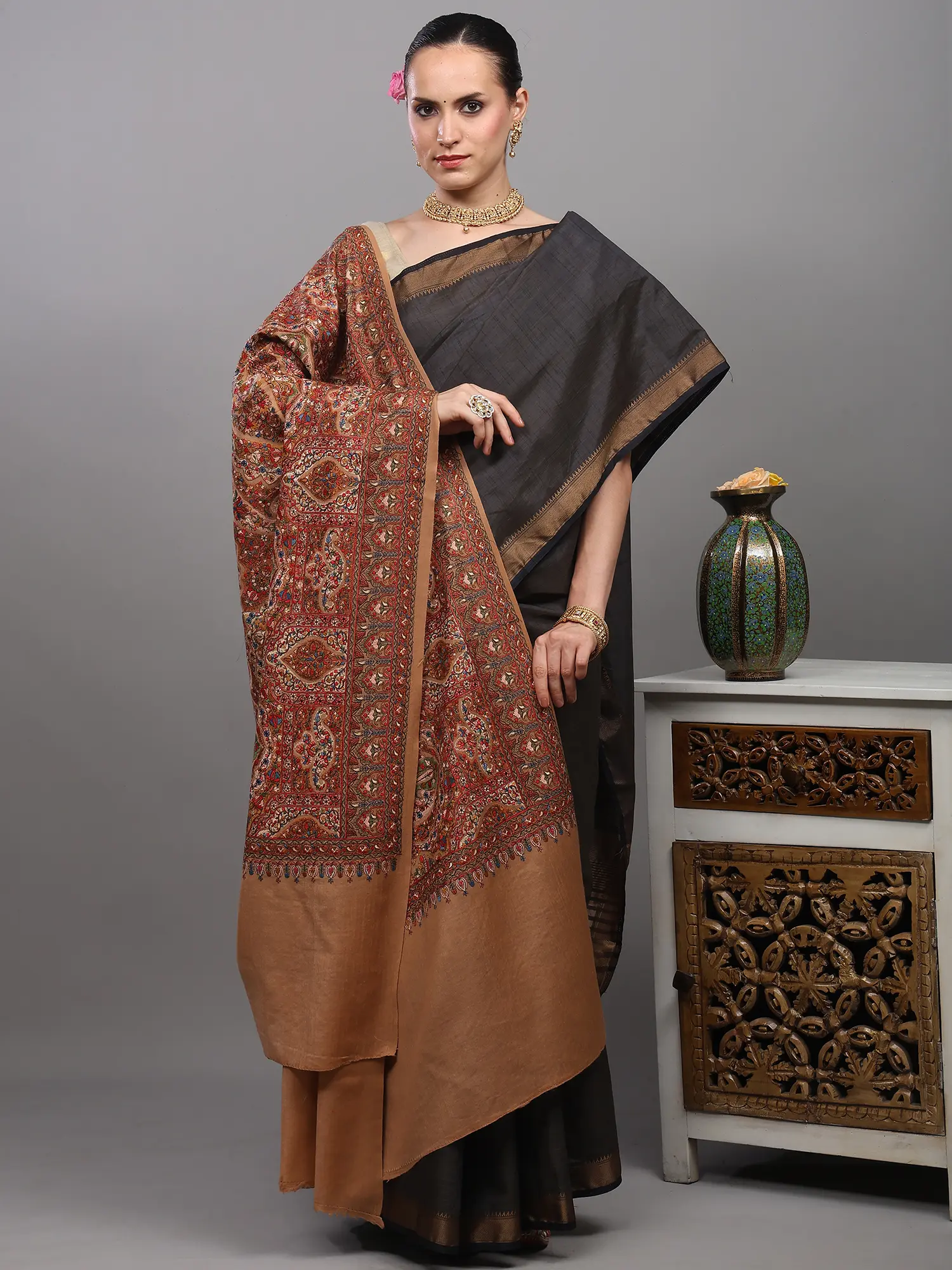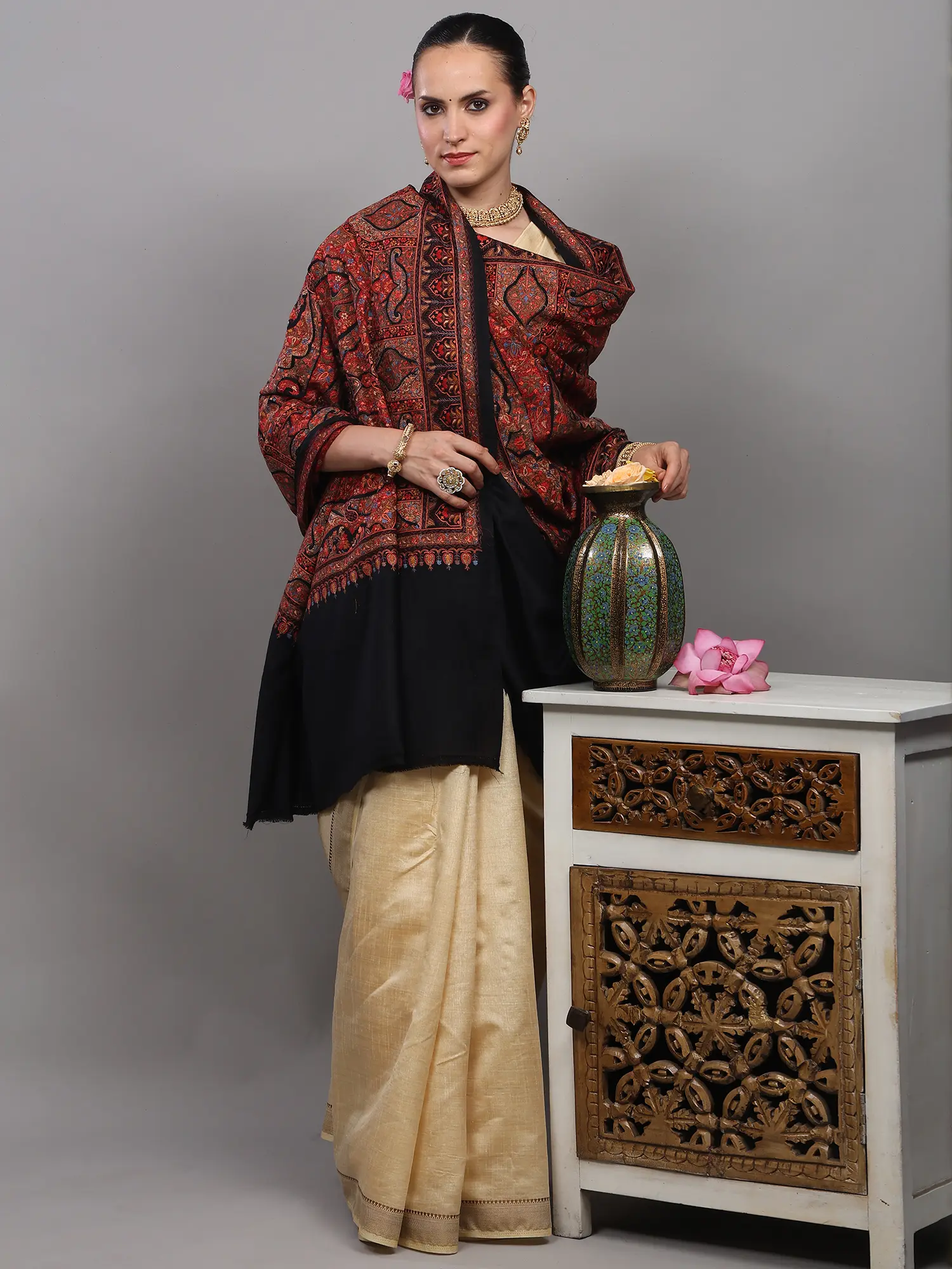 Aari Embroidered Wool Shawl from Amritsar with Paisleys Border