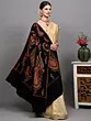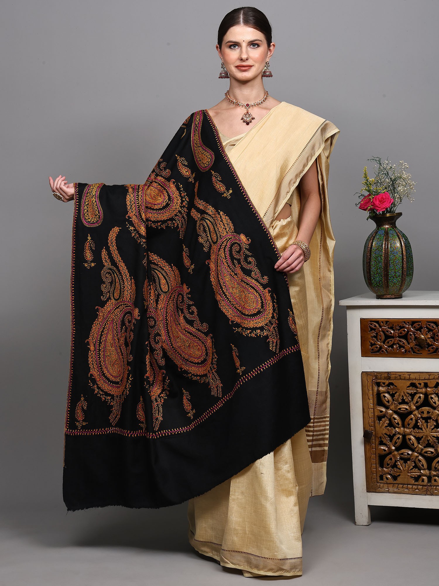 The shawl is adorned with a breathtaking pattern of "giant paisleys," a motif deeply rooted in the cultural heritage of the region. Each paisley, rendered in luminous gold and complementary shades, is a testament to the skill and dedication of the artisans. The embroidery is so fine and detailed that it appears almost painted onto the soft wool. The swirling curves and delicate inner patterns of the paisleys create a mesmerizing visual flow, drawing the eye and captivating the admirer. This grand design is strategically placed, lending a regal and opulent feel to the entire piece, making it a truly statement-making accessory.