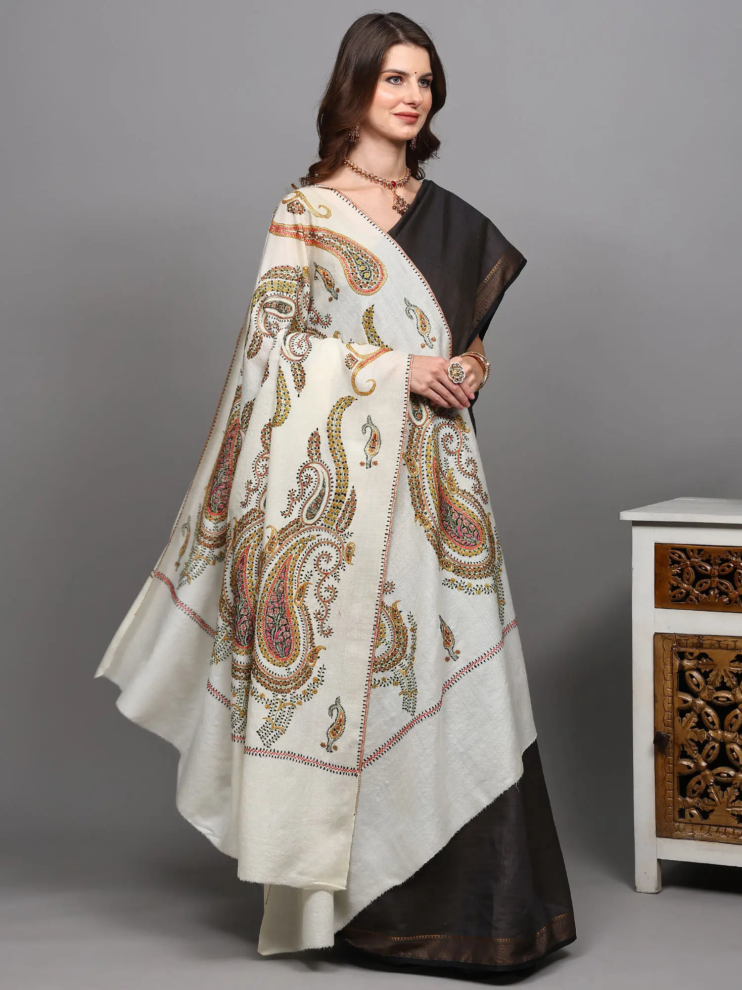 Pure Pashmina Natural Color Sozni Border Shawl from Kashmir