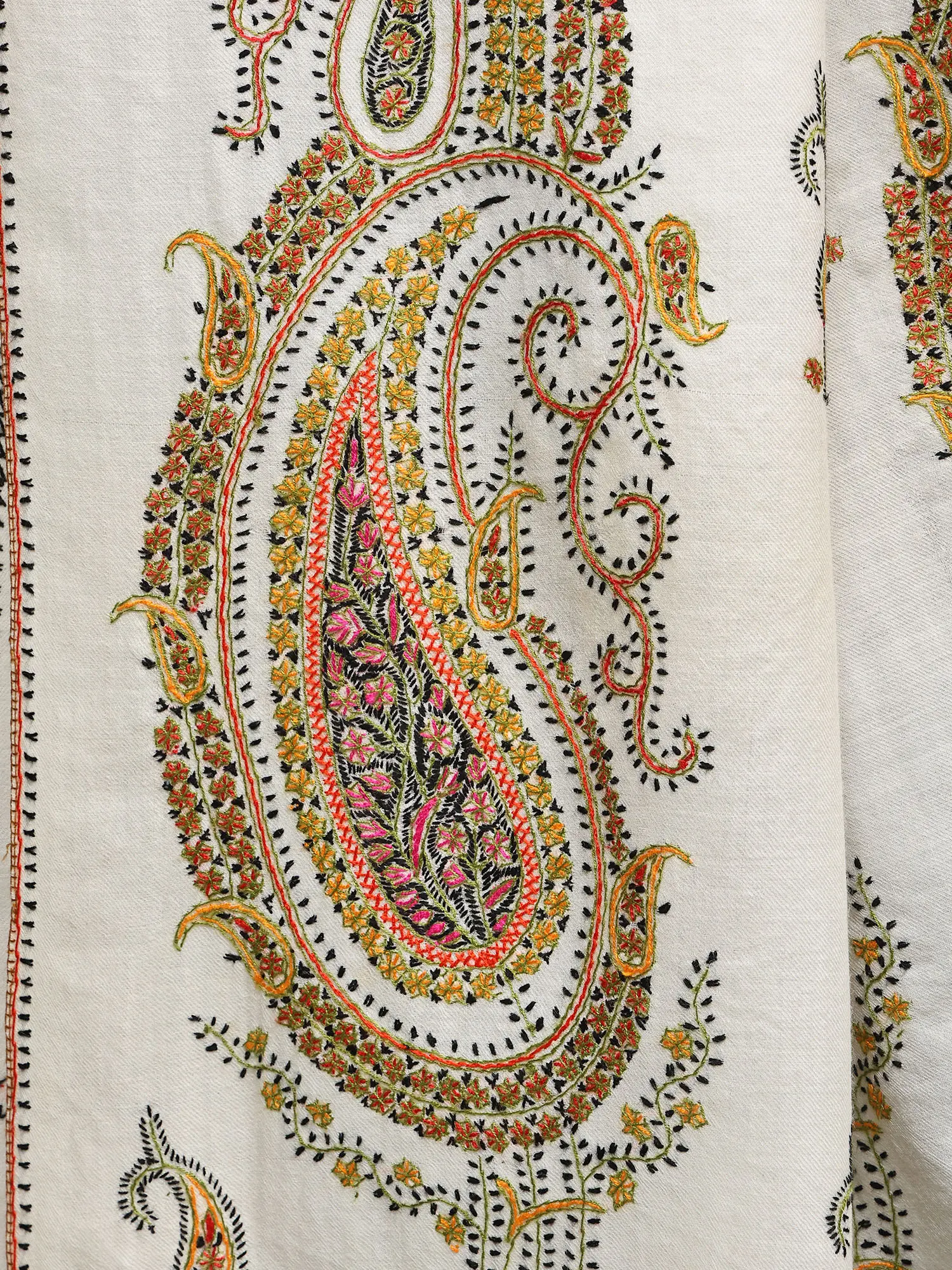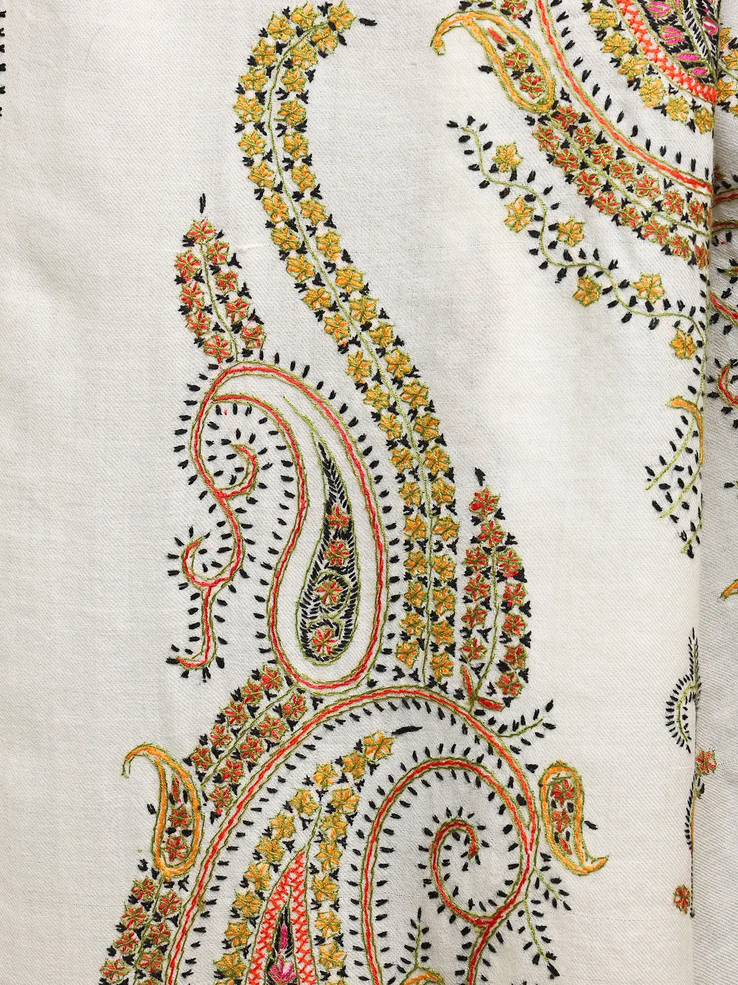 Eggnog-Cream Hand-Embroidered Sozni Shawl with Floral-Paisley Motif Border