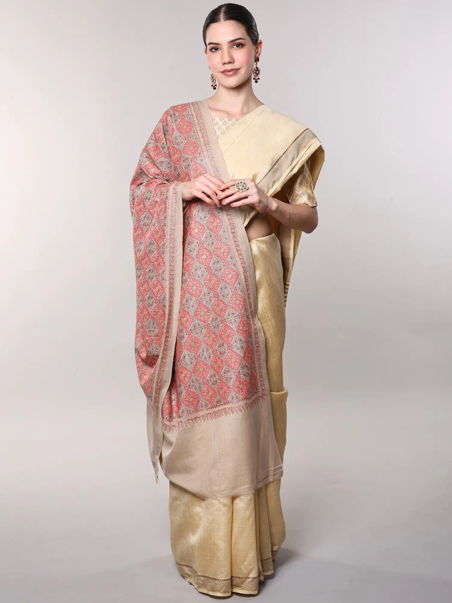 Antique-White Paisley Jaal Aari Hand-Embroidered Pure Wool Shawl from Kashmir