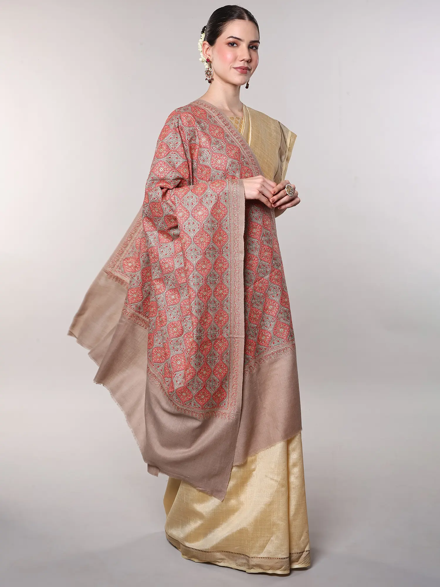 Deep Sea-Coral Pure Wool Shawl with Aari Embroidered Floral Jaal from Kashmir