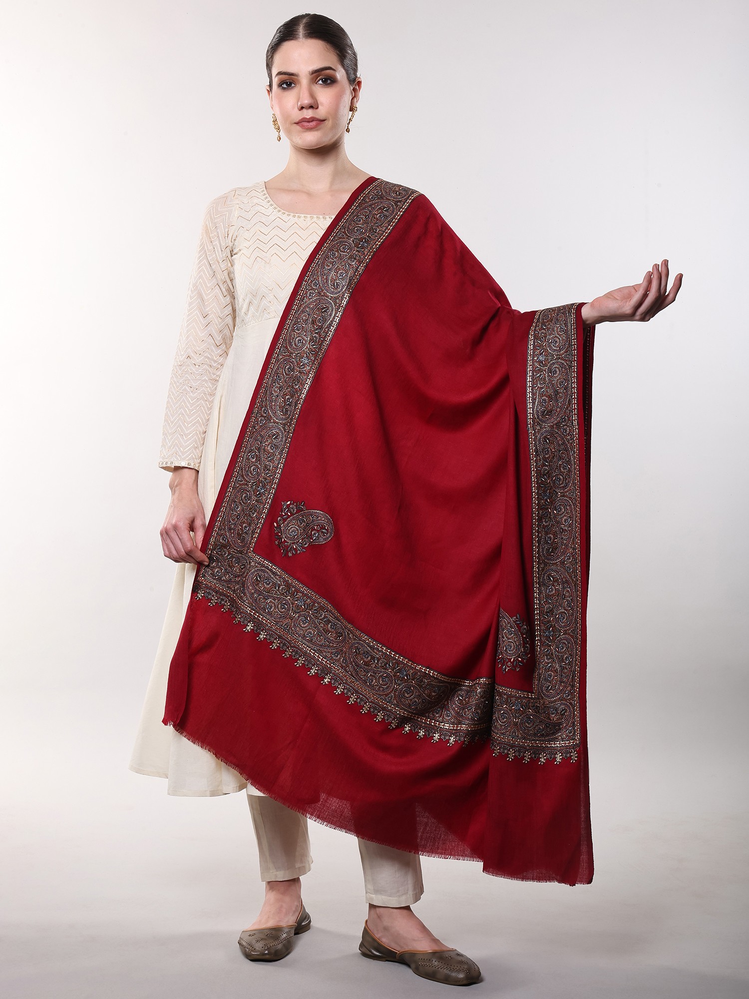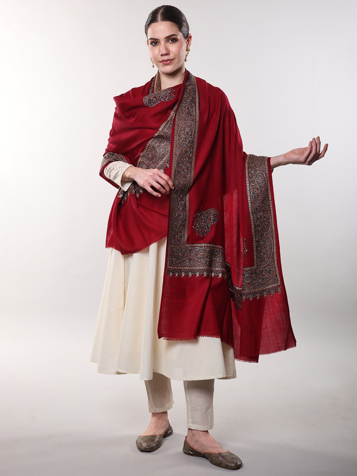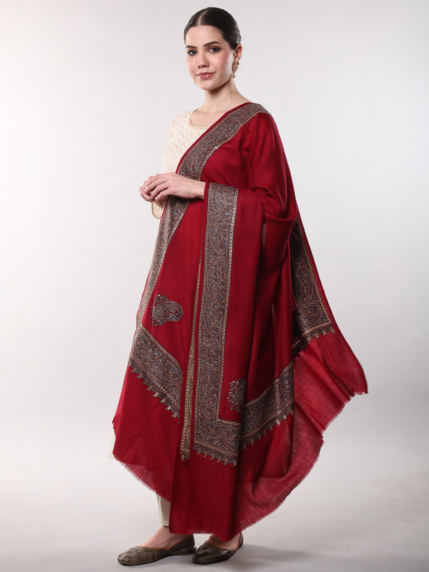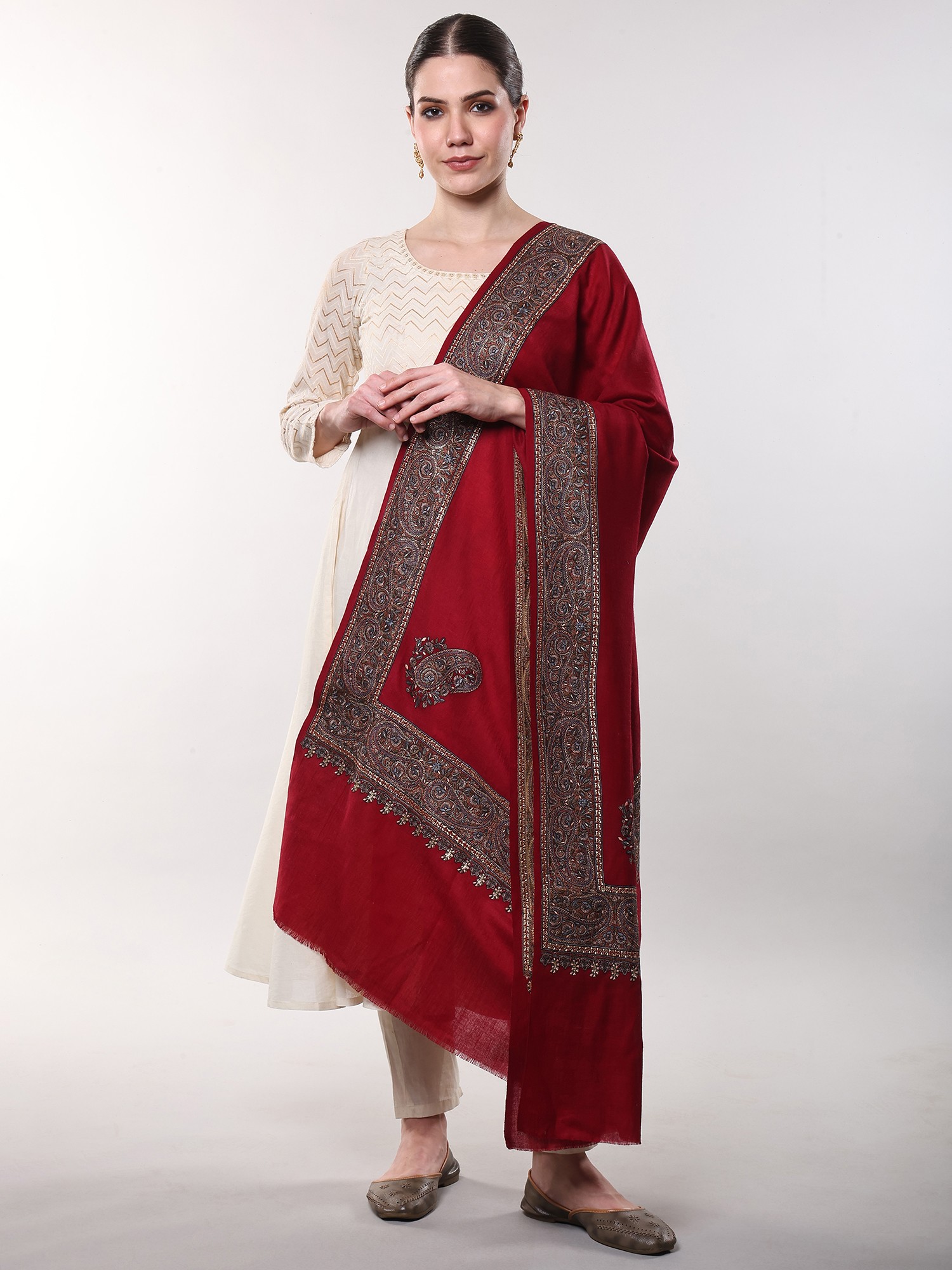 Raspberry-Coulis Floral Motif Pure Wool Shawl with Aari Embroidery by Hand