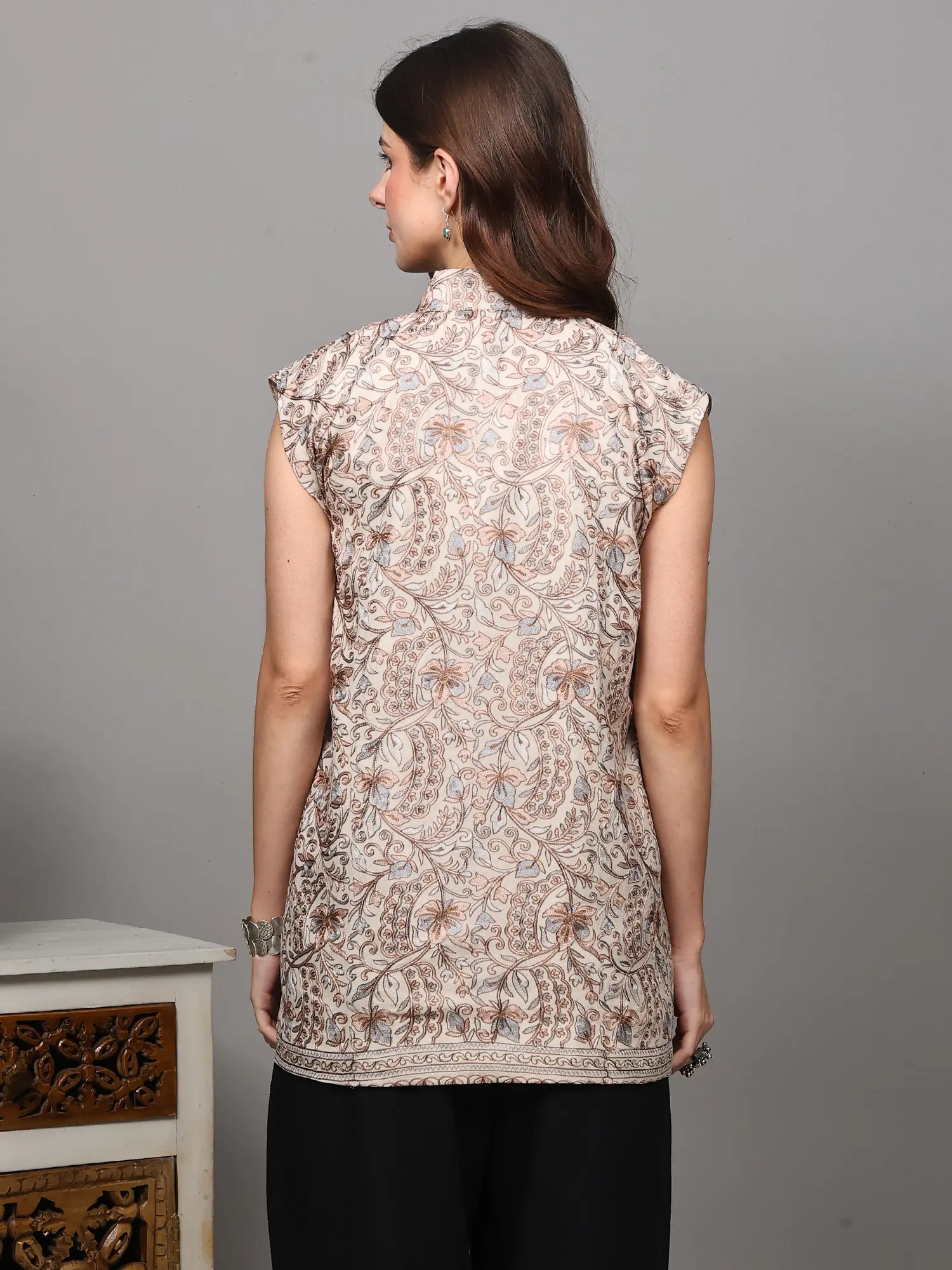 Designed with a modern silhouette in mind, this sleeveless jacket offers a flattering fit that moves with you. Its open front design, secured with subtle button closures, allows for easy layering over your favorite tops, blouses, or even dresses. The stand-up collar adds a touch of refined elegance, framing the face beautifully. The sleeveless cut makes it an ideal choice for transitional weather, providing warmth without bulk, and can also be a chic addition to an outfit during warmer months when air conditioning is present. This jacket is a statement piece that can transform an ordinary outfit into something extraordinary, injecting a dose of artistic flair and cultural richness into your personal style. It’s the perfect fusion of comfort, artistry, and enduring fashion.