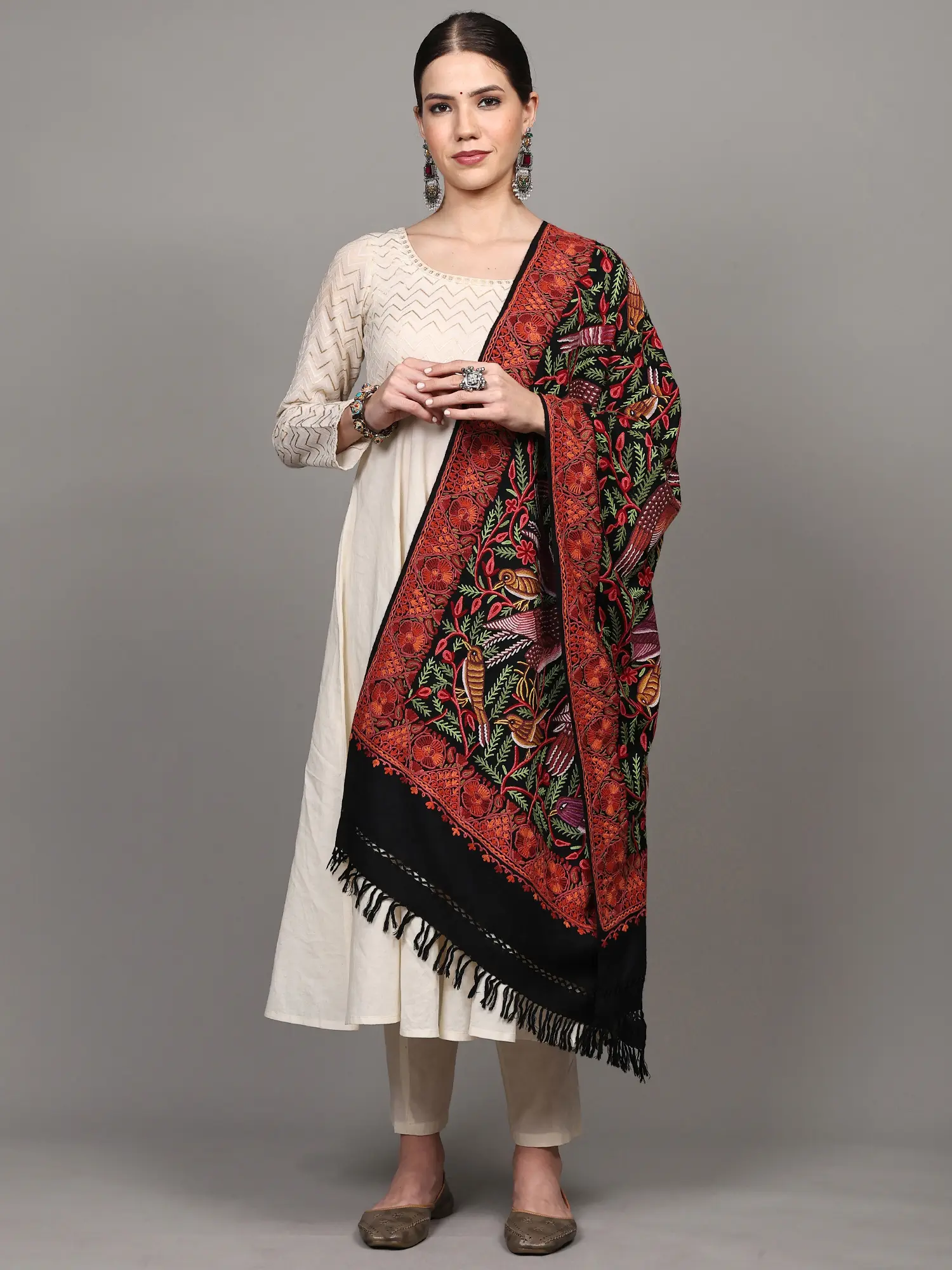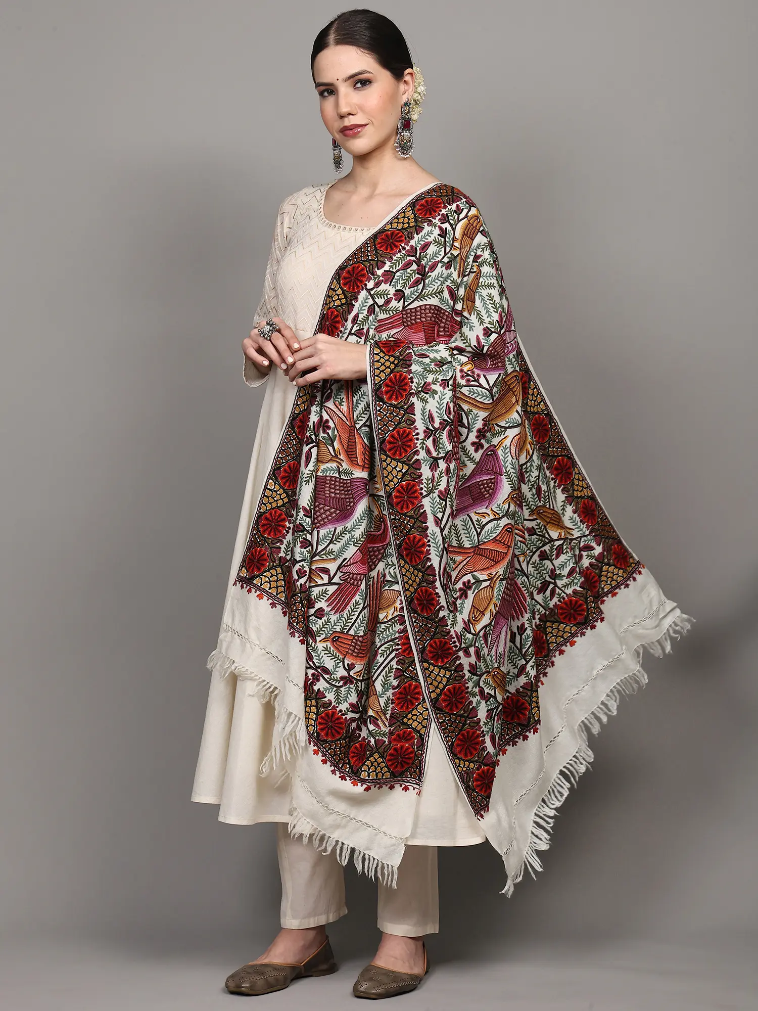 Embrace the heritage and artistry of Kashmir with this hand-embroidered stole. Each piece is a testament to generations of skilled artisans who have preserved and perfected the Aari embroidery tradition. Owning this stole means possessing a piece of cultural legacy, a work of art that carries the stories and traditions of a land renowned for its exquisite craftsmanship. It is a gift that embodies beauty, warmth, and a deep appreciation for handmade artistry. The subtle fringes at the hem add a final touch of handcrafted detail, making this stole a truly unique and cherished addition to any collection.