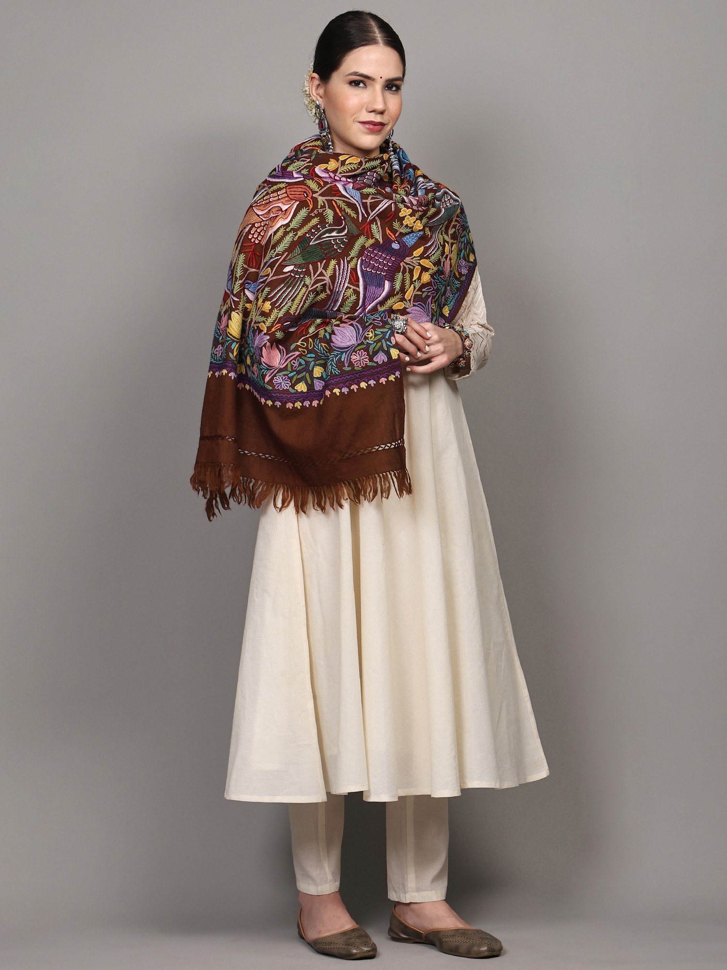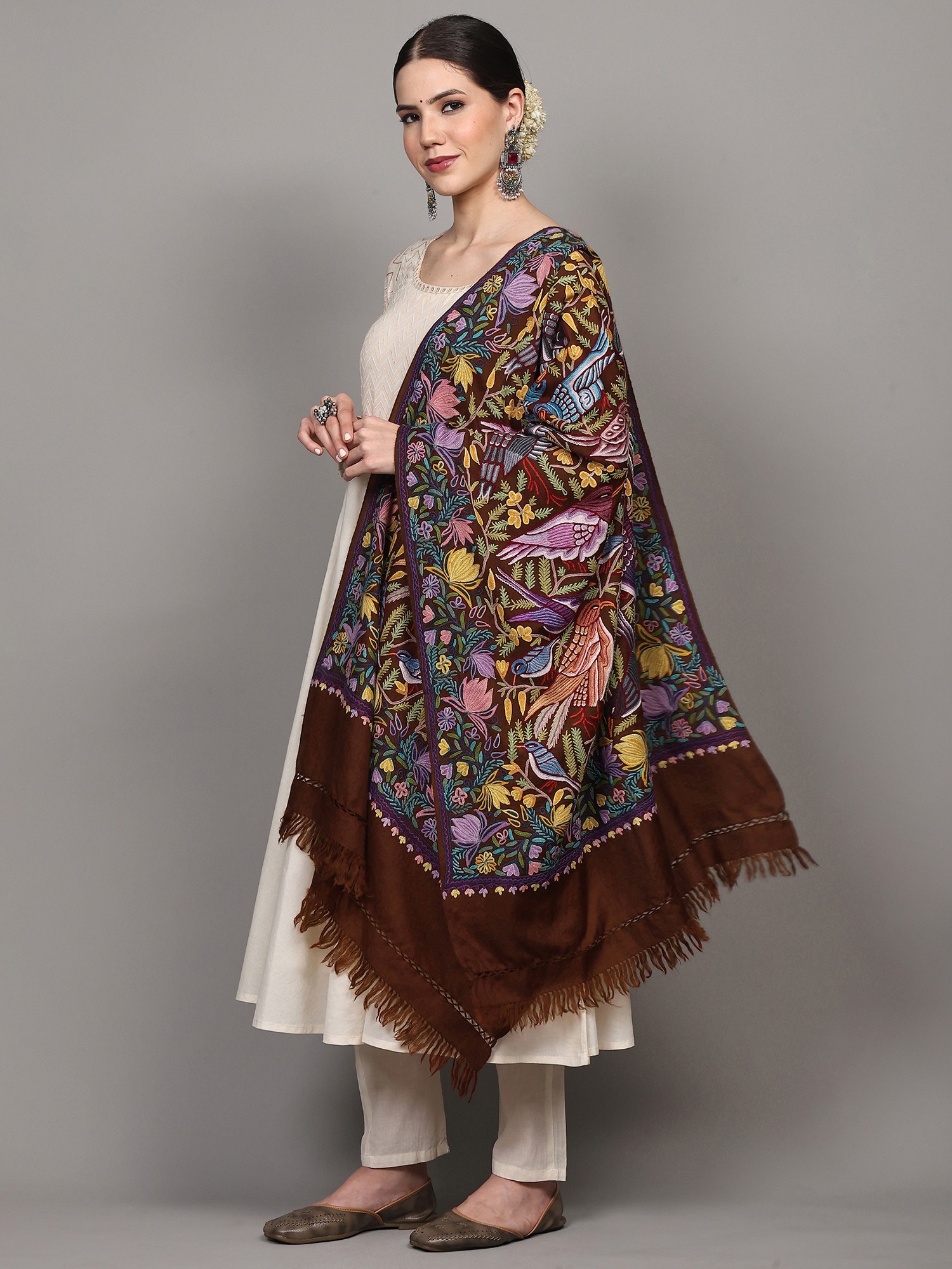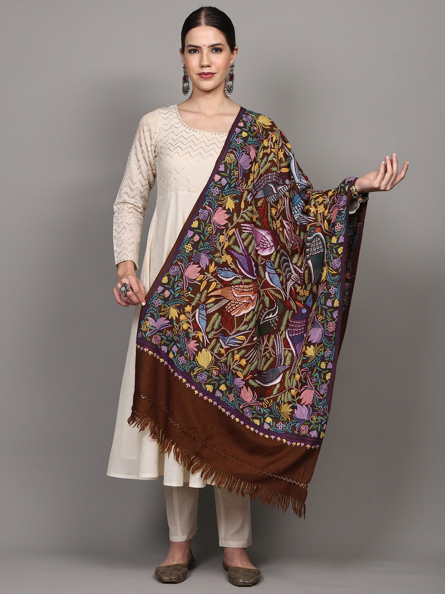 Pure Wool Stole from Kashmir with Aari Hand-Embroidered Birds on Tree Branches
