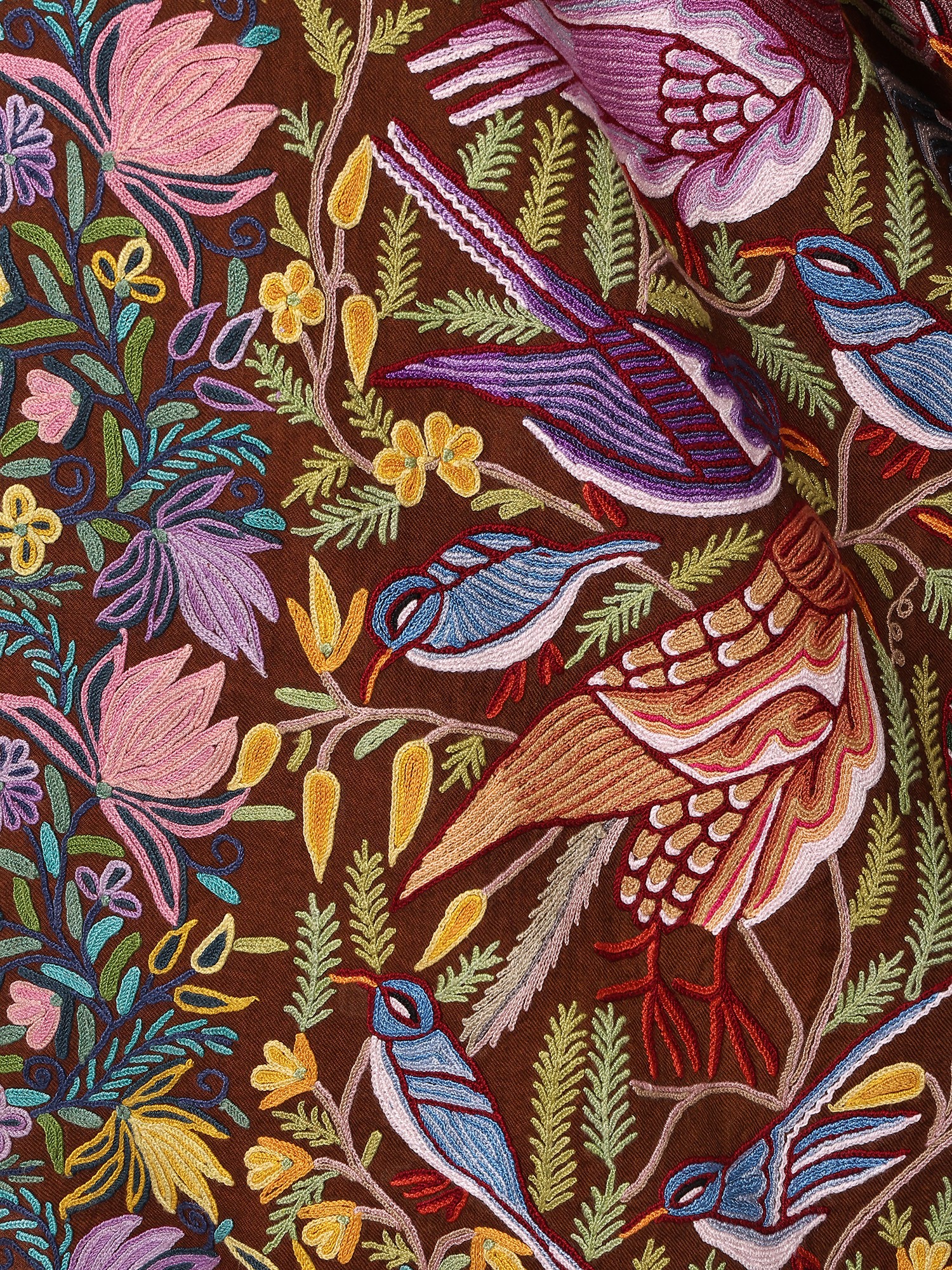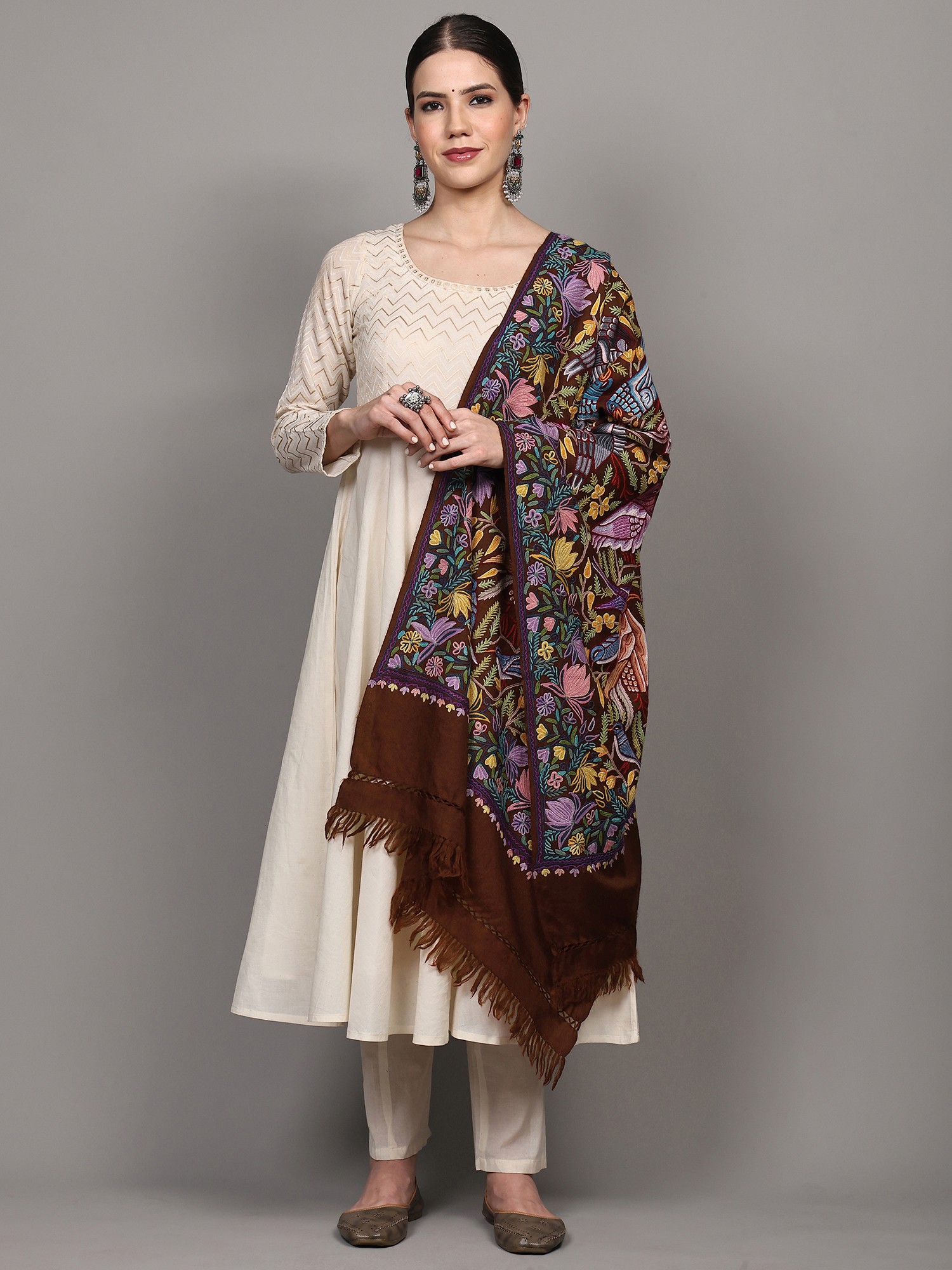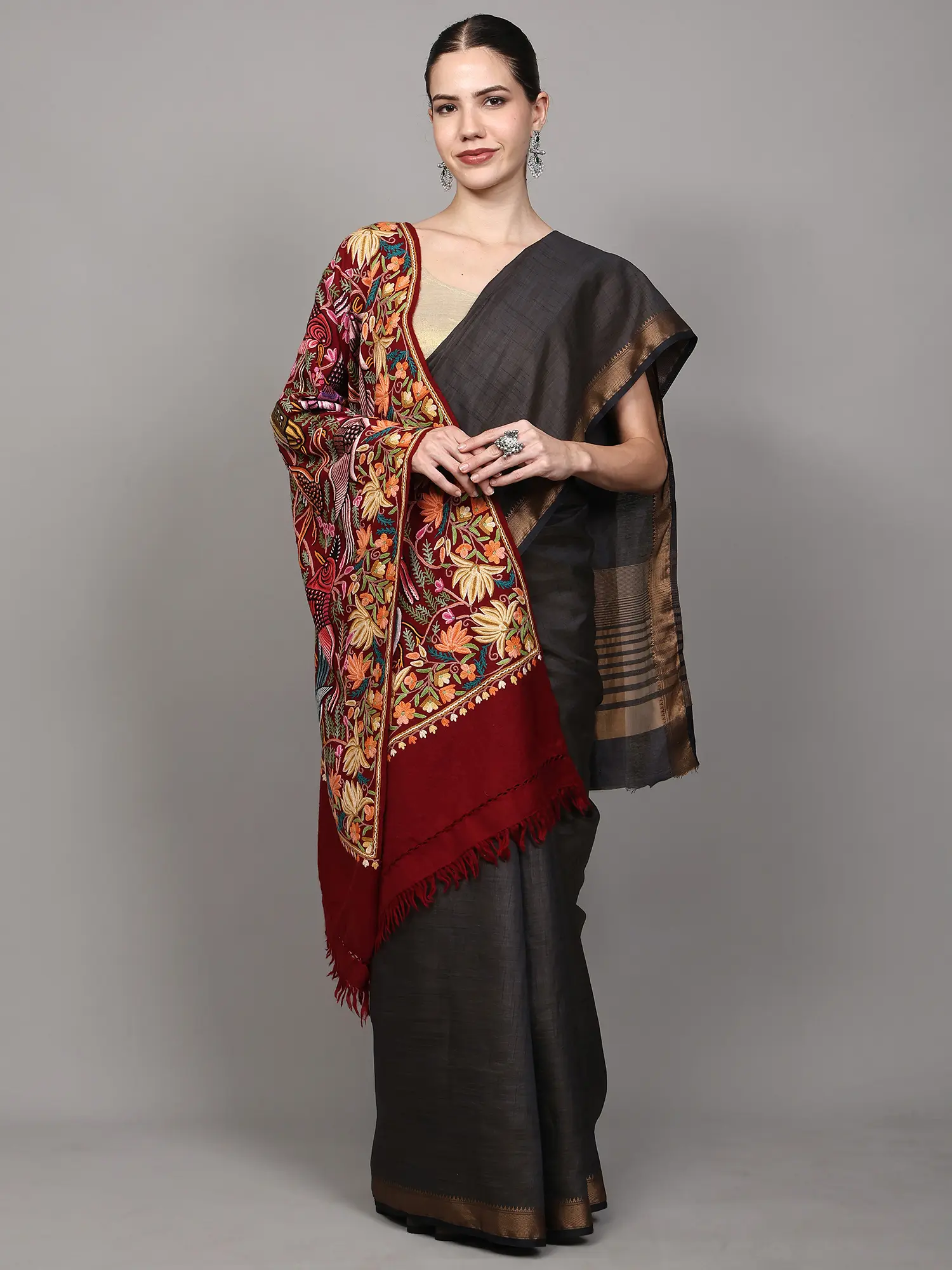 Pure Wool Stole from Kashmir with Aari Hand-Embroidered Birds on Tree Branches