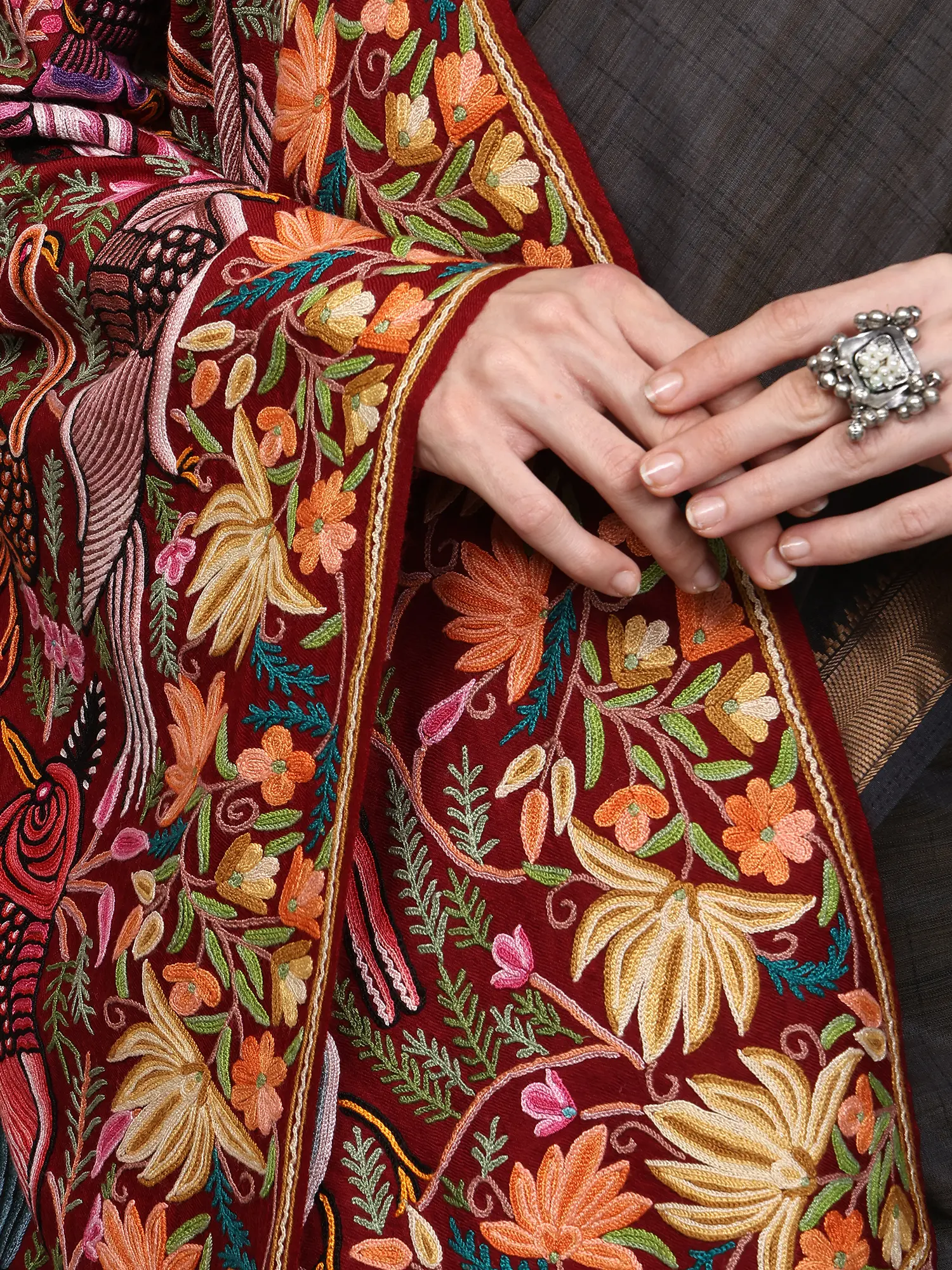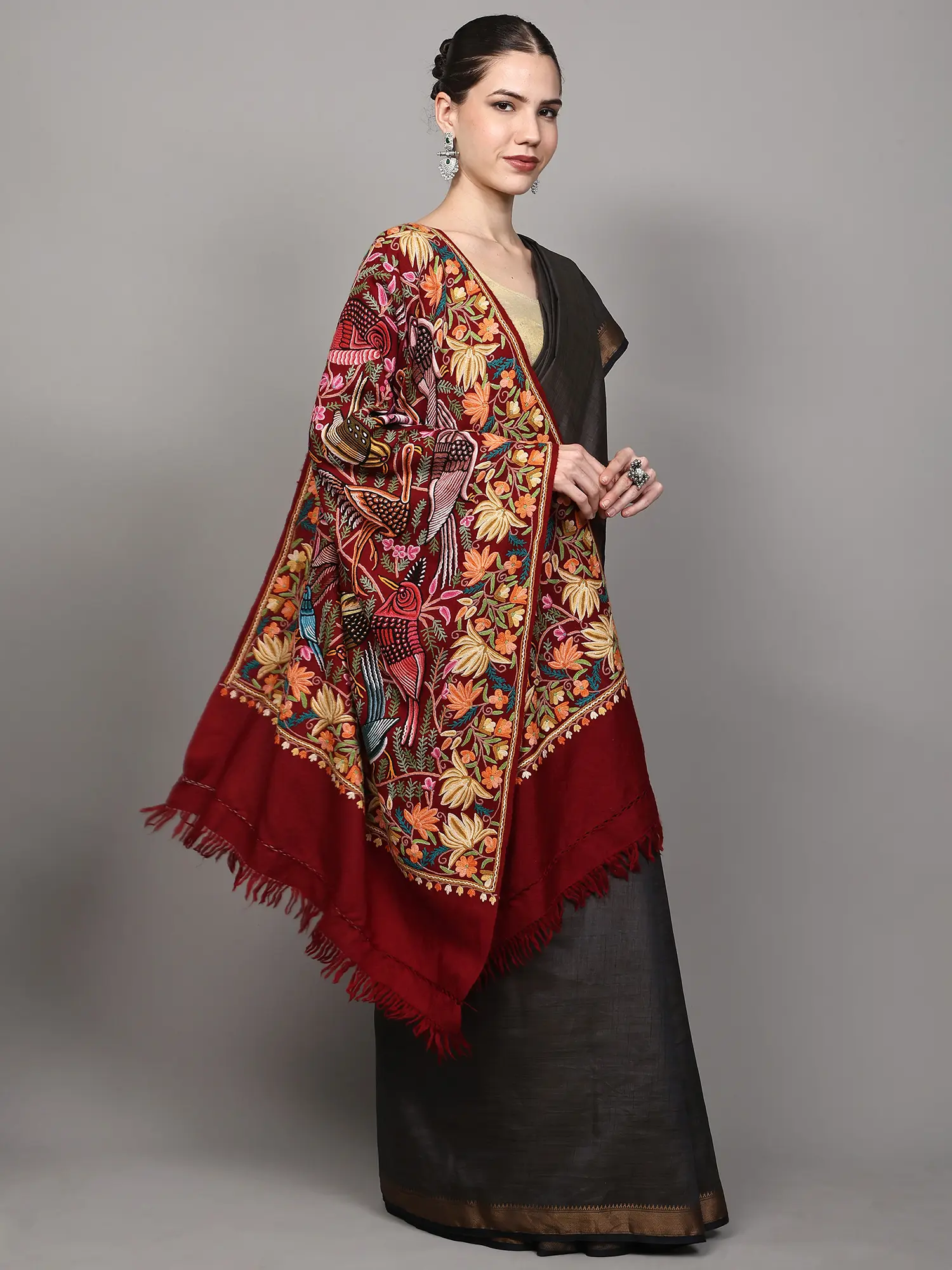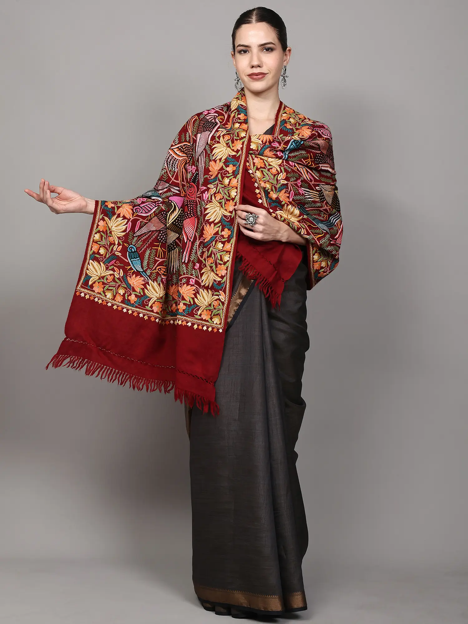 Mars-Red Pure Wool Stole from Kashmir with Birds and Flowers Pattern Aari Embroidery by Hand