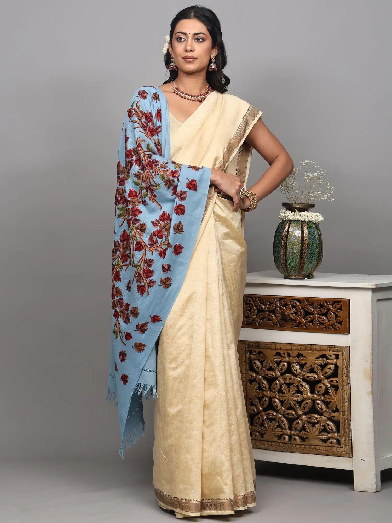 Pale-Rosette Georgette Saree with Paisleys Aari Embroidery on Border and Pallu from Kashmir