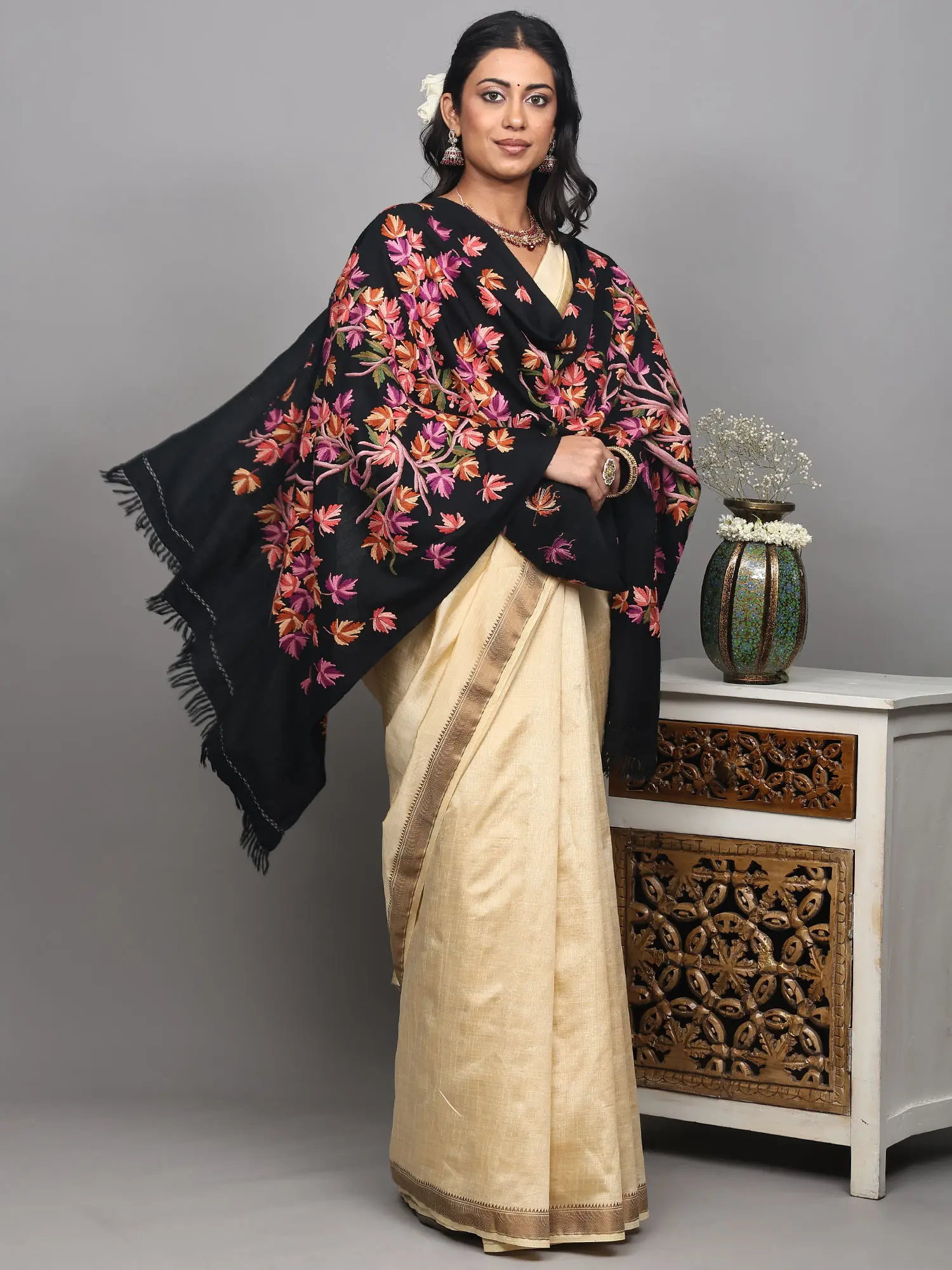Moonless-Night Pure Wool Stole from Srinagar with Birds and Flowers Aari Embroidery by Hand