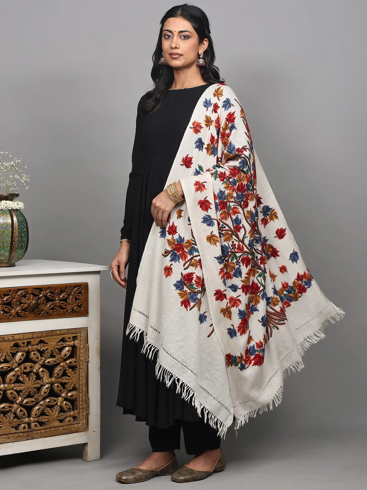 The intricate detail of the maple tree is brought to life through the Aari embroidery technique, a centuries-old art form native to Kashmir. This method, using a specialized hooked needle, allows for the creation of fine, dense stitches that form detailed patterns and textures. Each leaf, each twig, and the sturdy trunk of the maple tree are meticulously rendered by skilled artisans, a process that speaks to dedication and a deep understanding of their craft. The embroidery extends across the stole, creating a captivating visual narrative that is both artistic and deeply symbolic, representing growth, resilience, and the beauty of the changing seasons.
