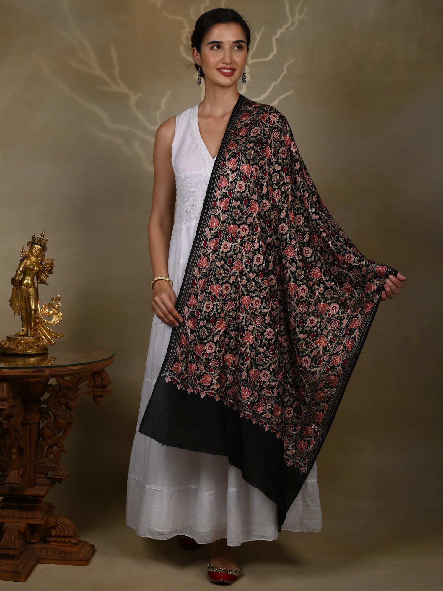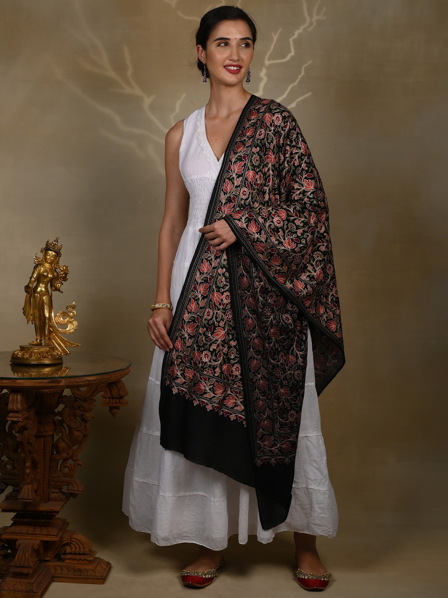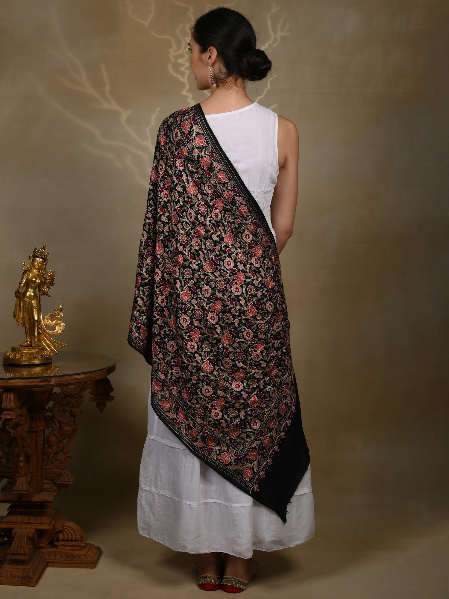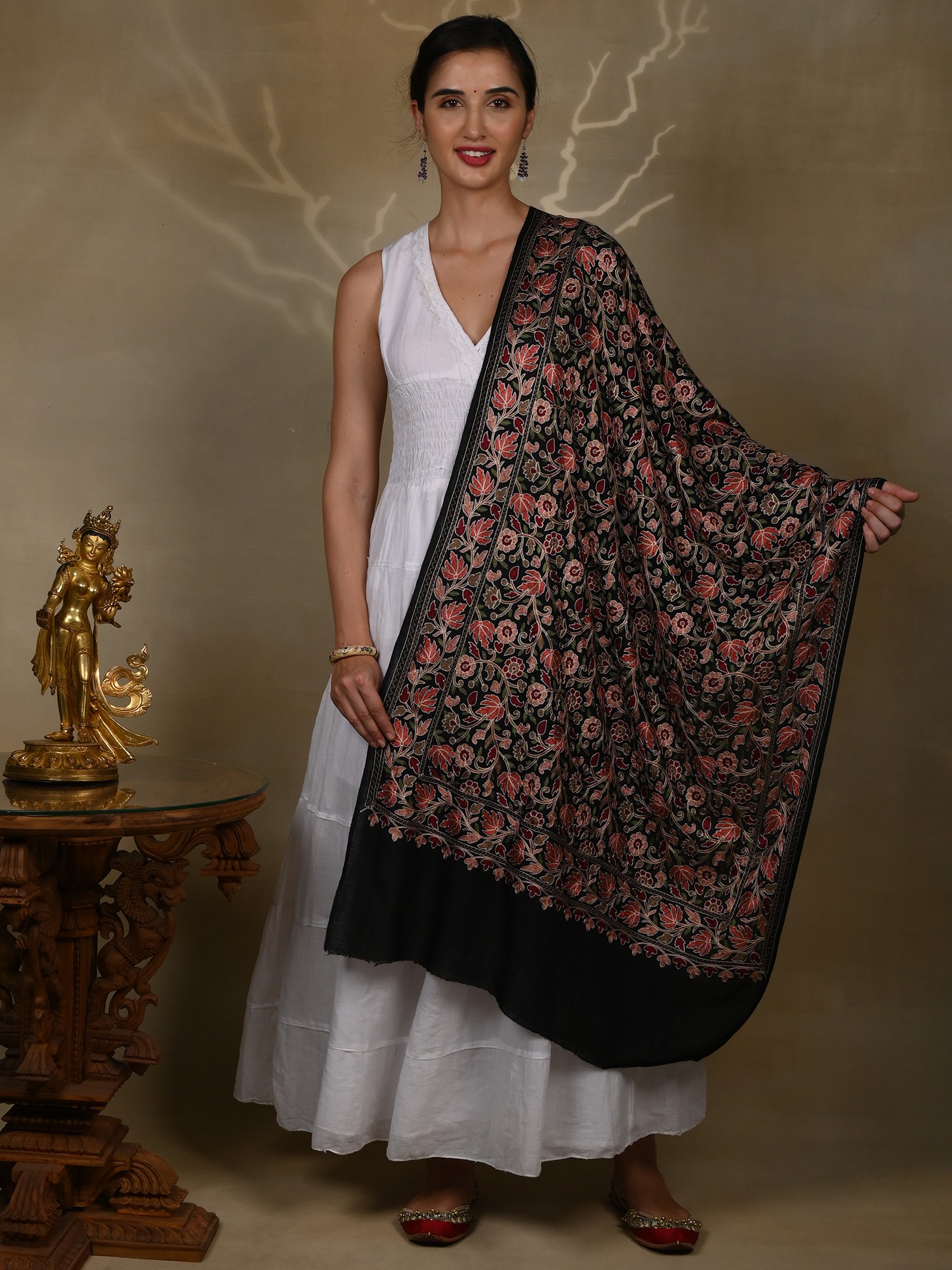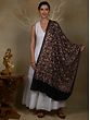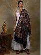 Pure Woolen Black Stole with Detailed Multicolored Floral Bel All over Aari Threadwork from Kashmir