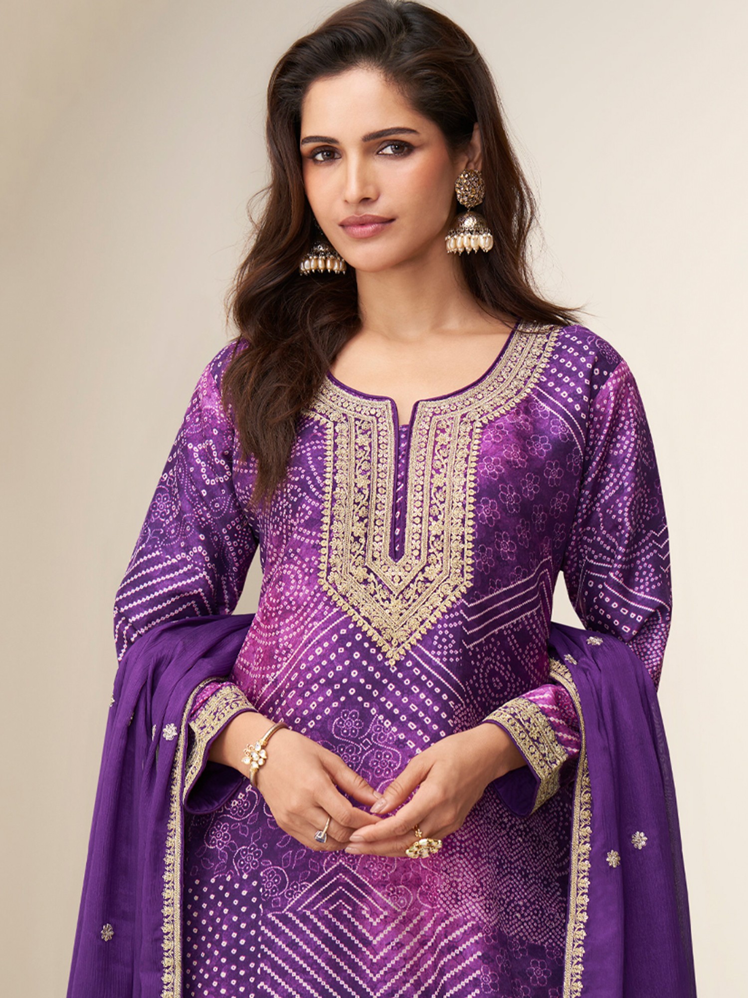 Royal Bandhani Charm Chinon Palazzo Suit With Intricate Thread Sequin Embroidery For Festive And Wedding Wear