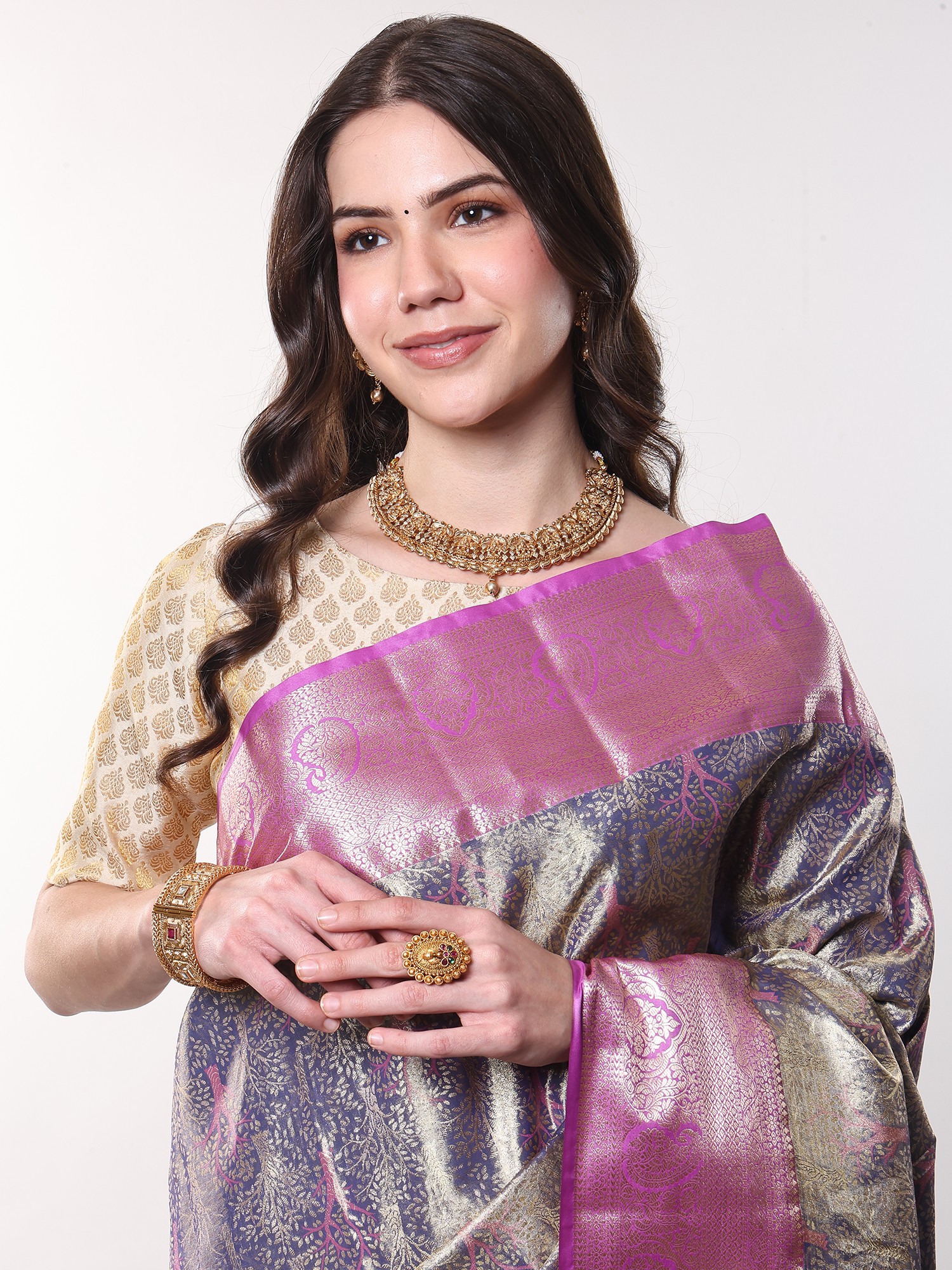 Experience the magic of the 'Purple-Haze Dhoop Chaanv' weave, a breathtaking interplay of colors that shifts and shimmers with every movement, reminiscent of sunlight filtering through mist. Adorning its entirety, you'll find elegantly woven trees, a symbol of life and growth, rendered with astonishing detail. The contrast border, featuring classic paisley motifs, adds a touch of regal sophistication, framing the entire piece with timeless charm.