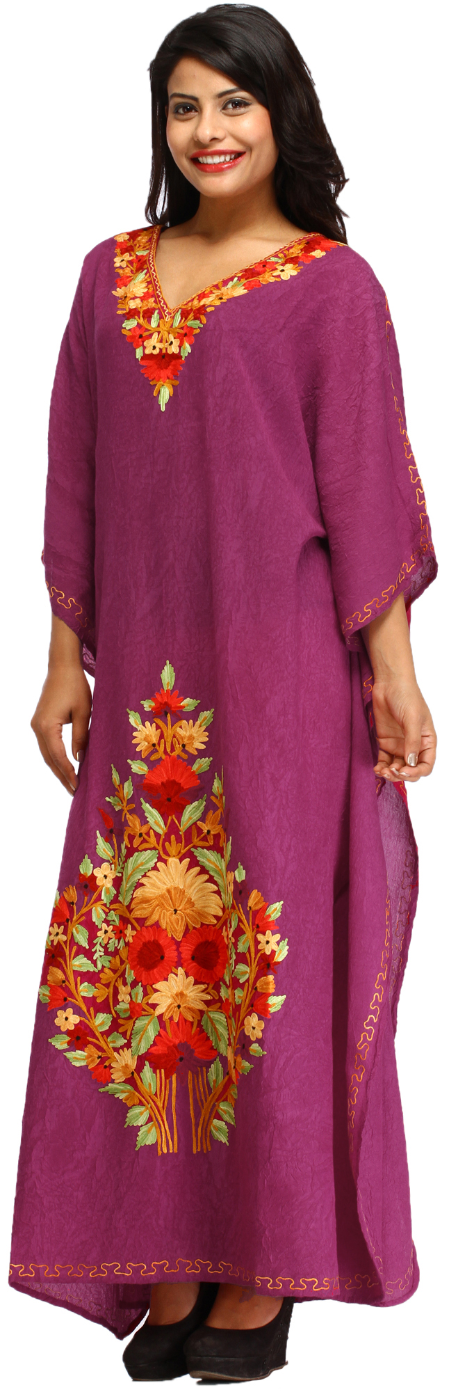 Crushed Kashmiri Kaftan with Aari Embroidered Multicolored Flowers
