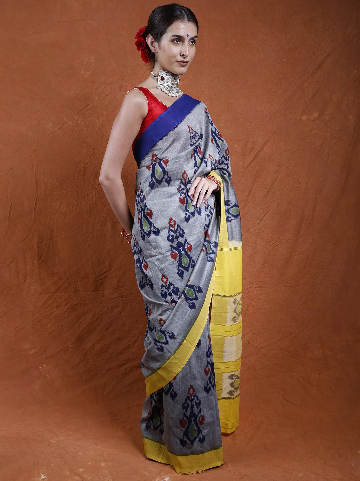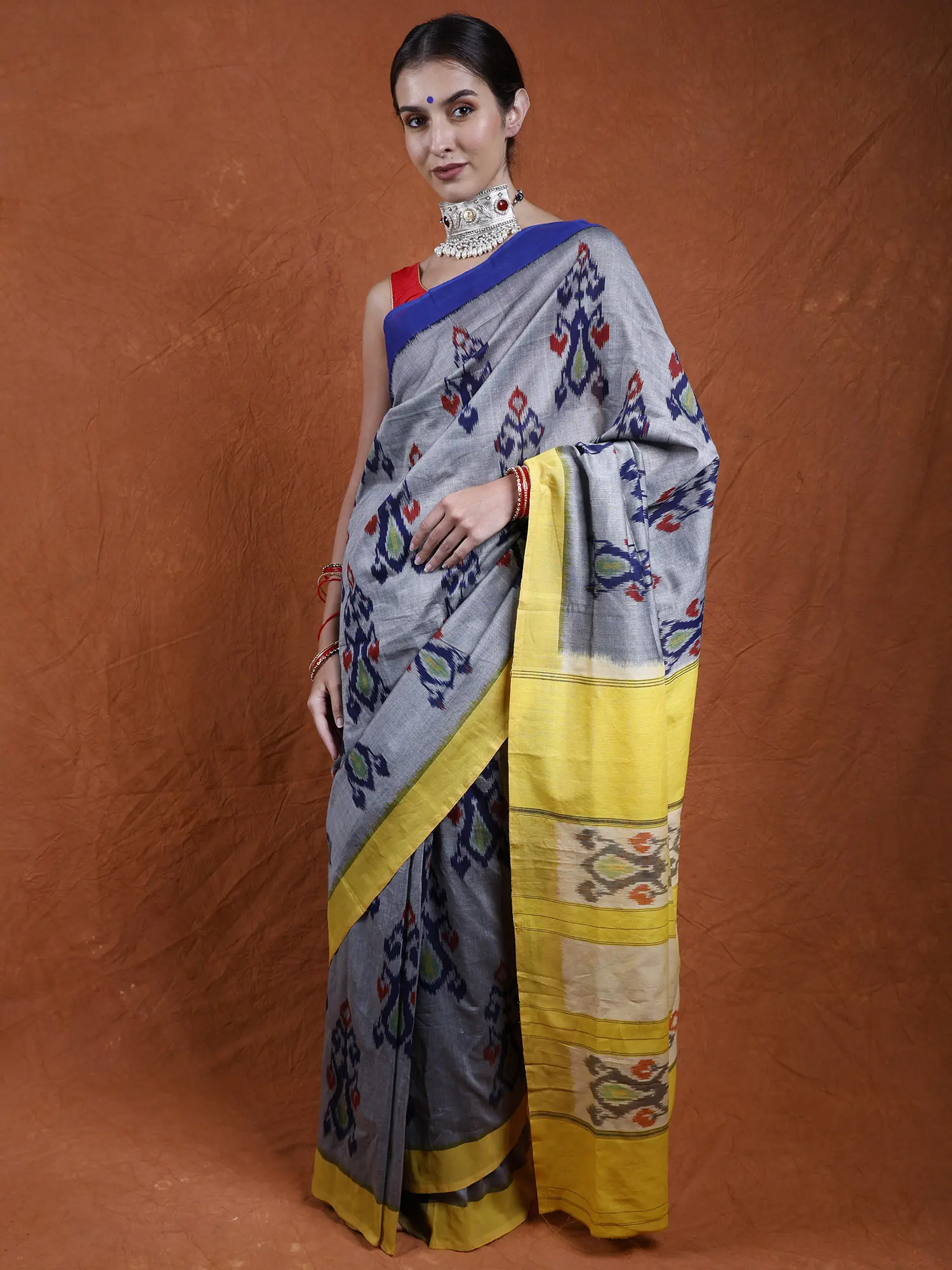 The visual appeal of this saree is amplified by its striking contrast border and anchal (pallu) in a vibrant yellow. This bold choice of color creates a dynamic interplay with the grey base, drawing the eye and adding a touch of cheerful luminosity. The yellow border runs along the length of the saree, framing the intricate patterns with a clean, defined edge. The anchal features a more elaborate display of horizontal stripes interspersed with repeating Ikat motifs, showcasing the weaver's mastery and adding a dramatic flourish as the saree is draped. The transition from the grey body to the yellow border is seamless, demonstrating the precision of the handloom process.