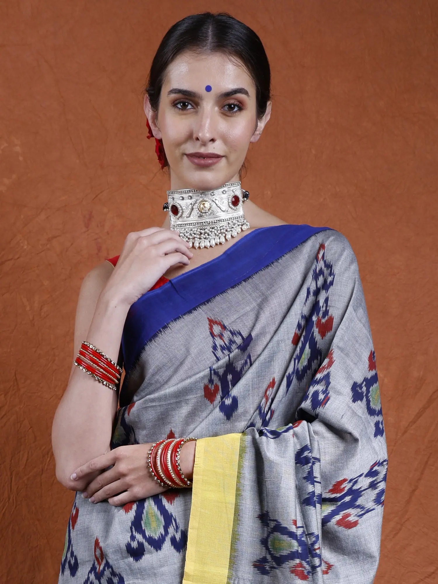 Quicksilver Pure Cotton Ikat Handloom Saree from Pochampally with Contrast Yellow Border and Anchal