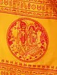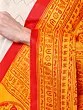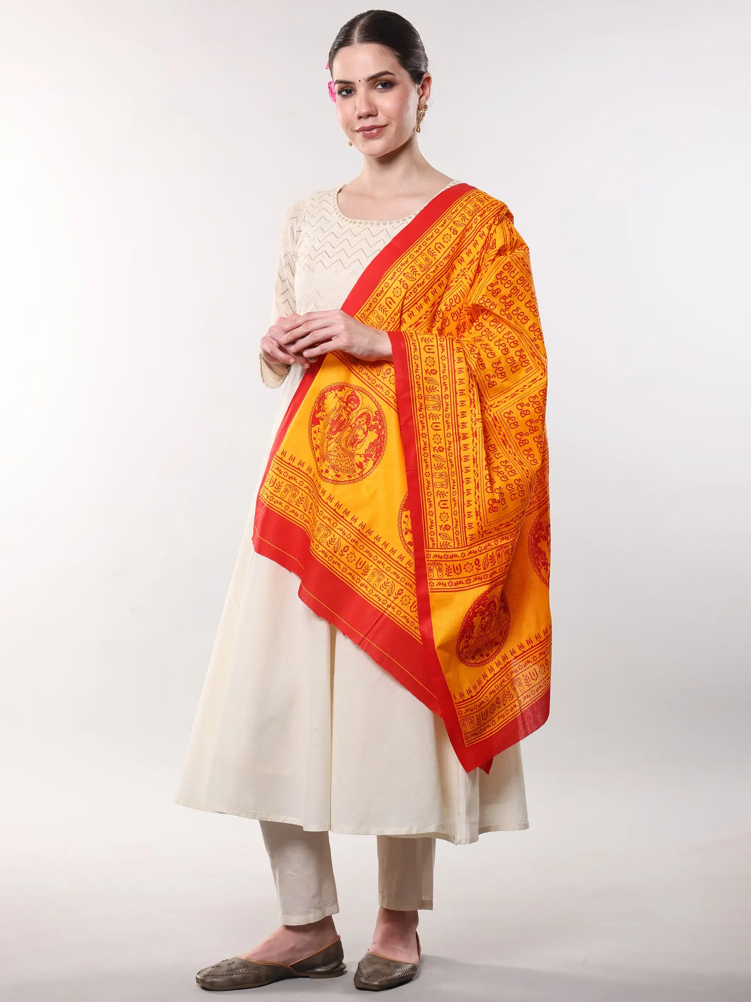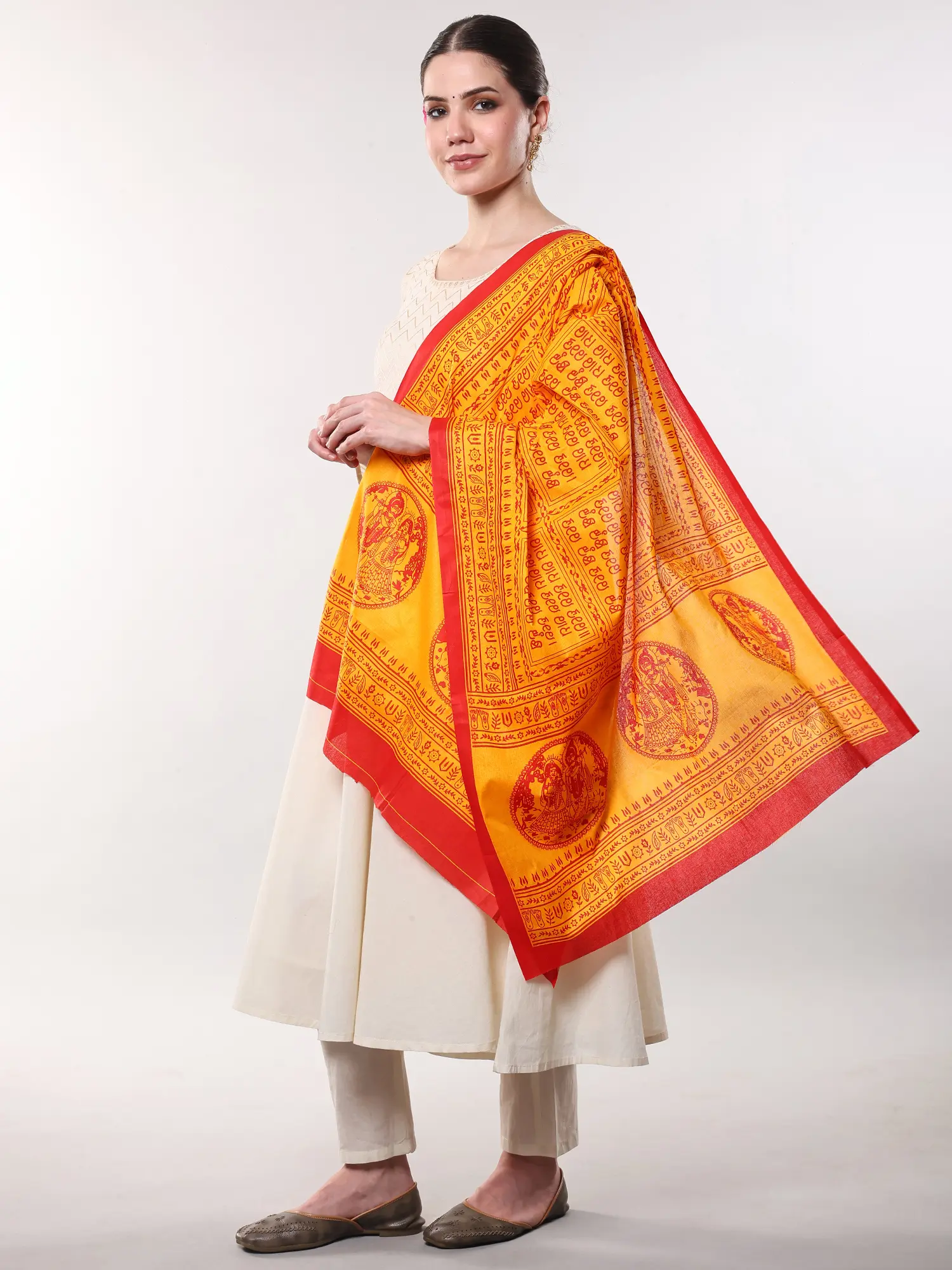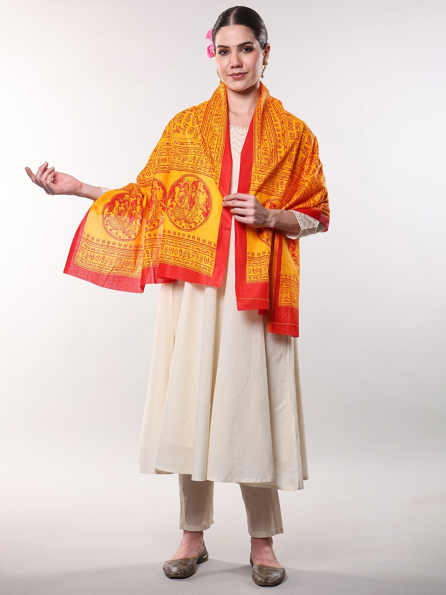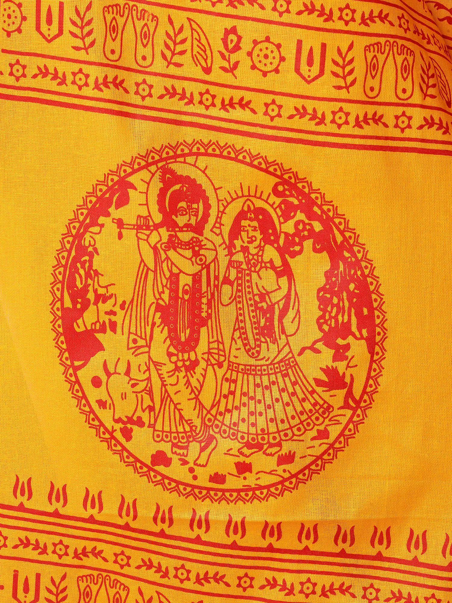 The striking contrast of rich yellow and deep red hues creates an immediate visual impact, drawing the eye to the central motifs. You'll appreciate the serene depiction of Radha and Krishna, rendered with delicate precision. Encircling this divine pair, the Hare Krishna Hare Rama Maha Mantra is elegantly printed, a continuous flow of spiritual resonance. The overall dimensions, a generous 64 inches in length and 32 inches in width, offer ample coverage and graceful drape.