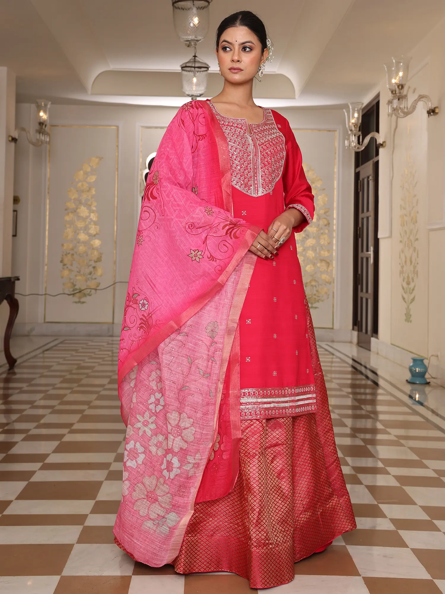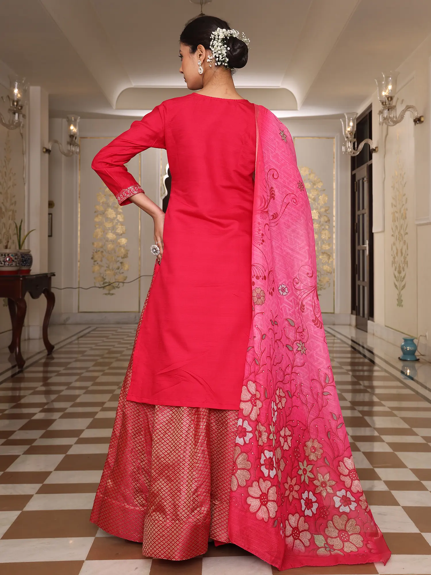 Festive Pink Velvet Kurti Sharara Set With Floral Embroidery And Chanderi Dupatta Indian Ethnic Dress
