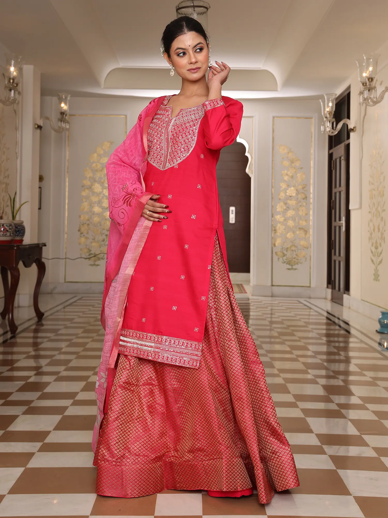 Viscose Silk Kurti With Matching Pant And Maslin Silk Dupatta Showcasing Multi Embroidery Thread Work With Hand Crafted Detailing