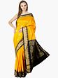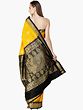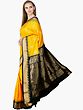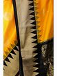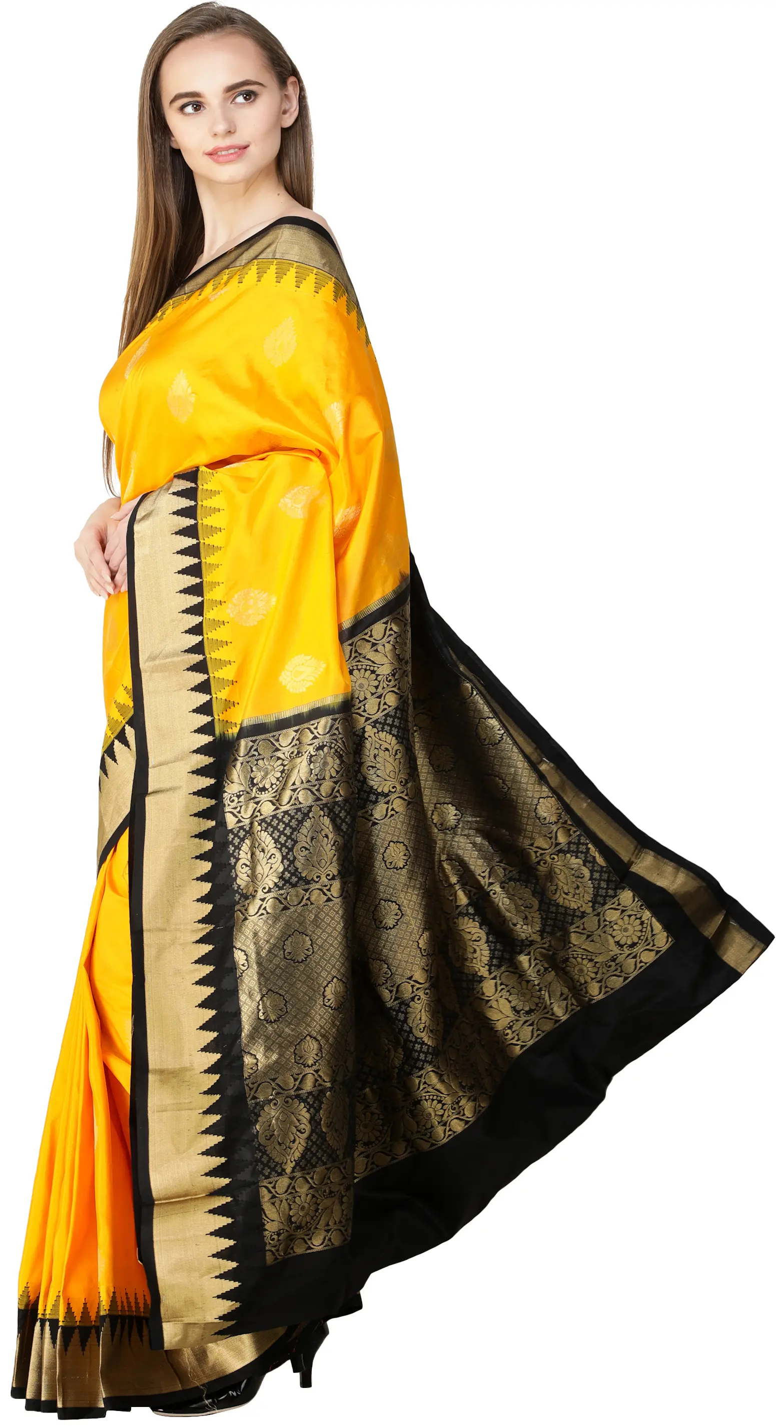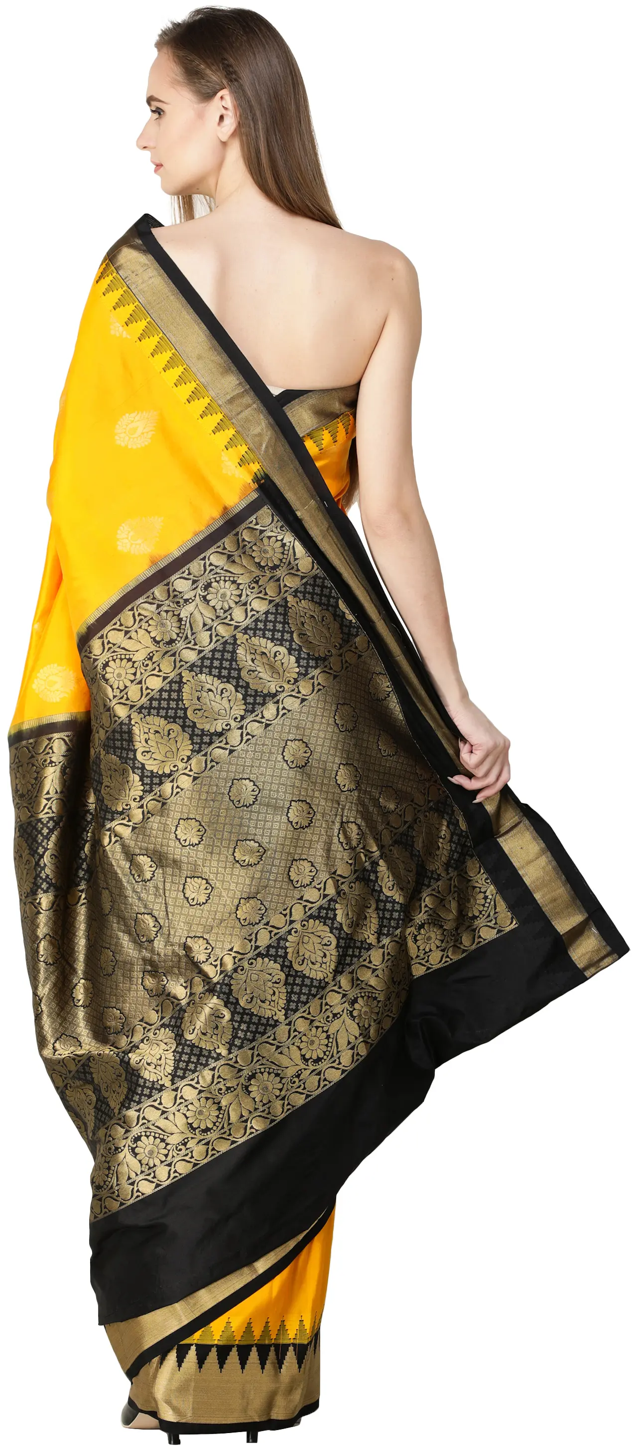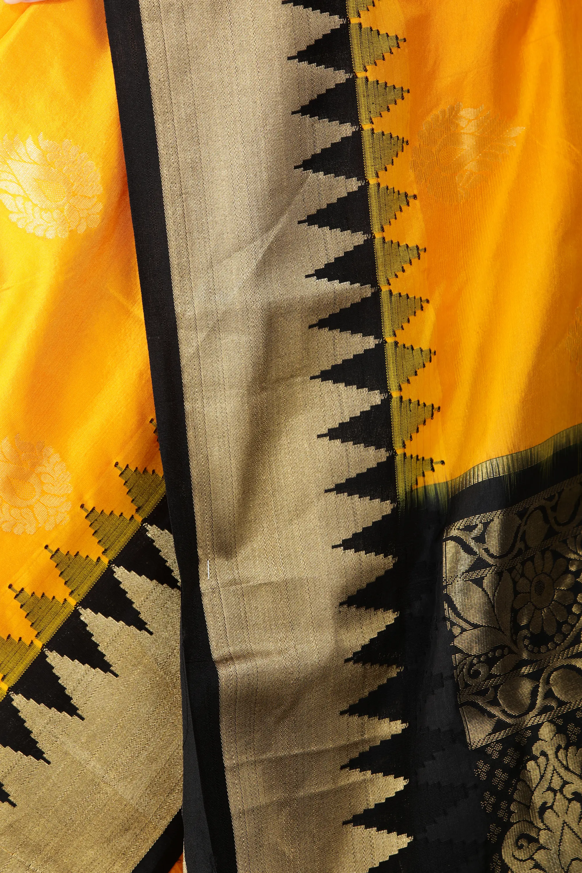 Complementing the vibrant yellow is a striking border that draws inspiration from temple architecture. This grand border features a deep black hue, providing a dramatic contrast. Within the black, intricate gold weaving creates elaborate motifs that are reminiscent of sacred temple carvings. The sharp, geometric zigzag pattern along the edge of the border adds a modern edge to the traditional design, creating a stunning visual frame for the sari. The interplay of gold and black, along with the intricate craftsmanship, lends an aura of regality to this exceptional piece.