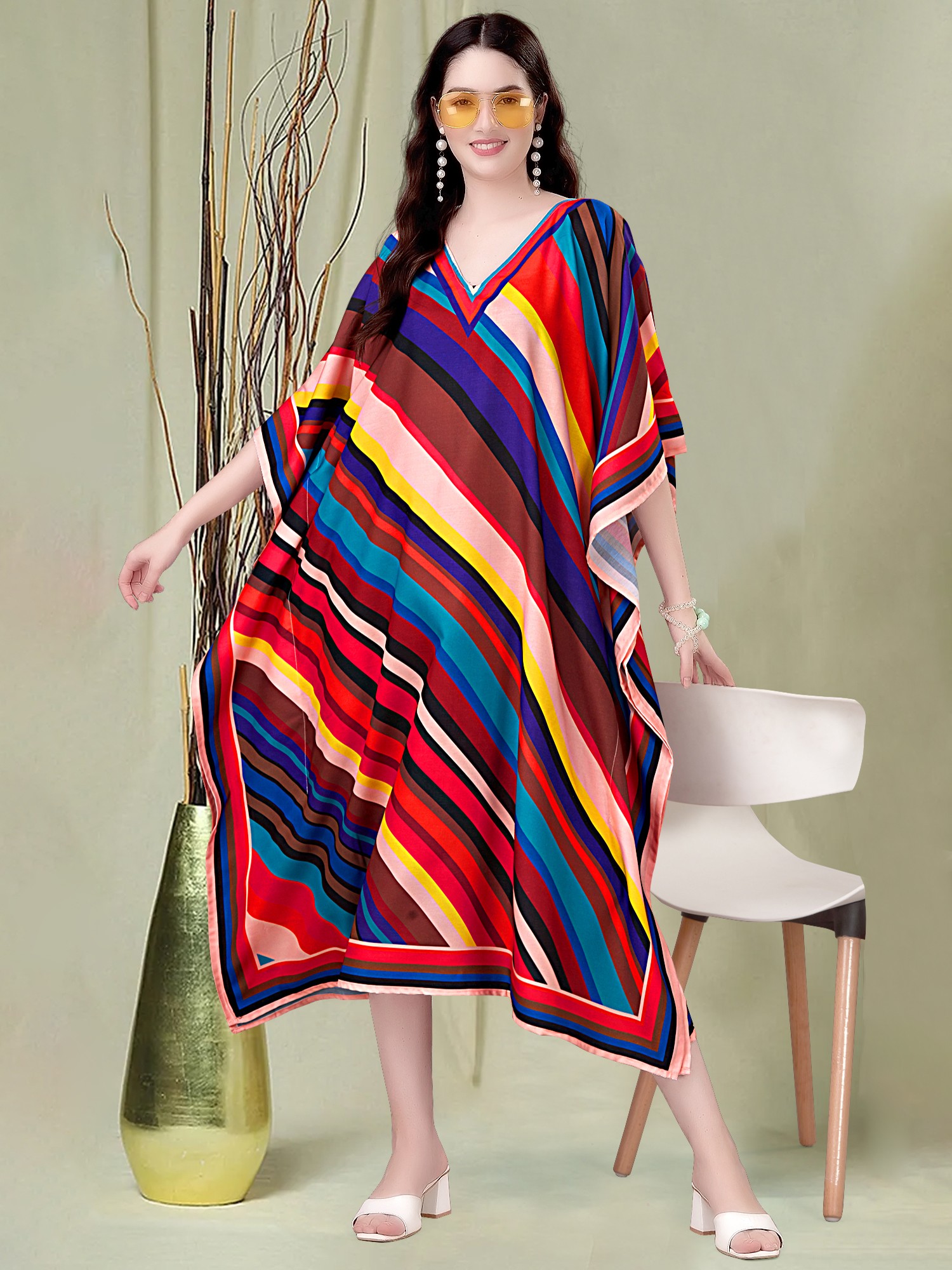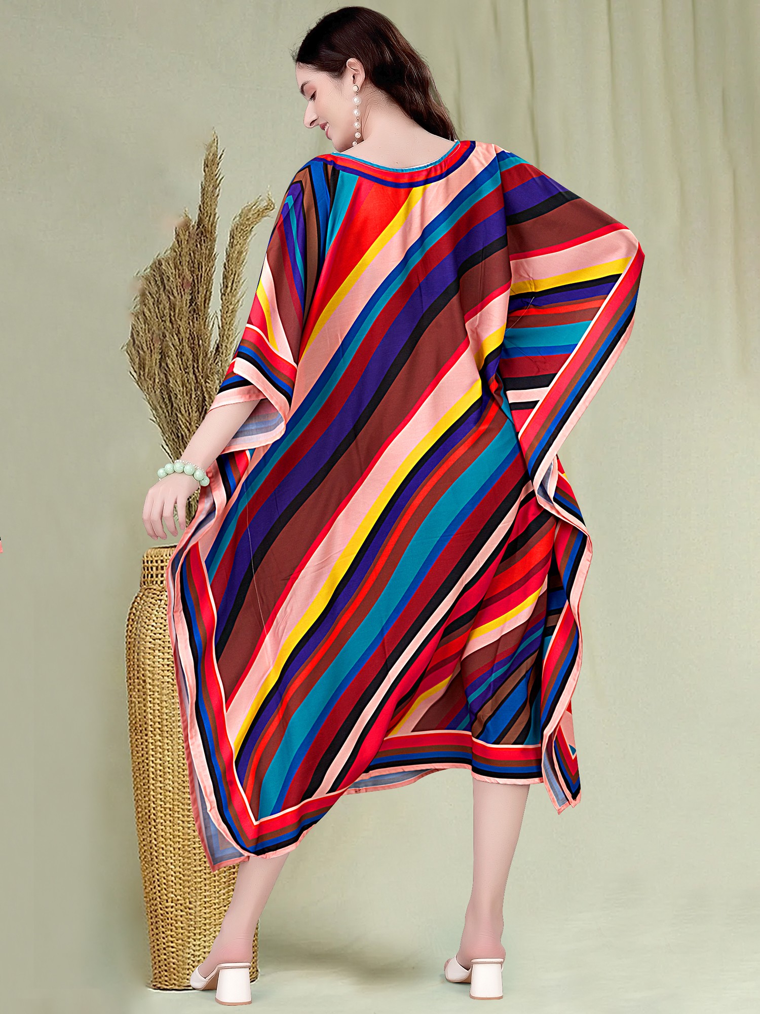 Multicolor Printed Rayon Boat Neck Midi Kaftan