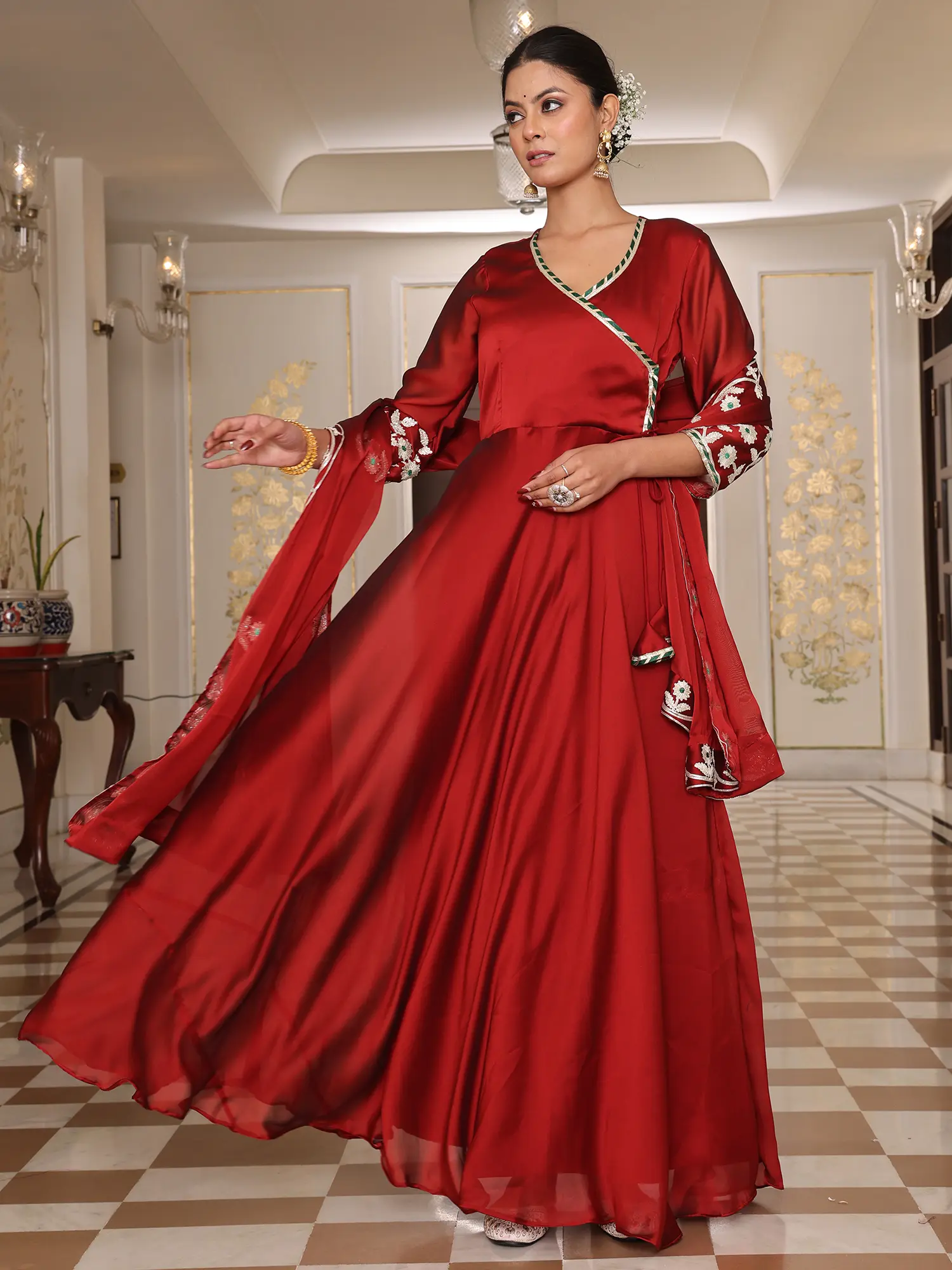 The rich, vibrant hue of the silk is further enhanced by the intricate embroidery, creating a harmonious blend of color and texture. You'll appreciate the subtle yet striking interplay of the ribbon work against the smooth silk. The flowing silhouette, complete with a matching dupatta and a smoothly tailored crepe bottom, ensures comfort without compromising on regal appeal.