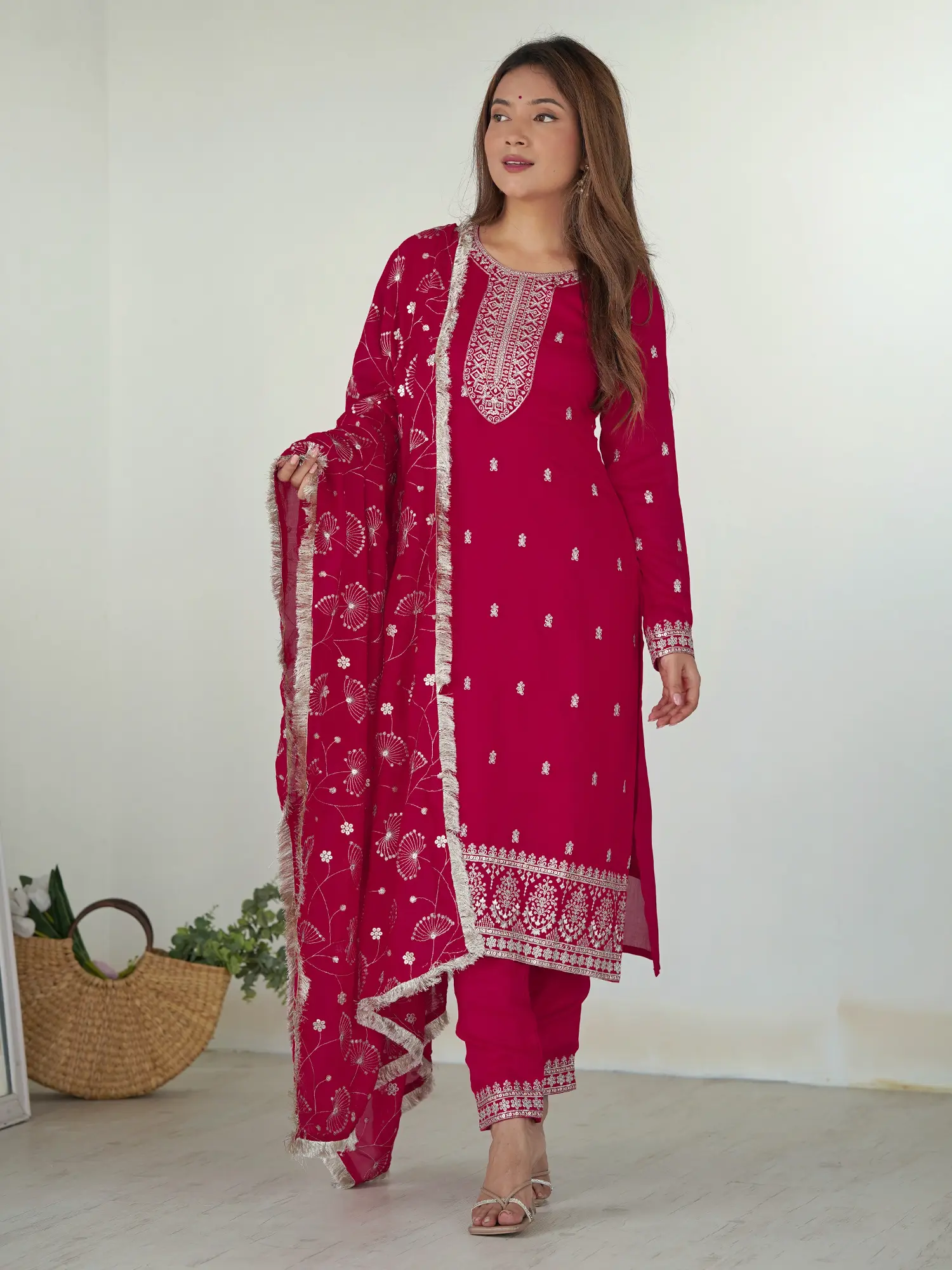 Silk Salwar Suit with Floral Embroidery and Sequins & Matching Dupatta