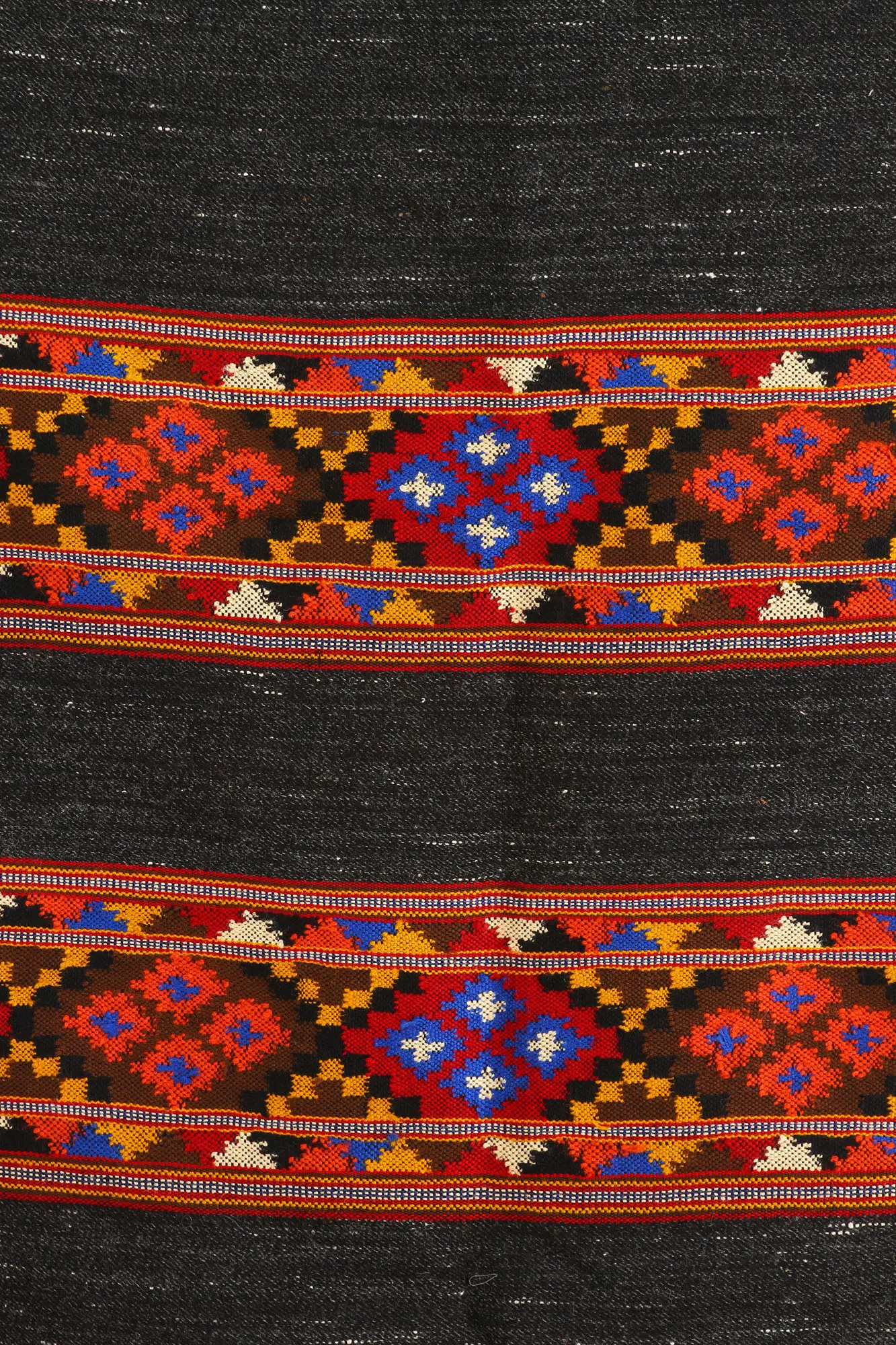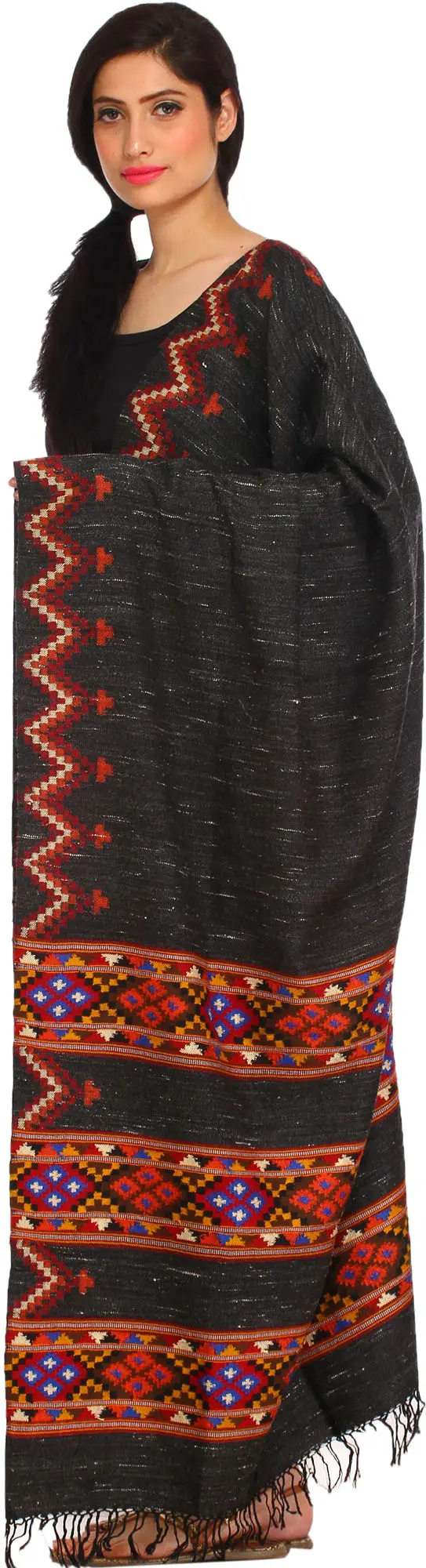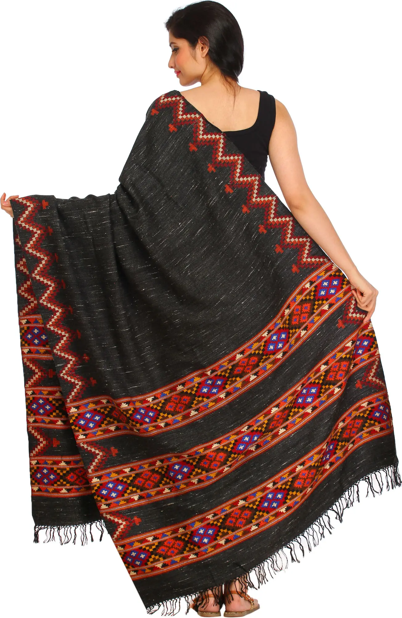 Black-Ink Yak Wool Stole from Kullu with Kinnauri Woven Border in Multicolor Thread