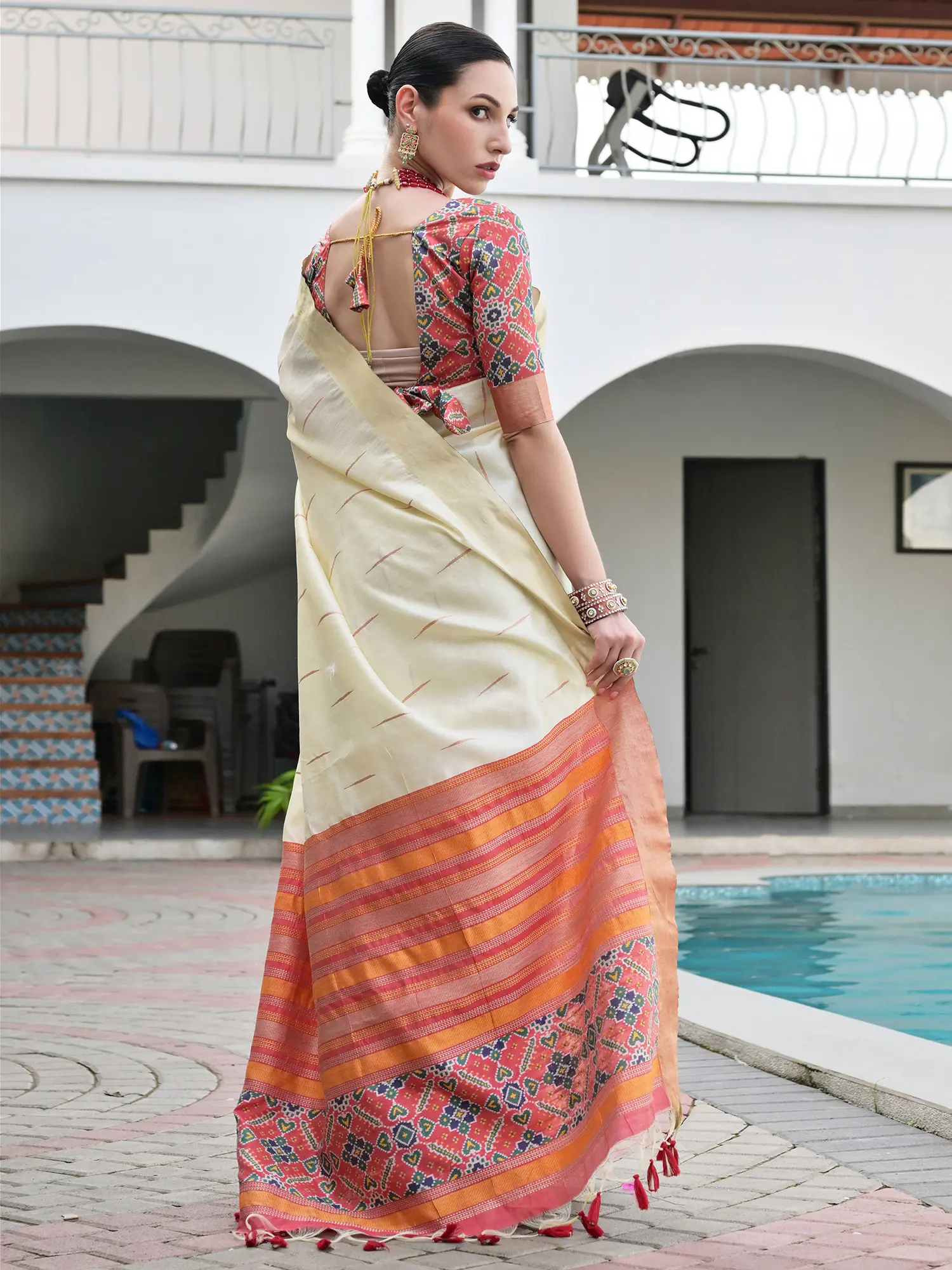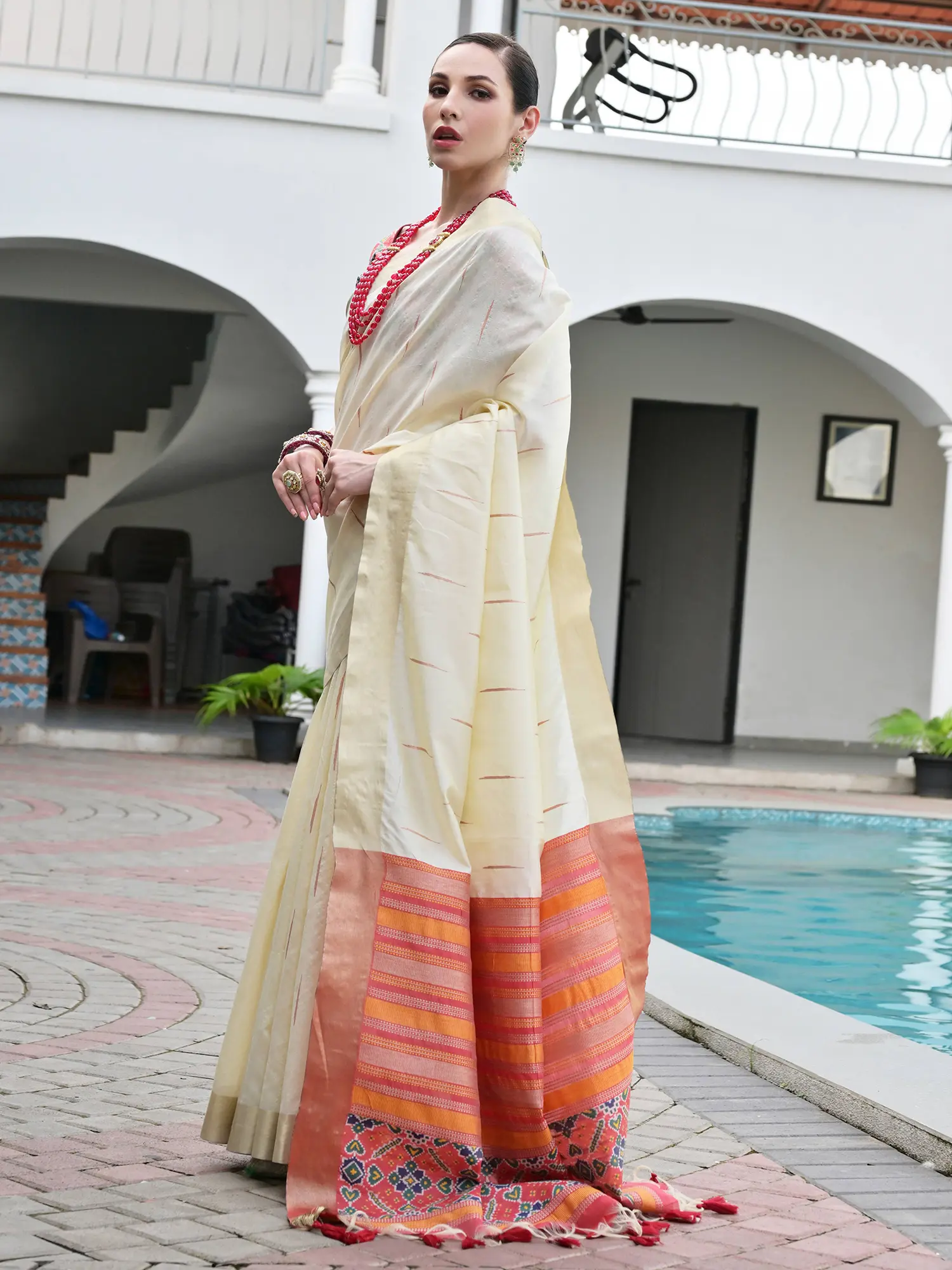 The lower part of the saree features a striking border that transitions into a vibrant display of woven patterns. Bands of warm oranges, soft pinks, and earthy tones create a dynamic stripe effect, leading the eye down to a beautifully patterned hem. Here, geometric motifs, possibly inspired by traditional Patola designs, are meticulously woven, showcasing a deep understanding of textile heritage. These intricate patterns are brought to life with pops of blues and greens, adding depth and character. The addition of delicate tassels at the hem further enhances the artisanal charm, adding a playful yet elegant touch. This saree is a testament to the enduring beauty of handwoven textiles, offering a unique blend of tradition and contemporary style.