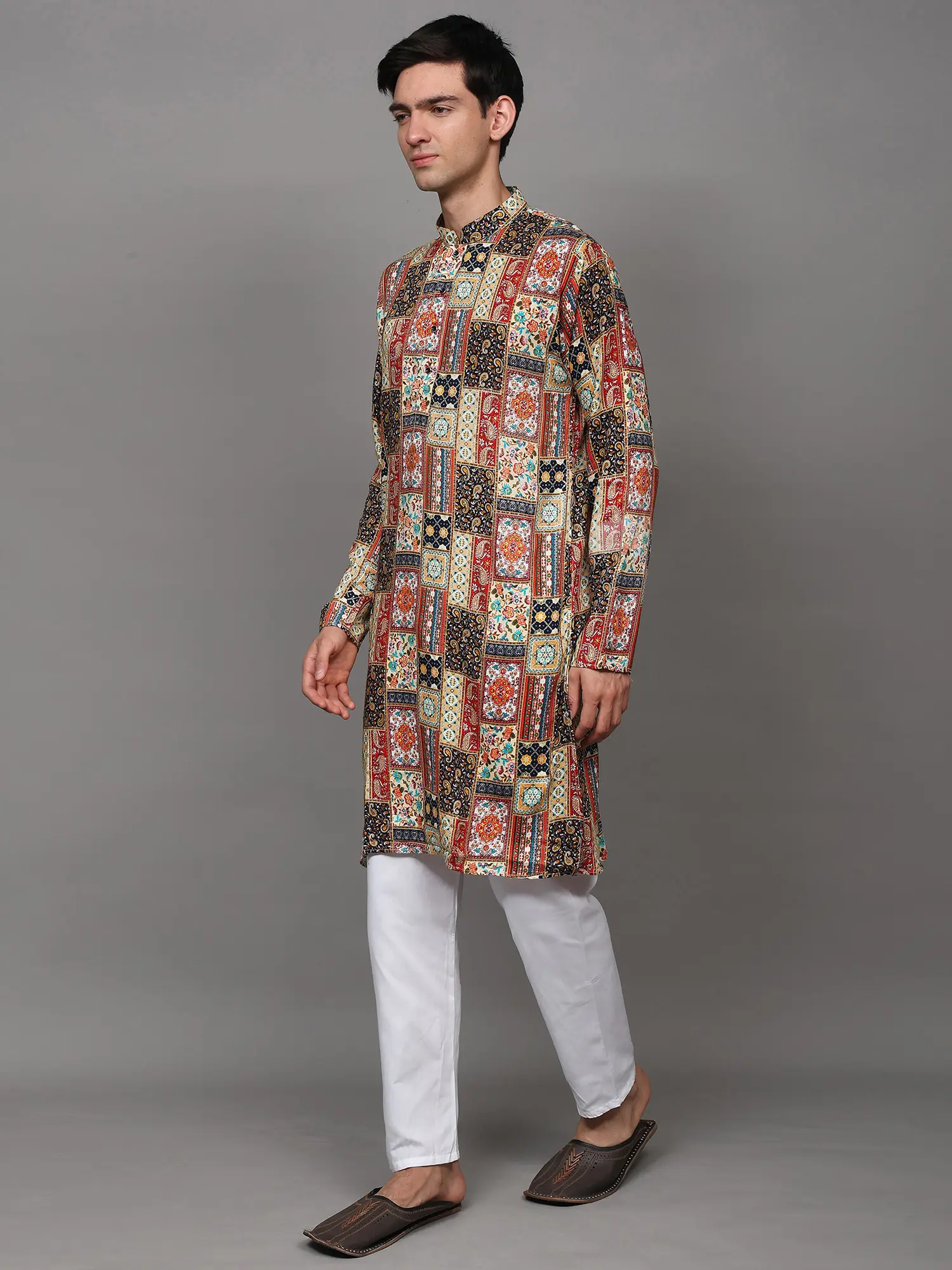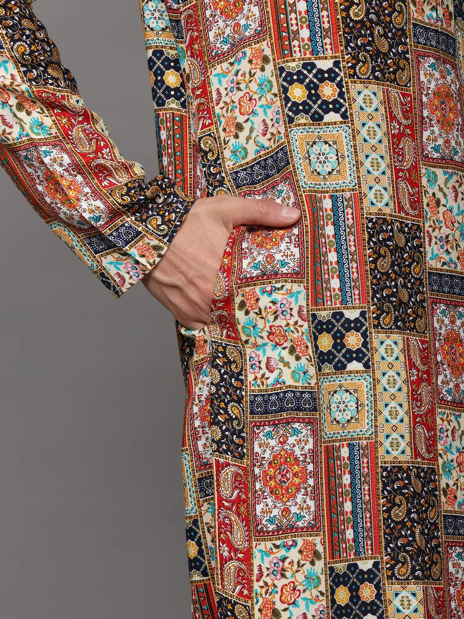 Printed Multi-Colored Kurta Pajama Set with Embroidery in Self-Colored Thread