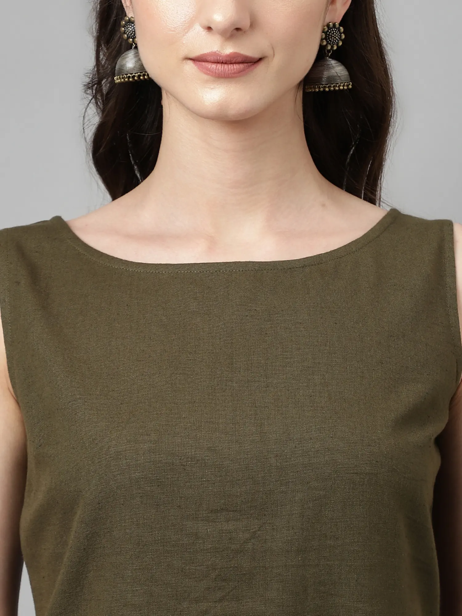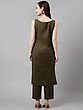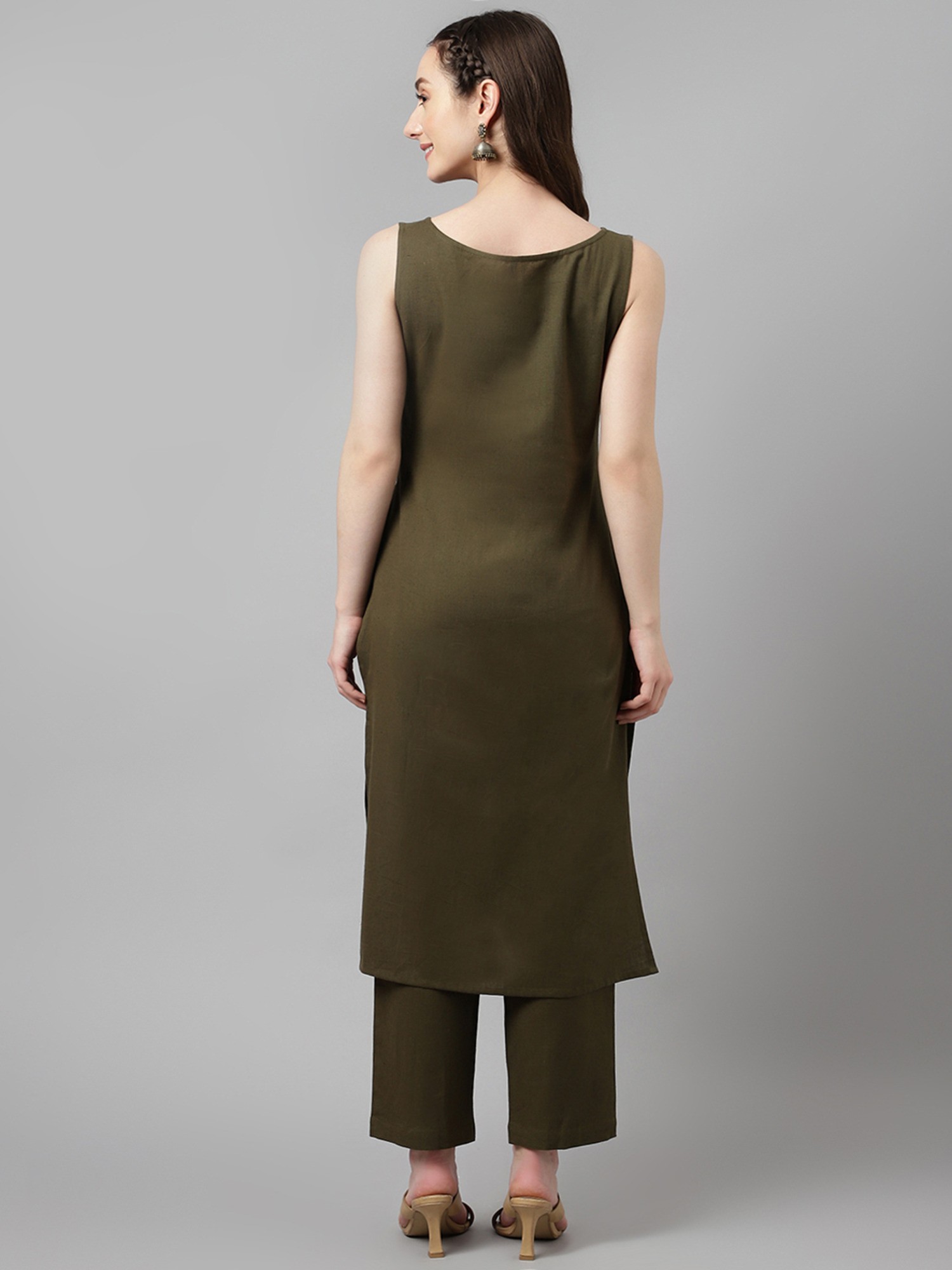 Crafted from soft and flowing rayon fabric, this kurta set drapes beautifully and feels wonderful against the skin. The kurta features a sleeveless design that is perfect for warmer weather or layering under a jacket or shawl when the temperature drops. The clean, round neckline adds a touch of classic charm, while the straight cut of the kurta provides a modern and flattering fit. Subtle side slits add ease of movement and a hint of contemporary flair. The matching straight pants complete the look, creating a streamlined and polished silhouette. The overall design is both versatile and timeless, making this set a valuable addition to any wardrobe.