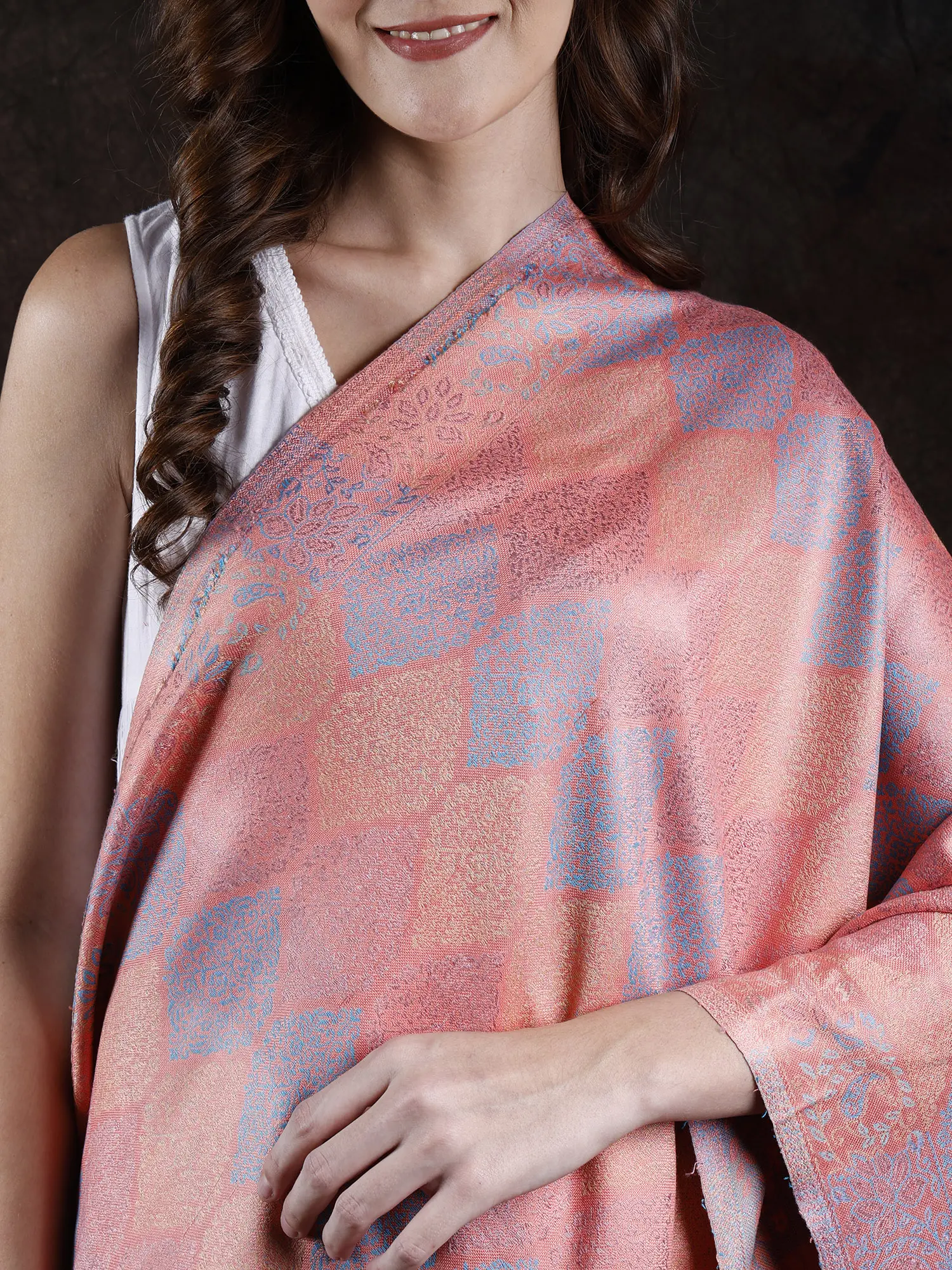 The true allure of this stole lies in its captivating woven multicolor Parsi design. Drawing inspiration from the intricate patterns and vibrant color palettes of Parsi embroidery, this stole features a symphony of geometric motifs and floral elements. The interwoven threads create a textured visual appeal, with subtle shifts in color that catch the light and reveal the depth of the craftsmanship. The geometric blocks interspersed with delicate, Parsi-inspired borders create a dynamic yet harmonious pattern that is both eye-catching and refined. This design is a celebration of cultural artistry, meticulously brought to life through skilled weaving techniques.