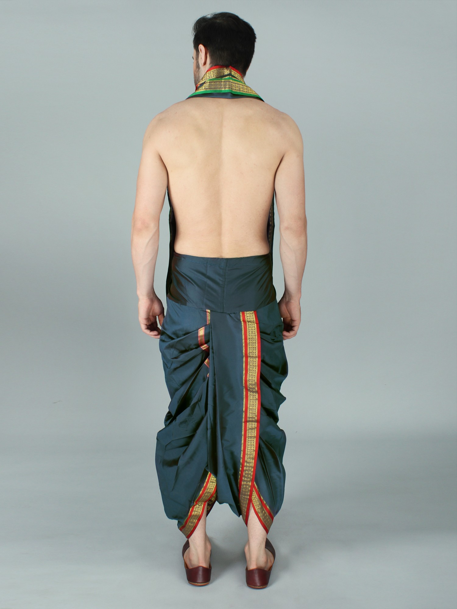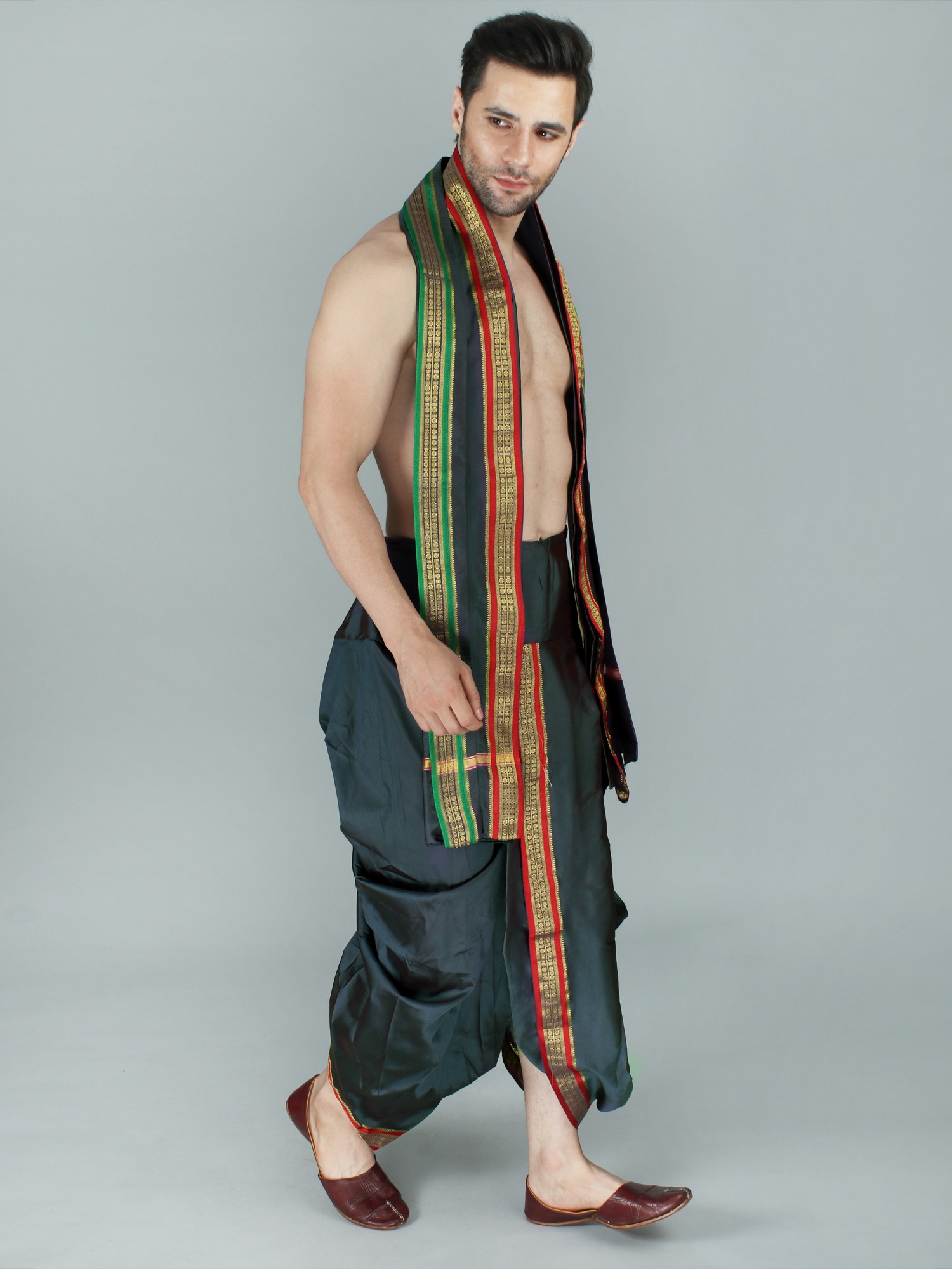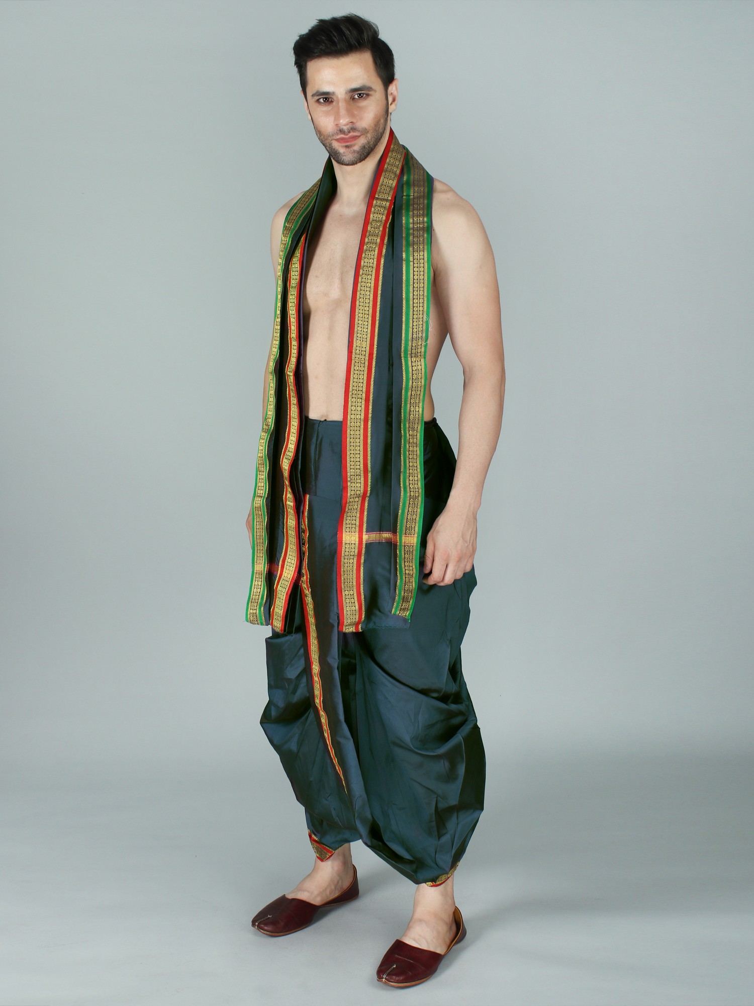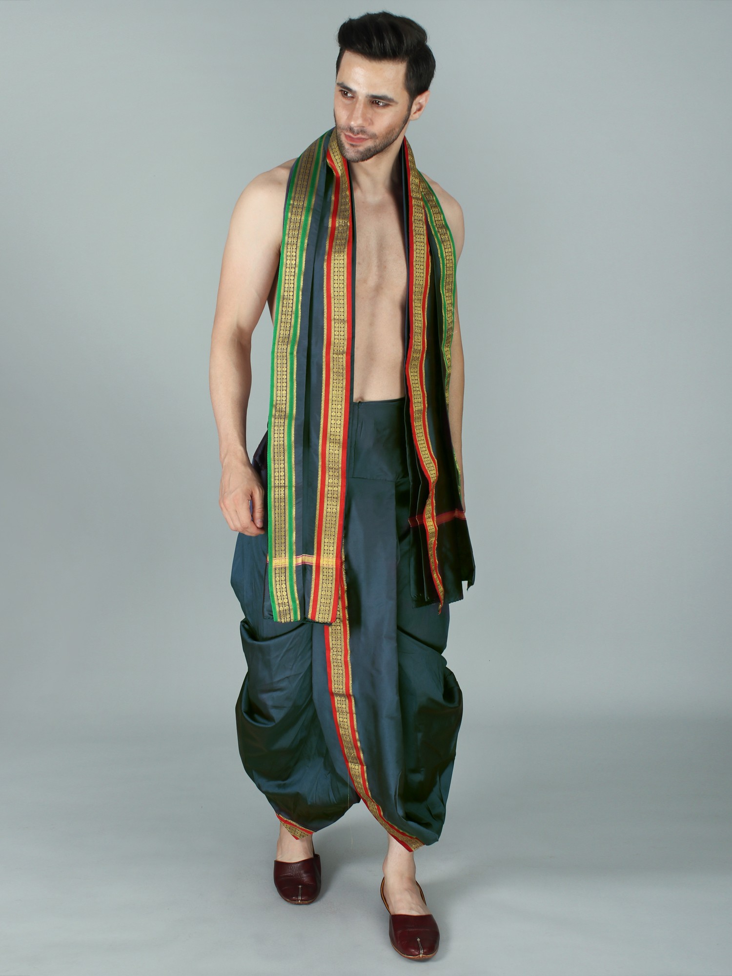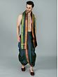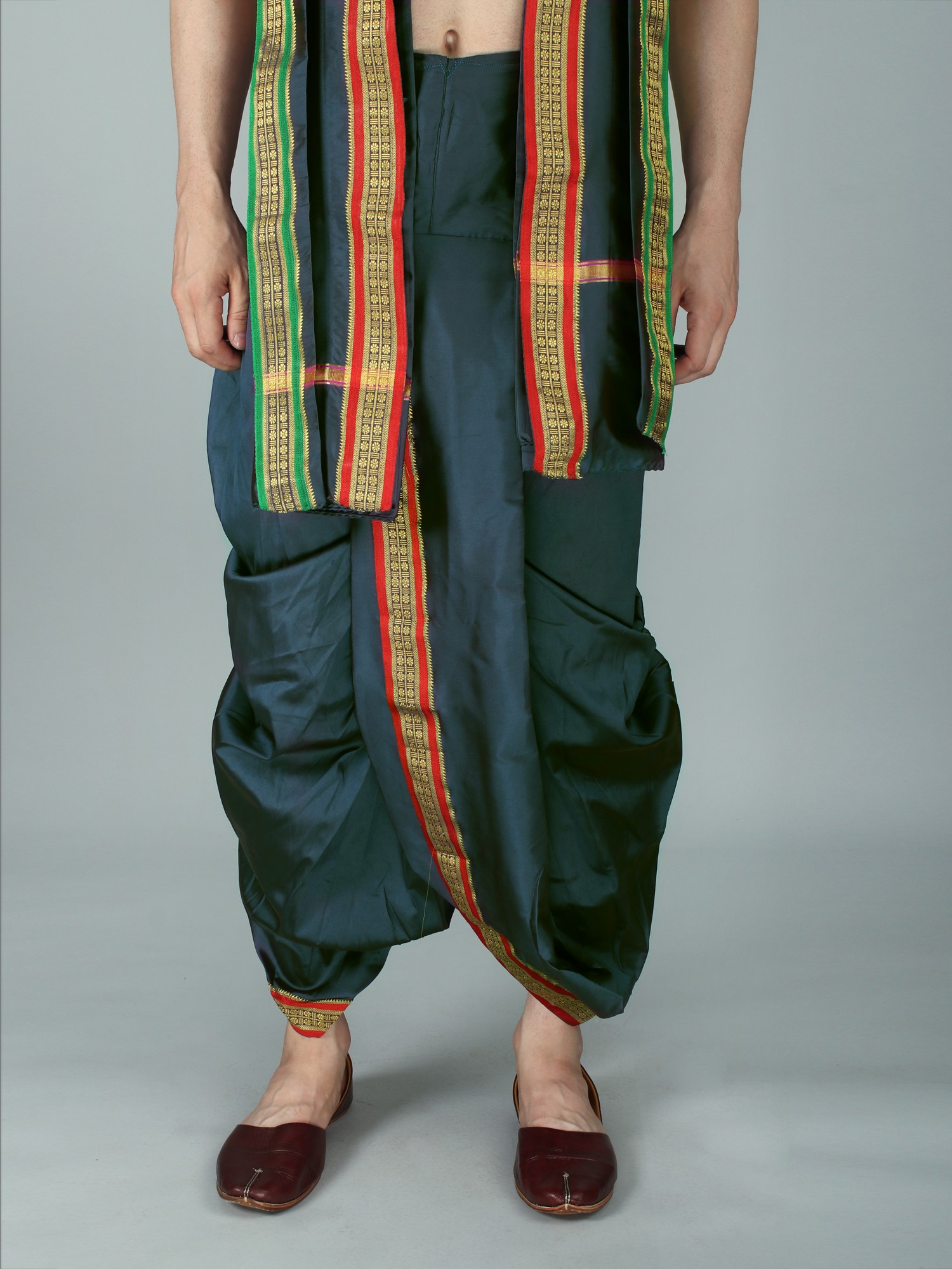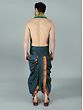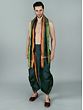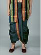 It may be tough to dress traditionally in today's fast-paced environment. It has now become a trend to integrate easy-to-wear ways for men to wear traditional apparel on special occasions. This dhoti is made of art silk, a newly created fabric, and comes in a dark green tone with a Patta design border. The delicate fabric and regal colors give the cloth a royal sheen. The elasticated waistline guarantees a snug fit and easy wear, allowing the user to move with grace and ease. This dhoti, with its easy-to-wear design and basic yet attractive appearance, is guaranteed to draw attention at special events.