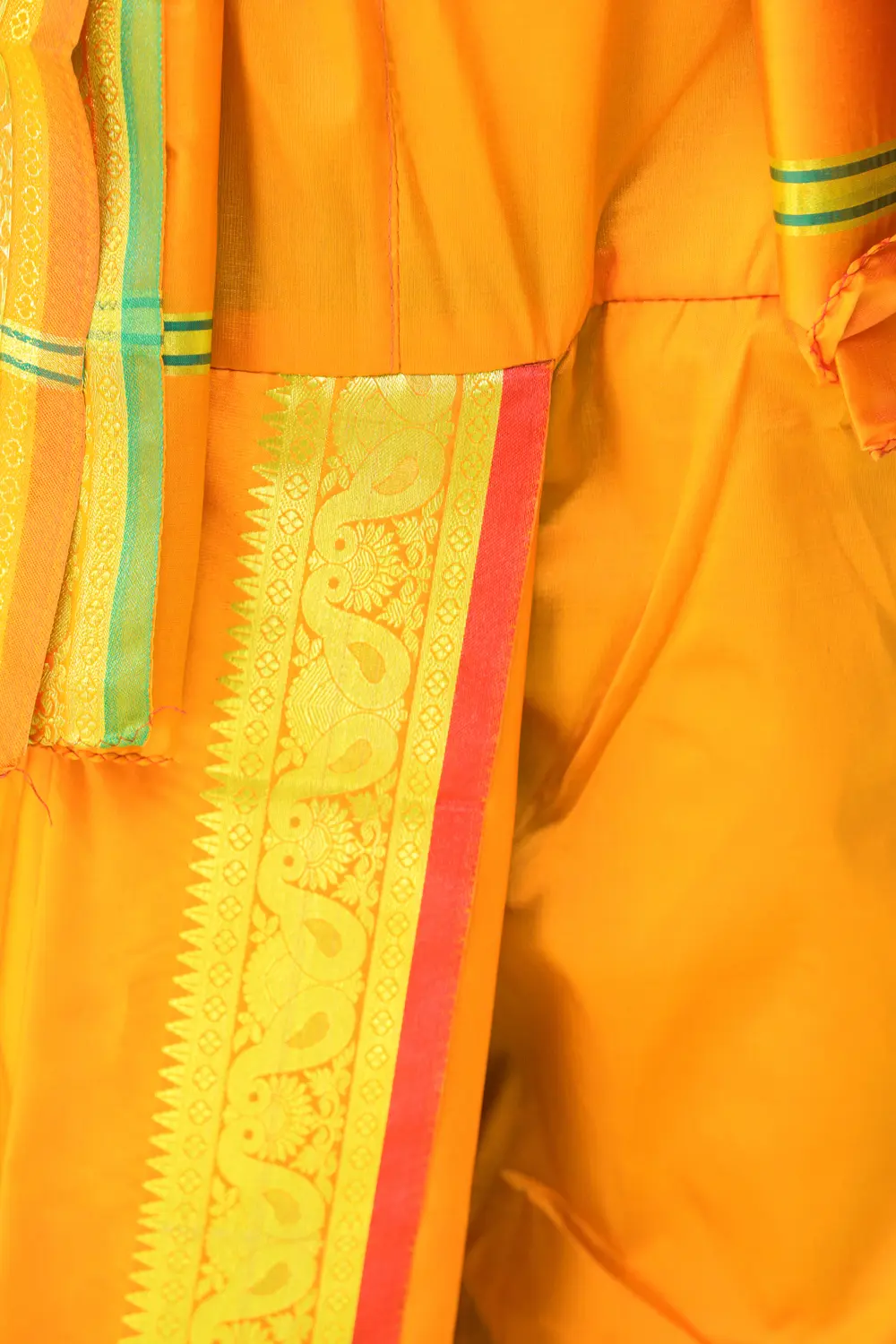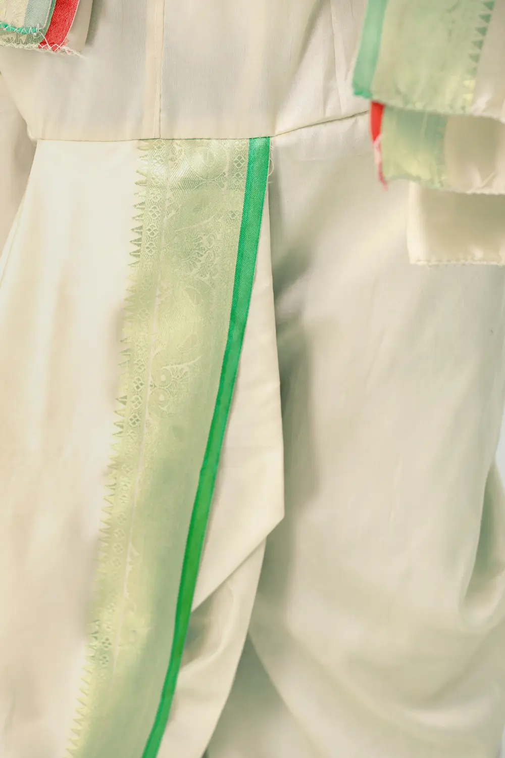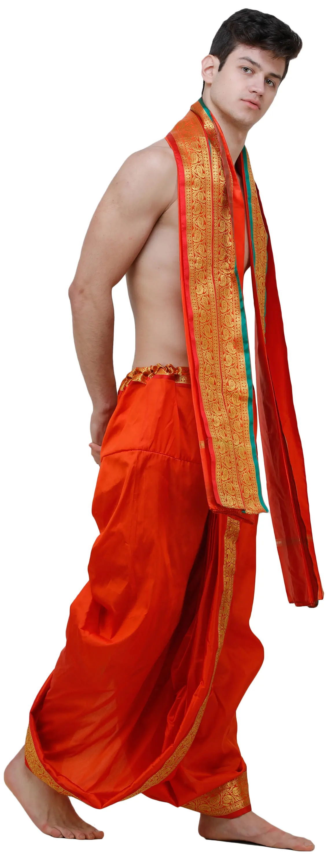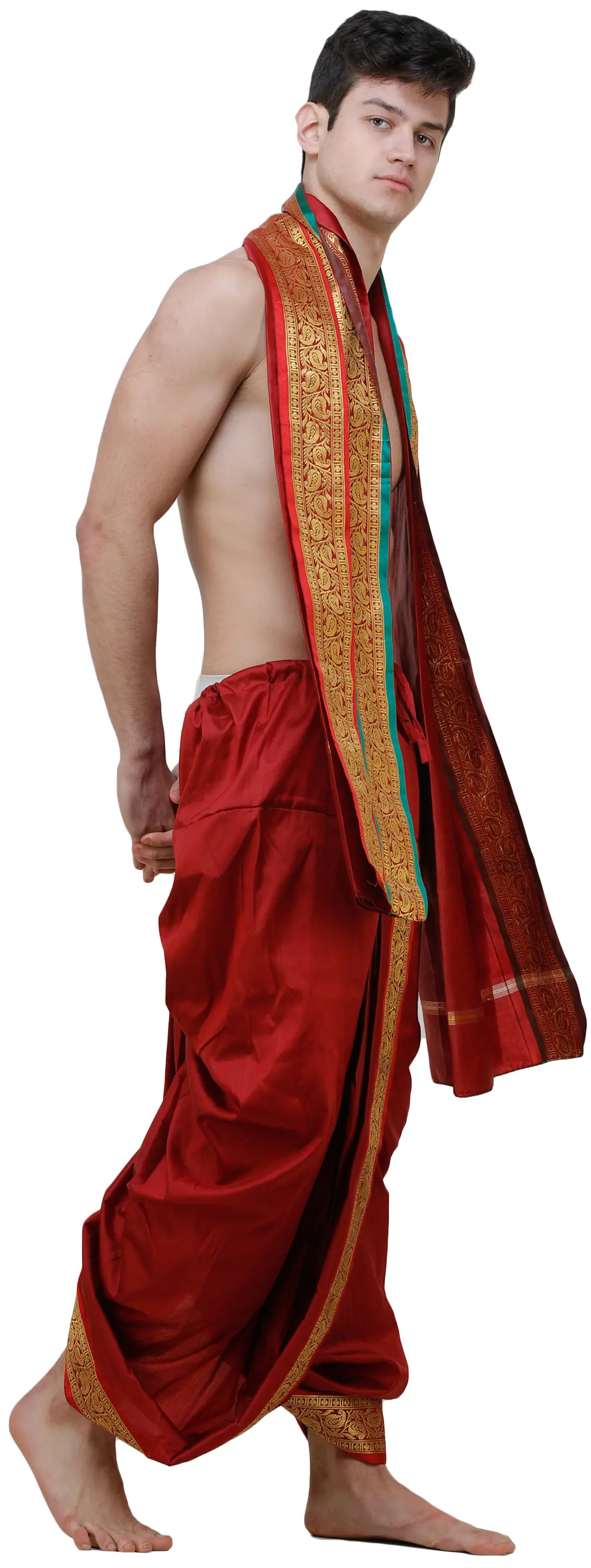 Neelam or Sapphire is a precious stone and its color is symbolic of prosperity and preferred by royals in their attire. This ready-to-wear Dhoti and Angavastram set exudes the regality of the Sapphire blue color along with the comfort of art silk fabric. This set features a woven golden leaves border, exuding opulence and charm. Paired perfectly with the matching angavastram, this ensemble promises a seamless blend of comfort and style to be exhibited during sacred occasions.