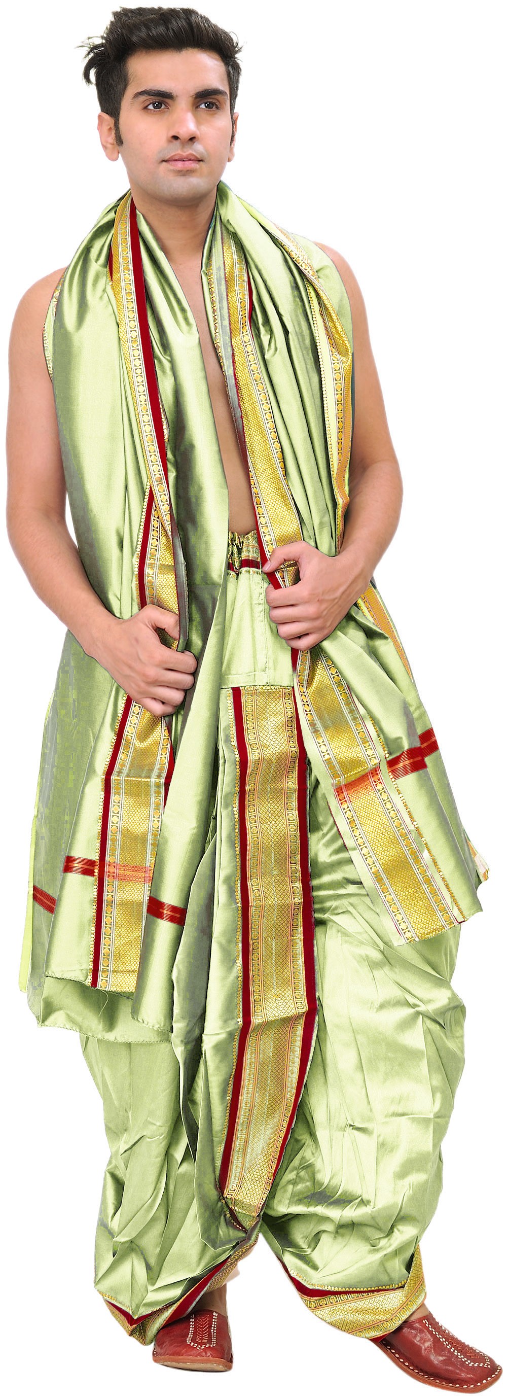 In the South Indian states men either fold their dhoti into half and tuck it at the waist reaching only to their knees which is mostly worn on informal occasions, or a full-length dhoti which is mostly plain white bearing a golden border. They wear it with an unstitched piece of cloth known as “Angavastram” draped over their shoulders. Some men wear the dhoti along with a shirt which they call a “Chokka”.