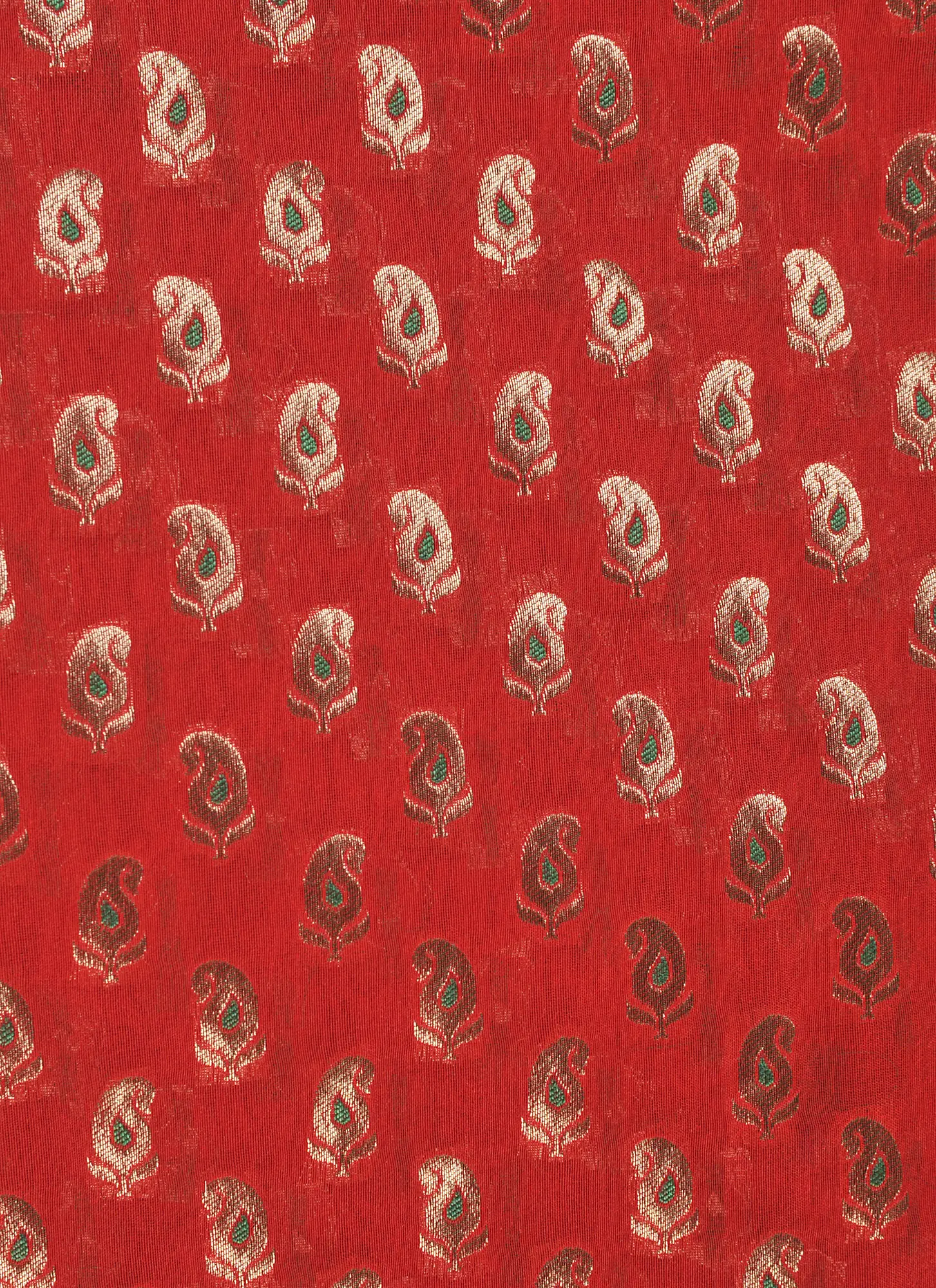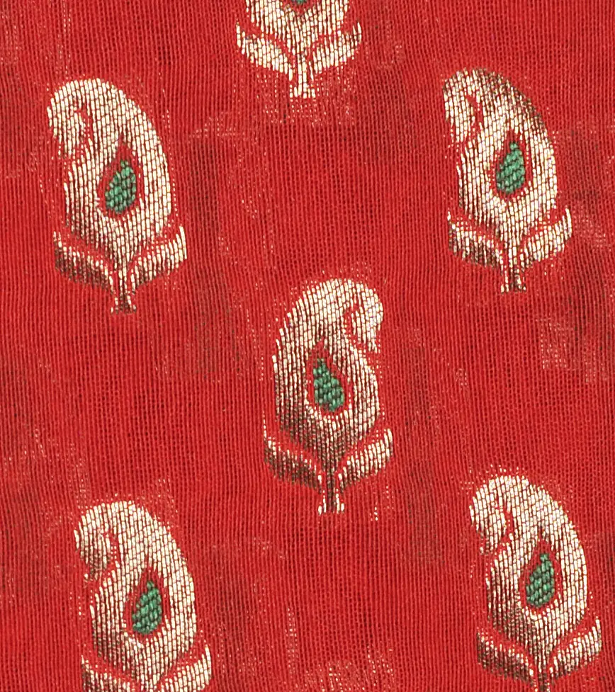 The romance of red and silk has been immortalized by Banarasi brocades. One such charming piece is this red Banarasi fabric, crafted with silk and covered in a mesh of paisley patterns all over. Paisley or aamra motif is a popular element in Indian textiles, which prefer it due to its connection with virtues of fertility, auspiciousness, and beauty.