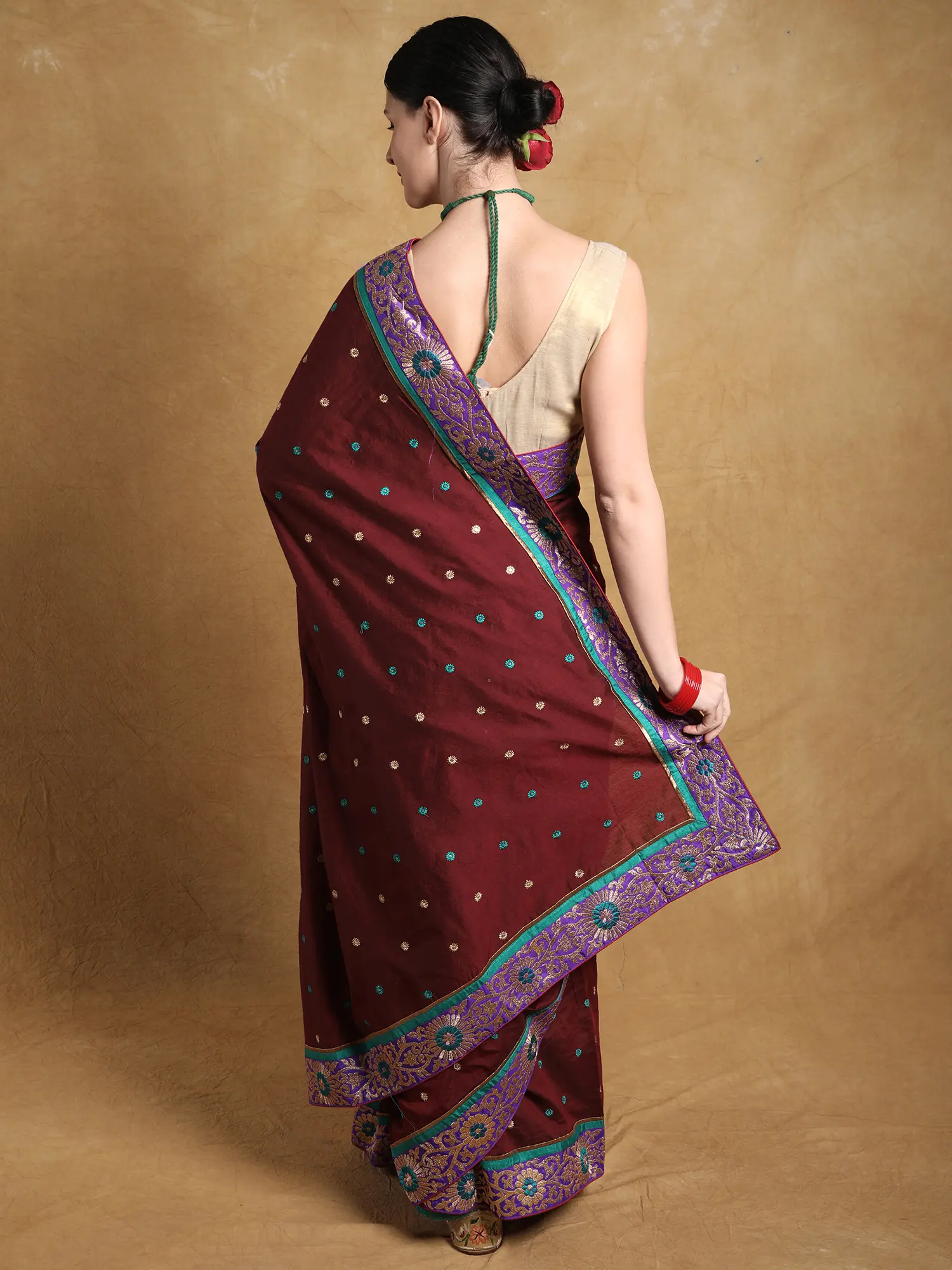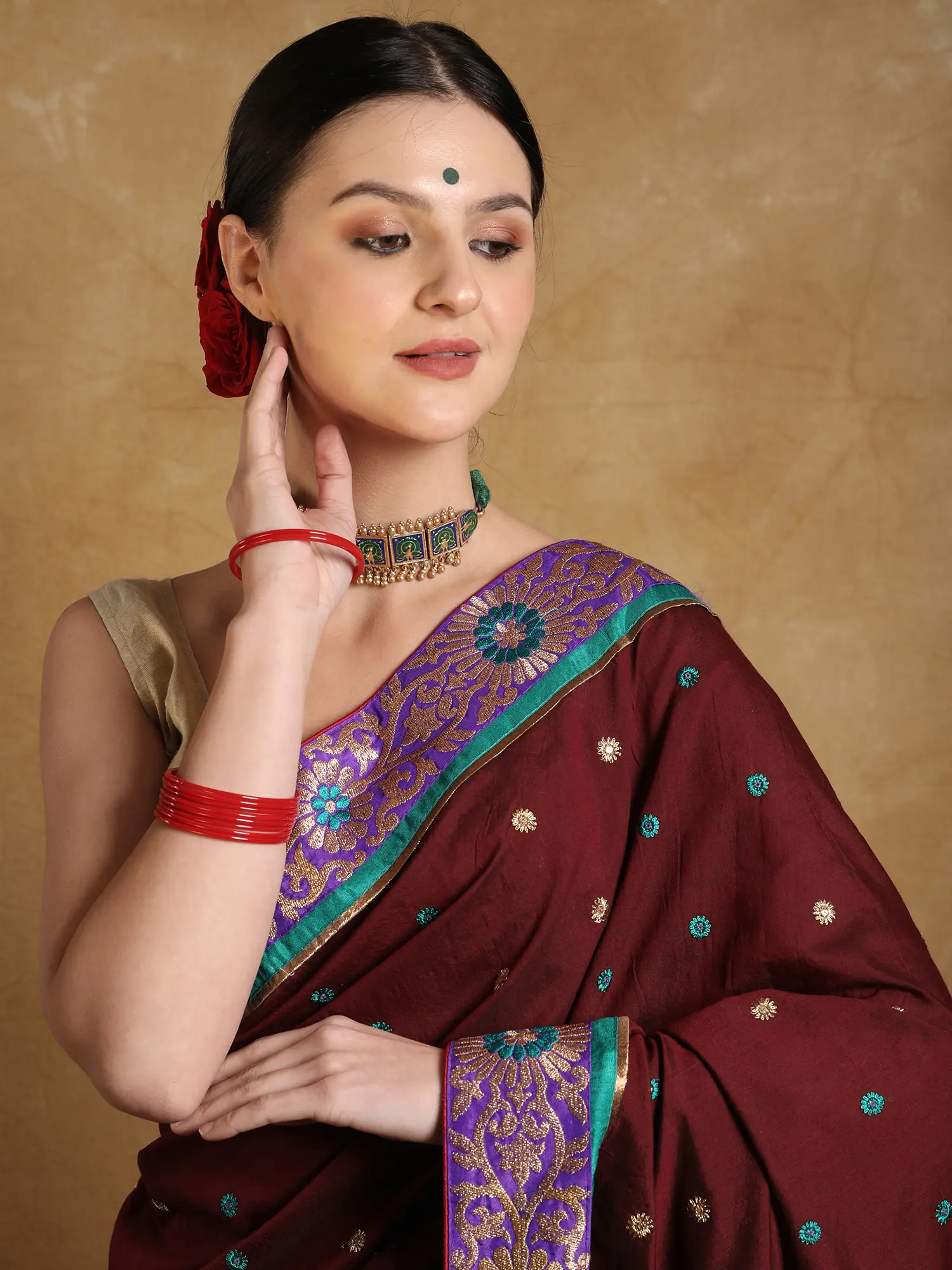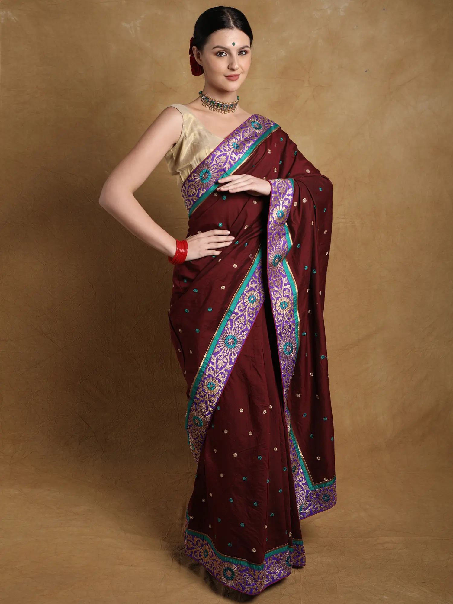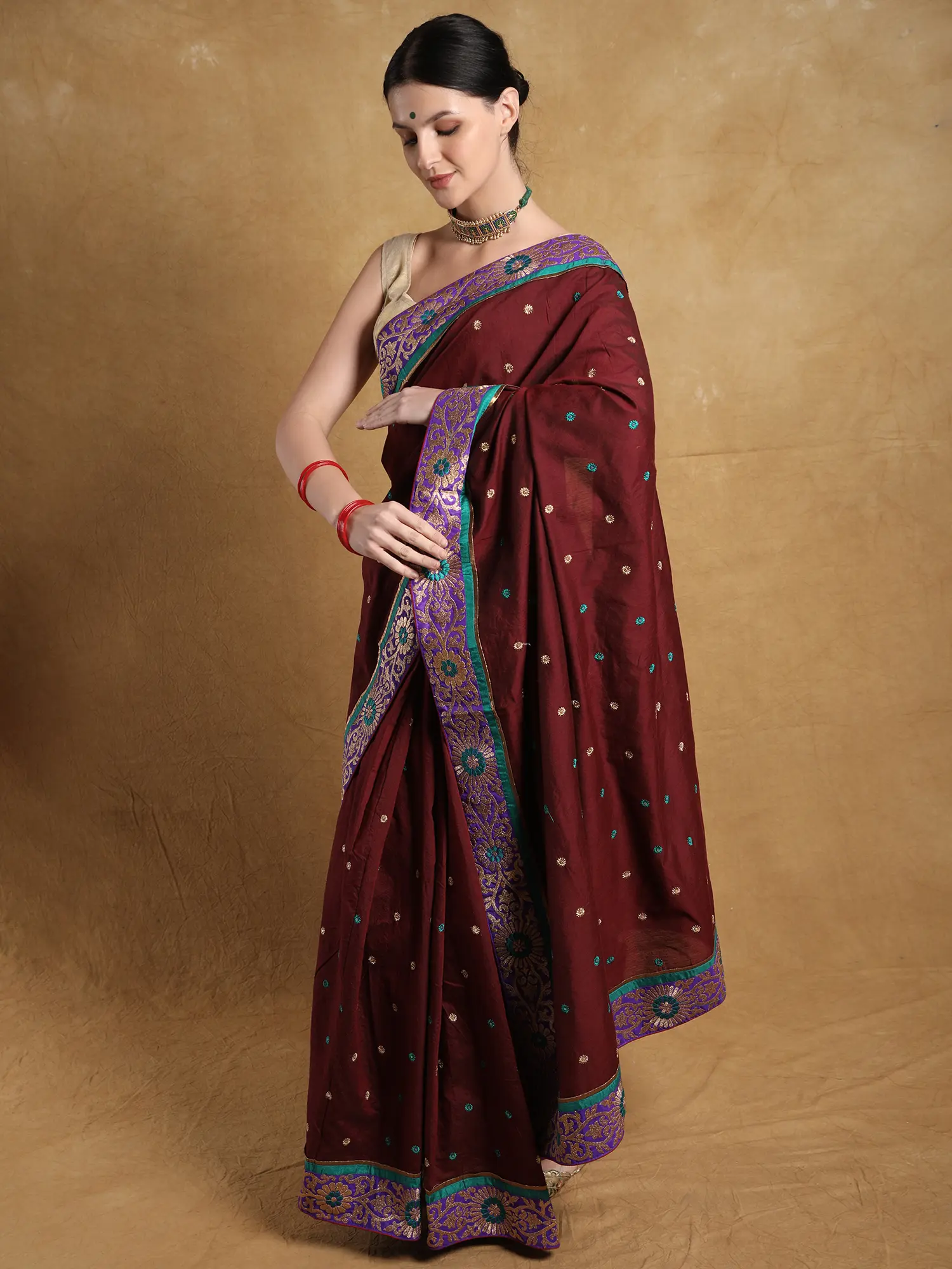 A deep shade of red, a symbol of femininity, exquisiteness, and grace, covers the soft field of this georgette saree, making it a beautiful traditional drape for festivities. The dark red of the body is contrasted by the Zari work on the border, creating the ethnic Phool bel or floral vine pattern on the patch stitched neatly to the soft base. Tiny phool butis cover the field of the saree, giving it a touch of eternal spring.