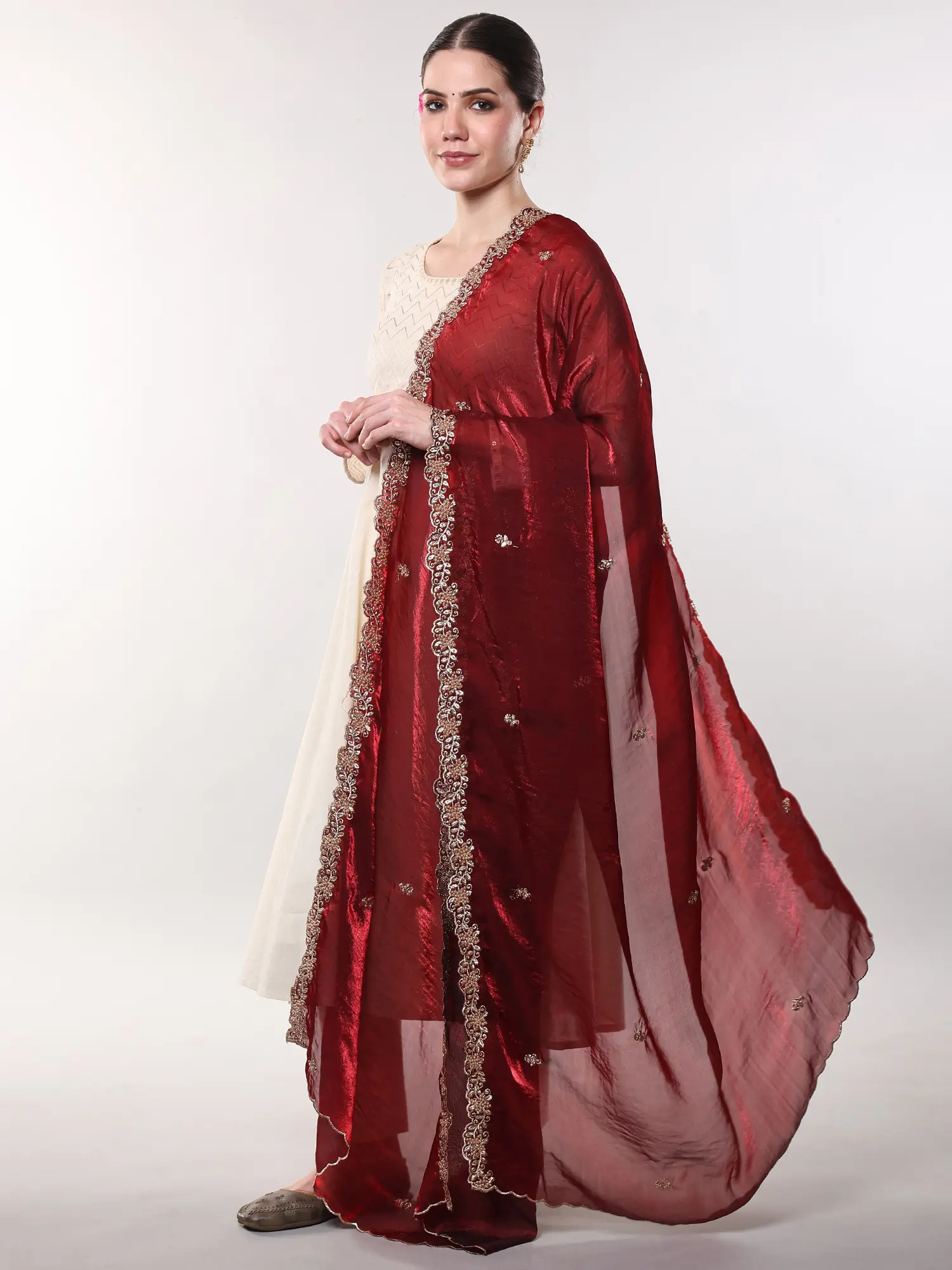 This style of adorned textile has a rich heritage, deeply rooted in cultural celebrations and royal courts. Dupattas, serving as elegant veils or decorative stoles, have long been an integral part of traditional attire, symbolizing grace and refinement. The Zari embroidery technique, using fine metallic threads, has been a hallmark of luxury for centuries, particularly associated with auspicious occasions and significant ceremonies. Owning this piece connects you to this enduring legacy of craftsmanship and aesthetic appreciation.