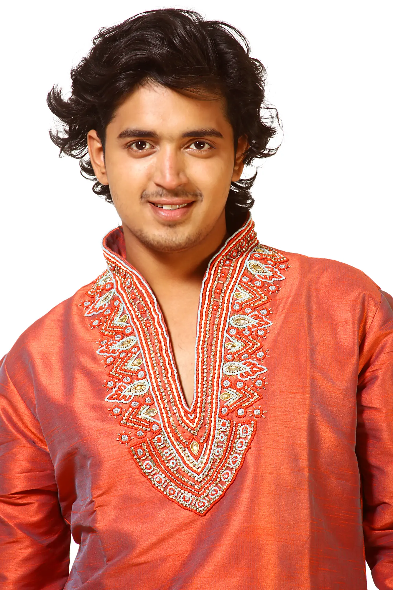 This “Redwood Designer Kurta Pajama”, is a masterpiece of elegance and tradition.  Crafted from luxurious art silk, this ensemble signifies a harmonious blend of contemporary fashion and ethnicity. Adorned with intricate crystal and faux pearls, this outfit exudes an enchanting charm. This attire captures the essence of celebration, making it ideal for special occasions and cultural festivities. It allows wearers to honor their heritage while embracing contemporary style. This ensemble is a true embodiment of cultural richness and sophistication.