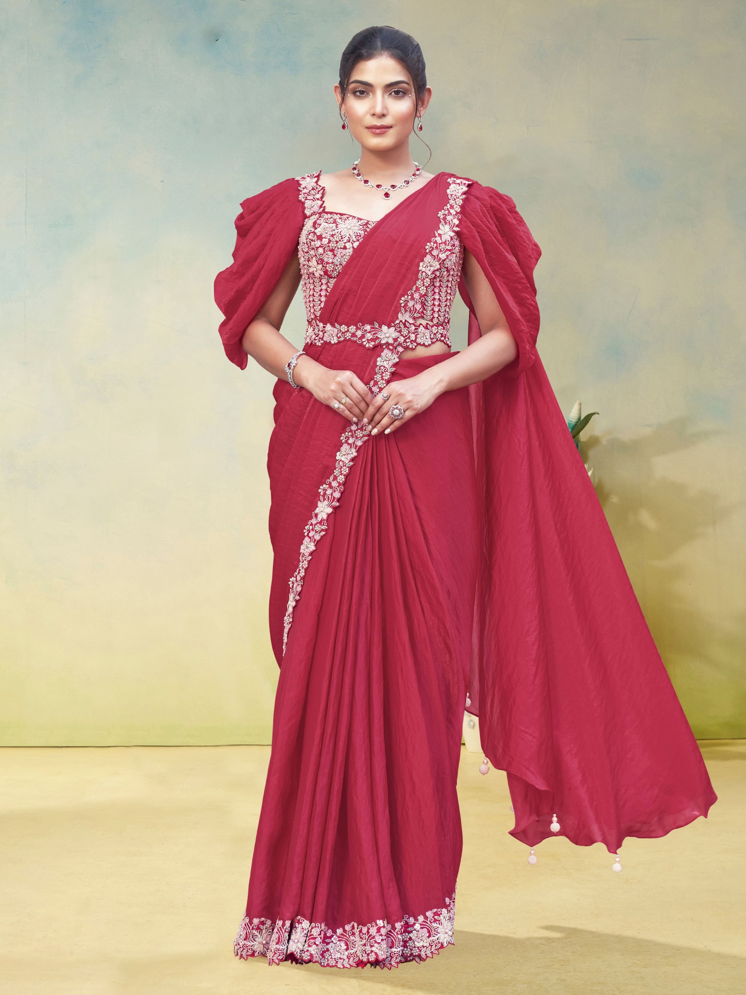 Party Wear Vichitra Silk Saree With Gold Zari Work On Border And Motifs All-Over
