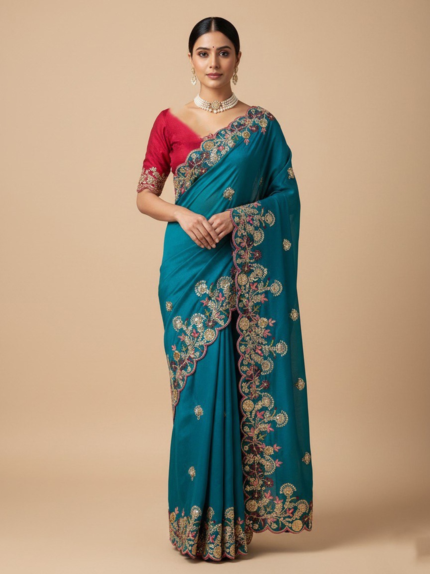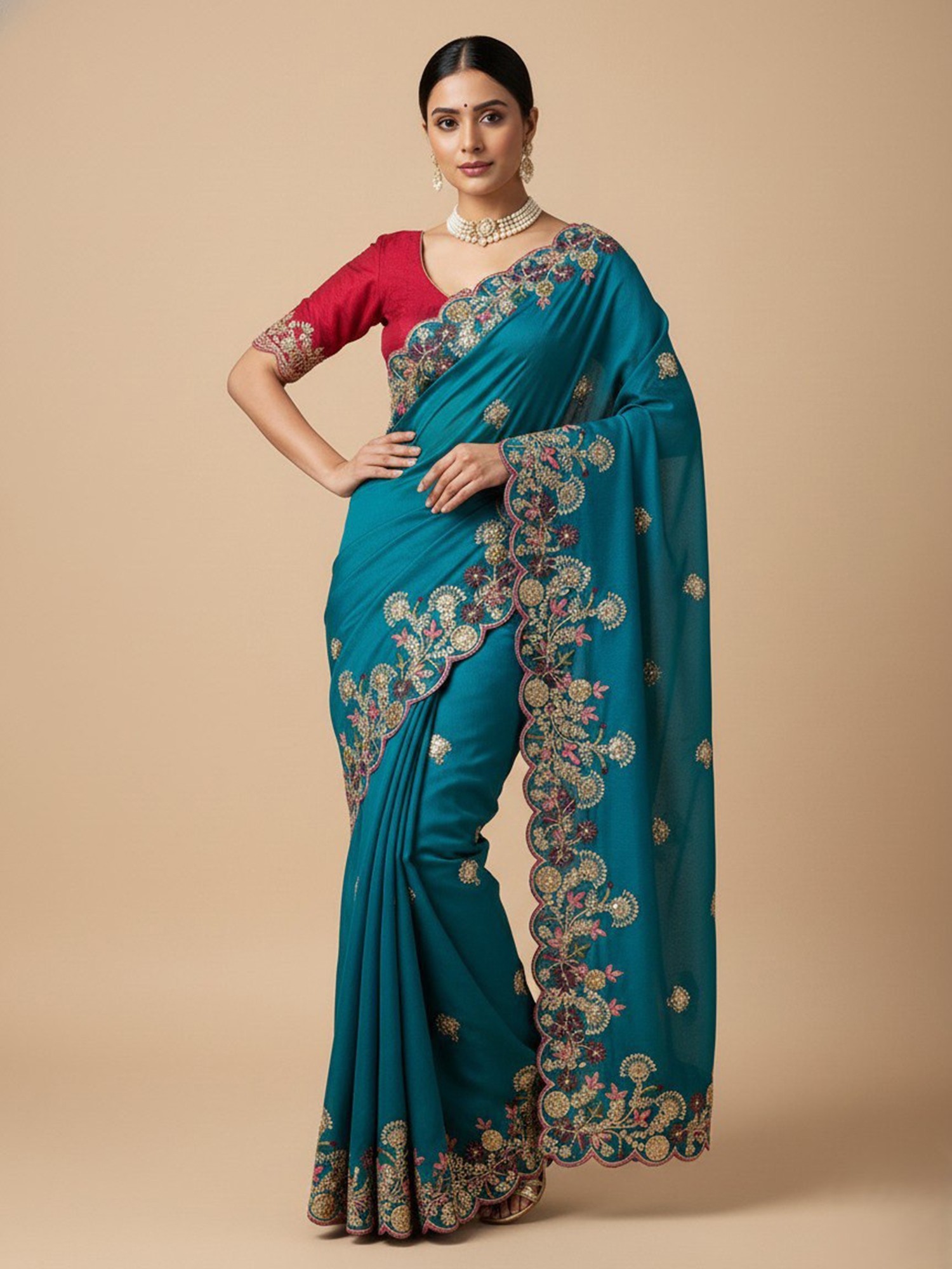 The captivating teal hue of the chiffon provides a rich canvas for the resplendent embroidery, which features a harmonious blend of gold, pink, and subtle earthy tones. This visual richness is further enhanced by the scalloped cutwork along the border, adding a delicate femininity that frames the wearer beautifully. The accompanying mono Banglori blouse, designed to complement, offers a sophisticated contrast, completing the ensemble with a touch of modern allure.