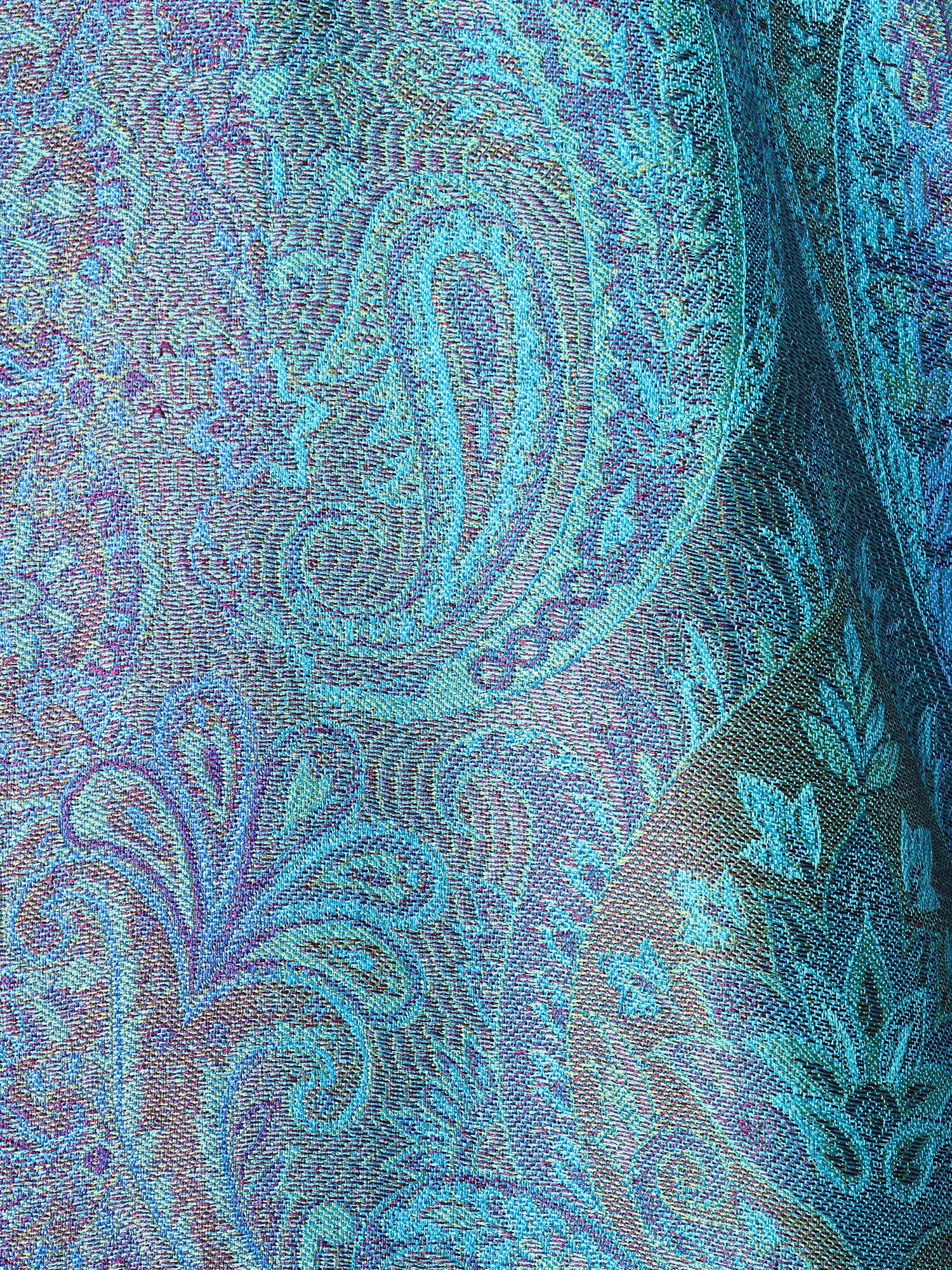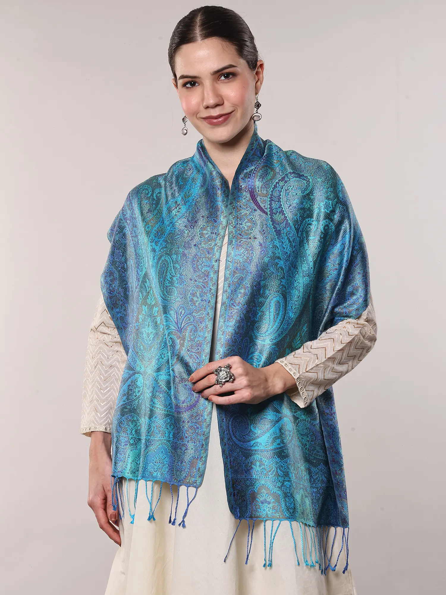 The Jamawar technique, a hallmark of Mughal-inspired textiles, is showcased with stunning precision. Each thread is meticulously woven to create a richly detailed tapestry that feels as opulent as it looks. The vibrant hues of turquoise, sapphire, and emerald blend seamlessly, evoking the depth and shimmer of the ocean or a lush forest canopy. This scarf is not merely an accessory; it's a wearable piece of art, a testament to centuries of skill and tradition. The pure silk fabric lends a weightless drape and a subtle sheen that catches the light beautifully, enhancing the intricate patterns and ensuring a comfortable, elegant feel against the skin.