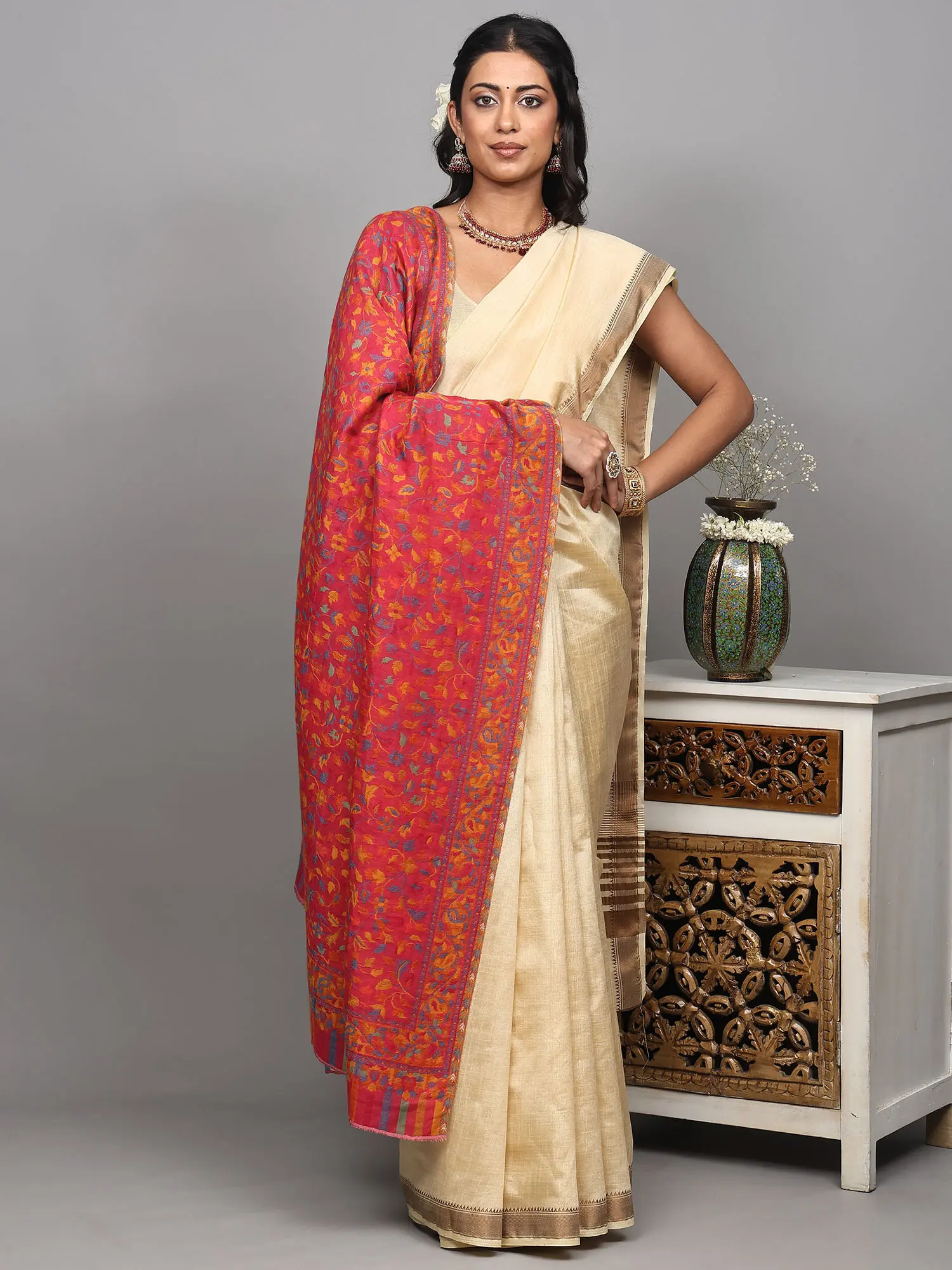 Adding to its versatility and appeal, this shawl is designed to be fully reversible. This means you can enjoy two distinct yet equally stunning looks with a single garment. The front side is adorned with the full glory of the floral jaal, while the reverse side offers a subtler interpretation of the pattern, allowing for varied styling options. The borders are a masterpiece in themselves, featuring a meticulously woven band of paisley motifs that flow seamlessly, interspersed with vibrant, multi-colored stripes that add a contemporary flair to the traditional design. This thoughtful detailing ensures that every angle of the shawl is a visual delight.