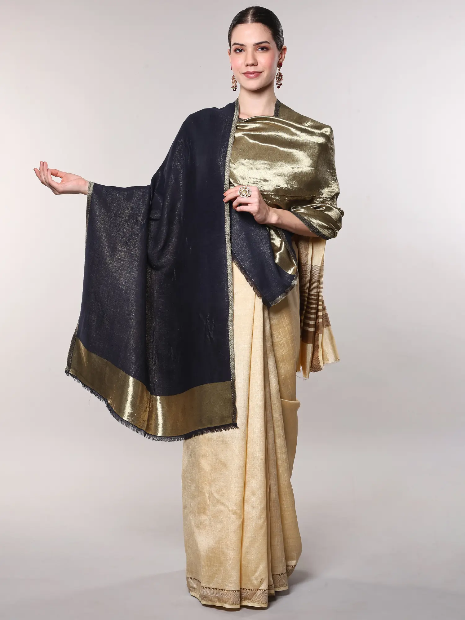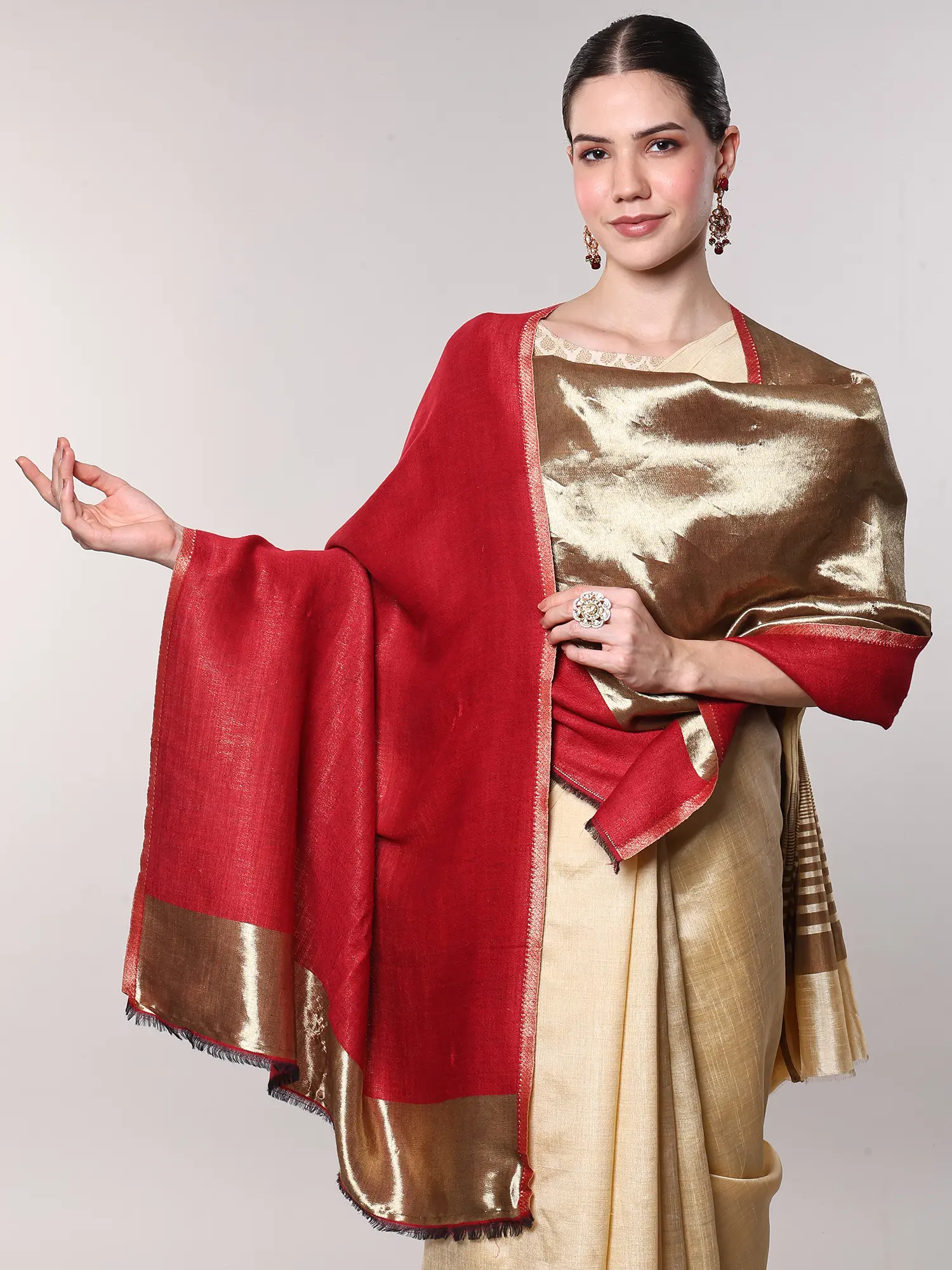 Discover a piece that embodies sophistication and heritage with this exquisite reversible stole, a testament to the artistry of Amritsar. Crafted from a luxurious blend of wool and Zari, this stole offers unparalleled versatility and a touch of opulent shimmer. The deep, rich hue of the primary fabric is beautifully contrasted by a striking border, woven with fine Zari threads that catch the light with every movement, adding a subtle yet captivating sheen.
