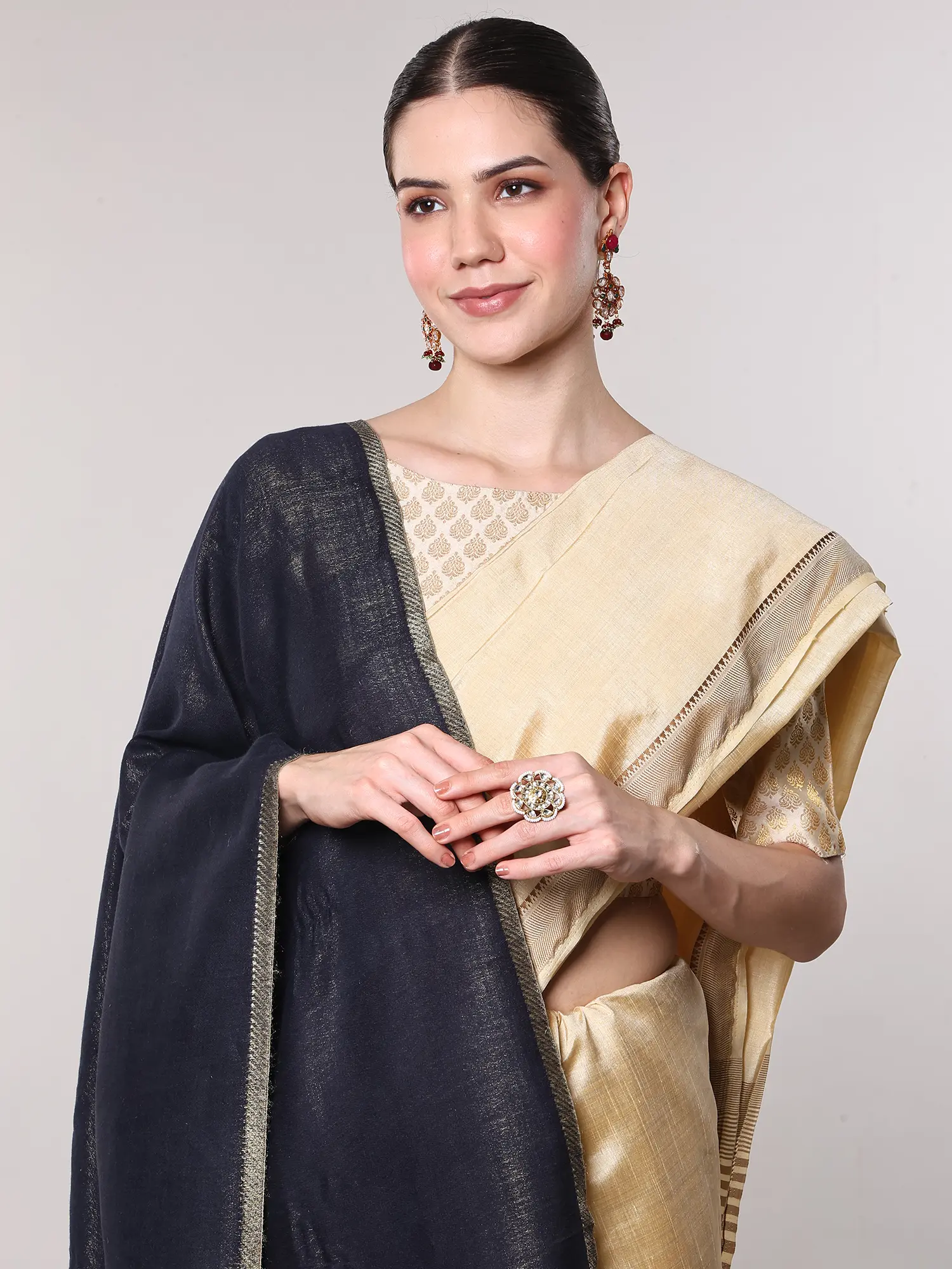 The unique weave of this stole creates a subtle texture that is both visually appealing and pleasing to the touch. The Zari work, traditionally renowned for its intricate patterns and metallic luster, is here presented in a refined manner, adorning the edges of the stole to create a sophisticated frame. This detail elevates the stole from a mere accessory to a statement piece, capable of transforming any outfit with its understated glamour. The reversibility of the stole means you get two distinct yet harmonious looks, further enhancing its value and wearability.